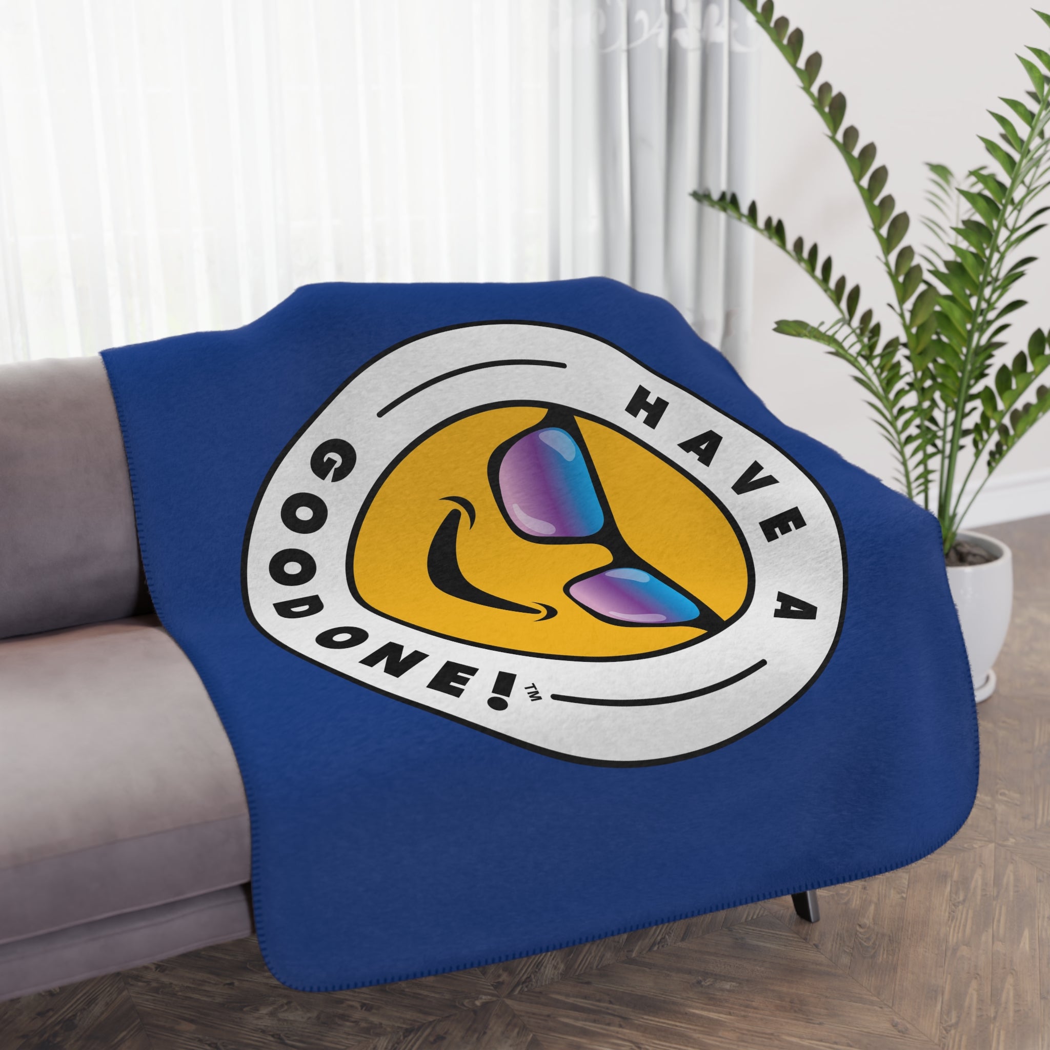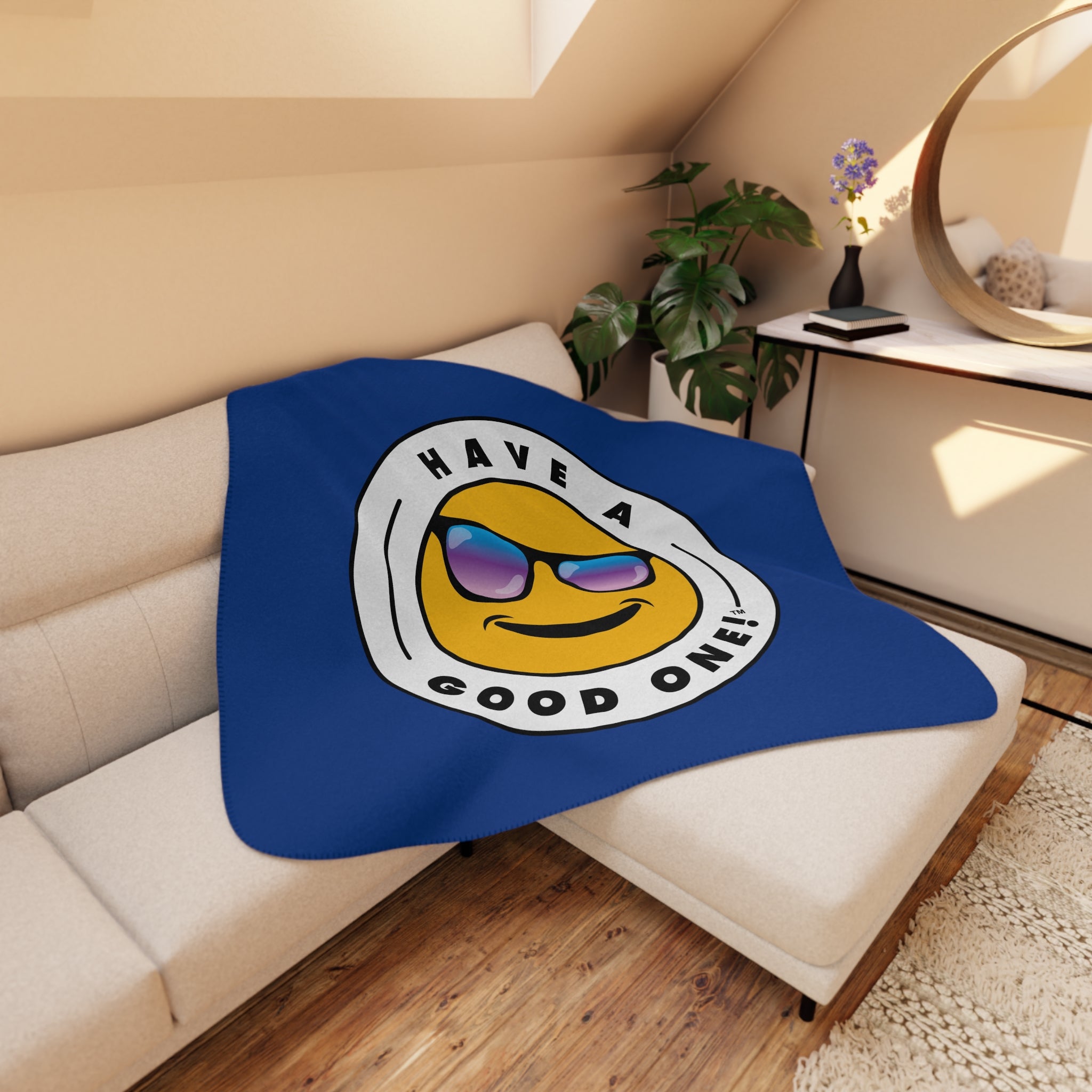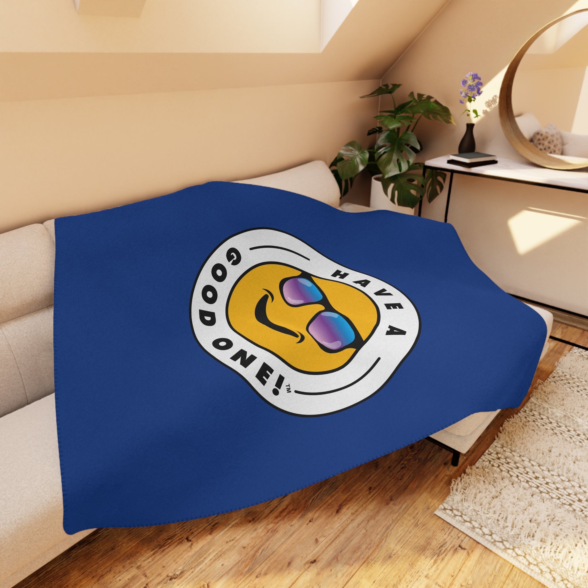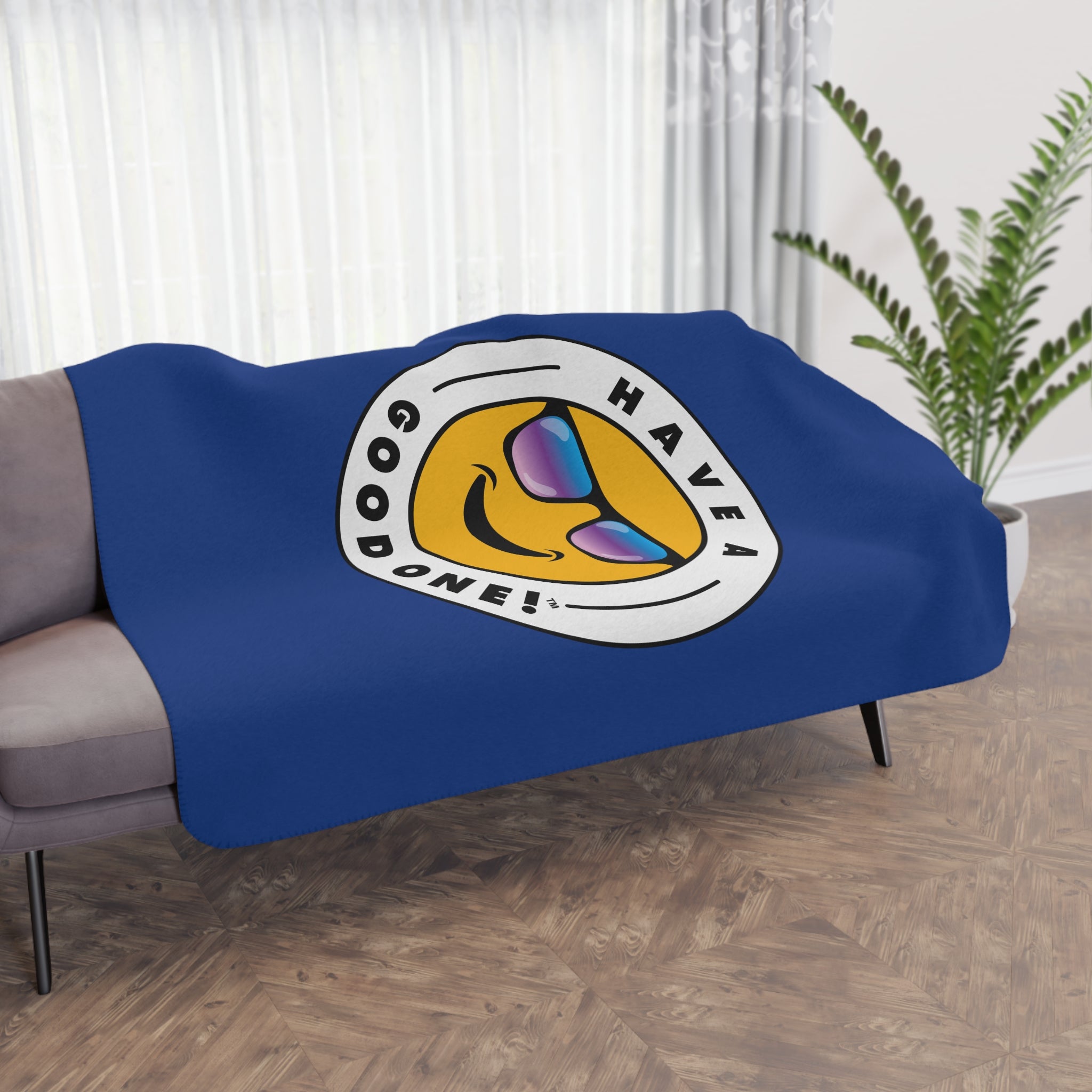Sherpa Plush Blanket – Dark Blue Color With Blue Purple Green Have A Good One! Logo