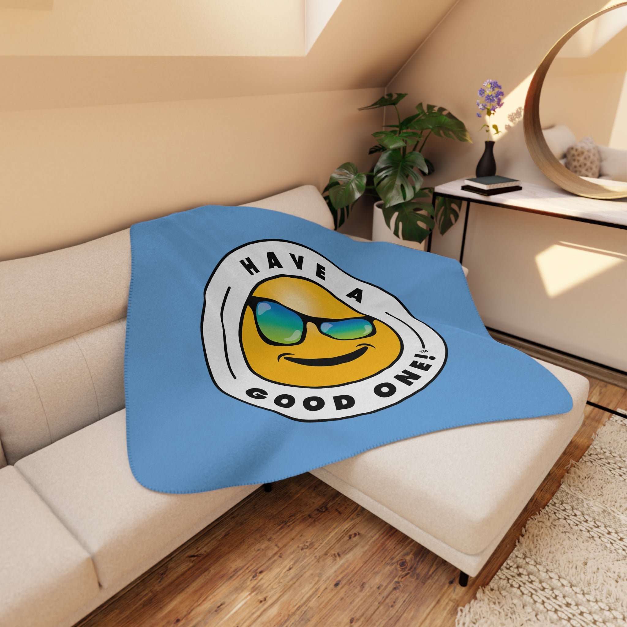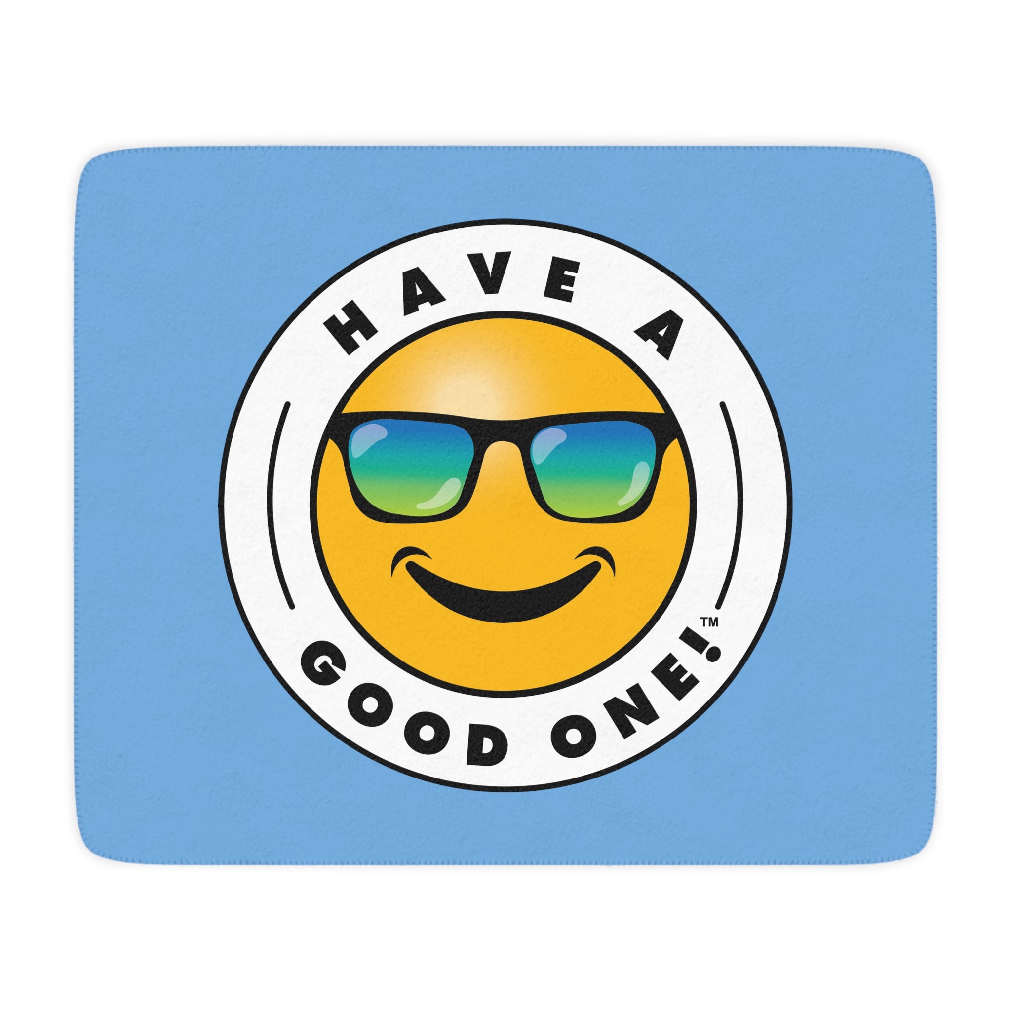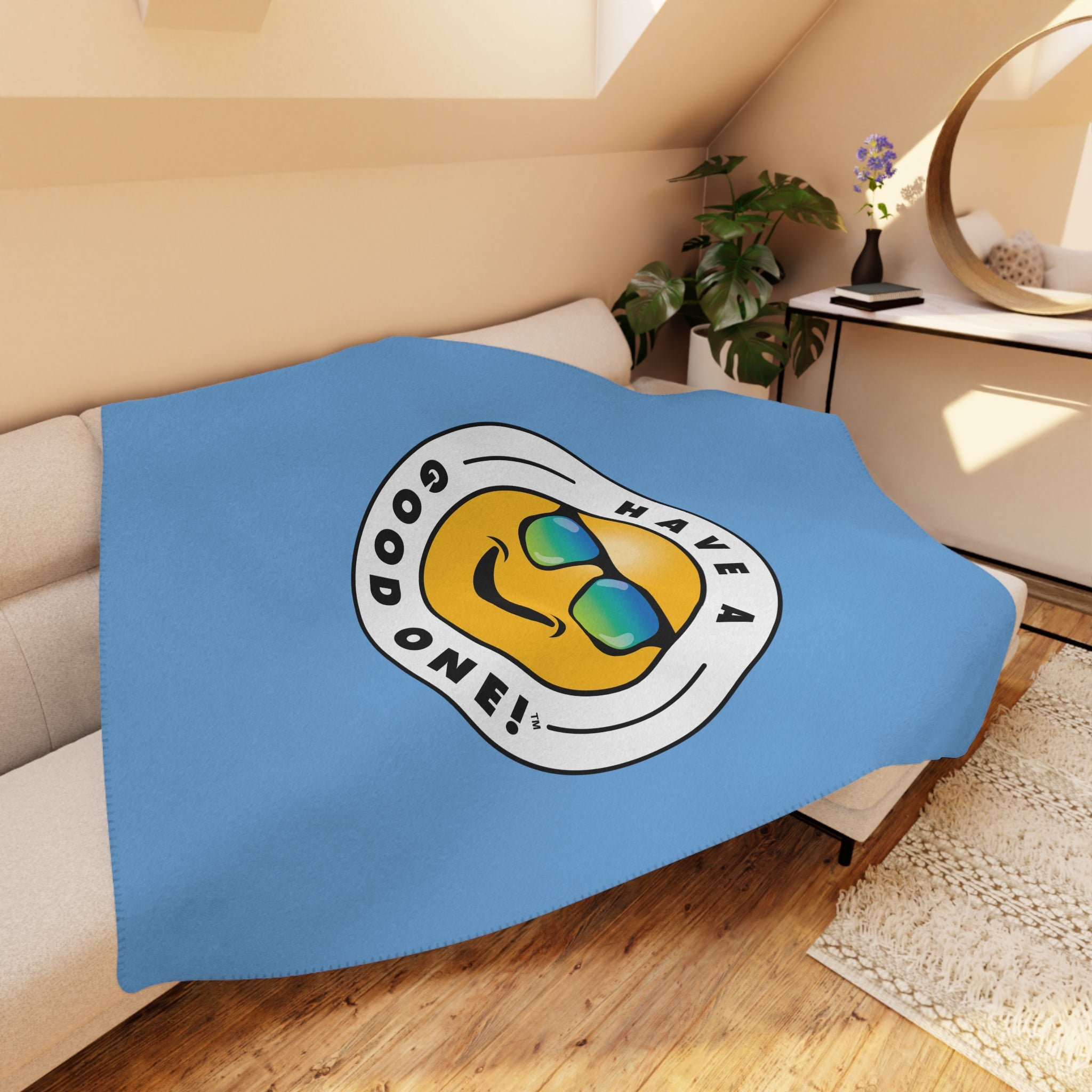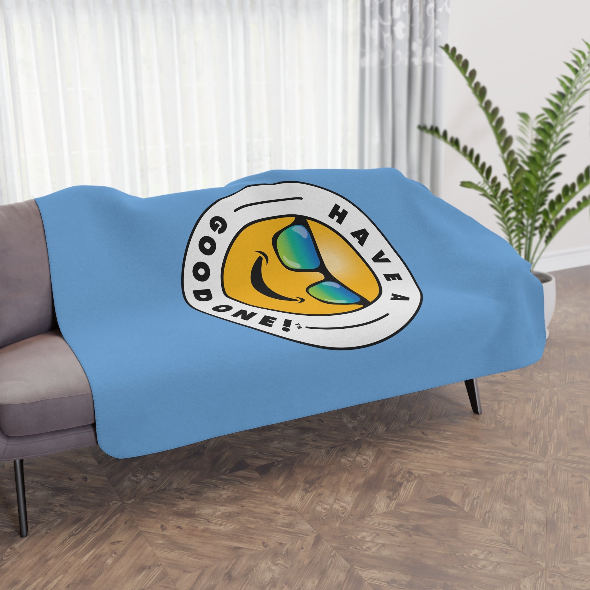 Sherpa Plush Blanket – Light Blue Color With Blue Green Have A Good One! Logo