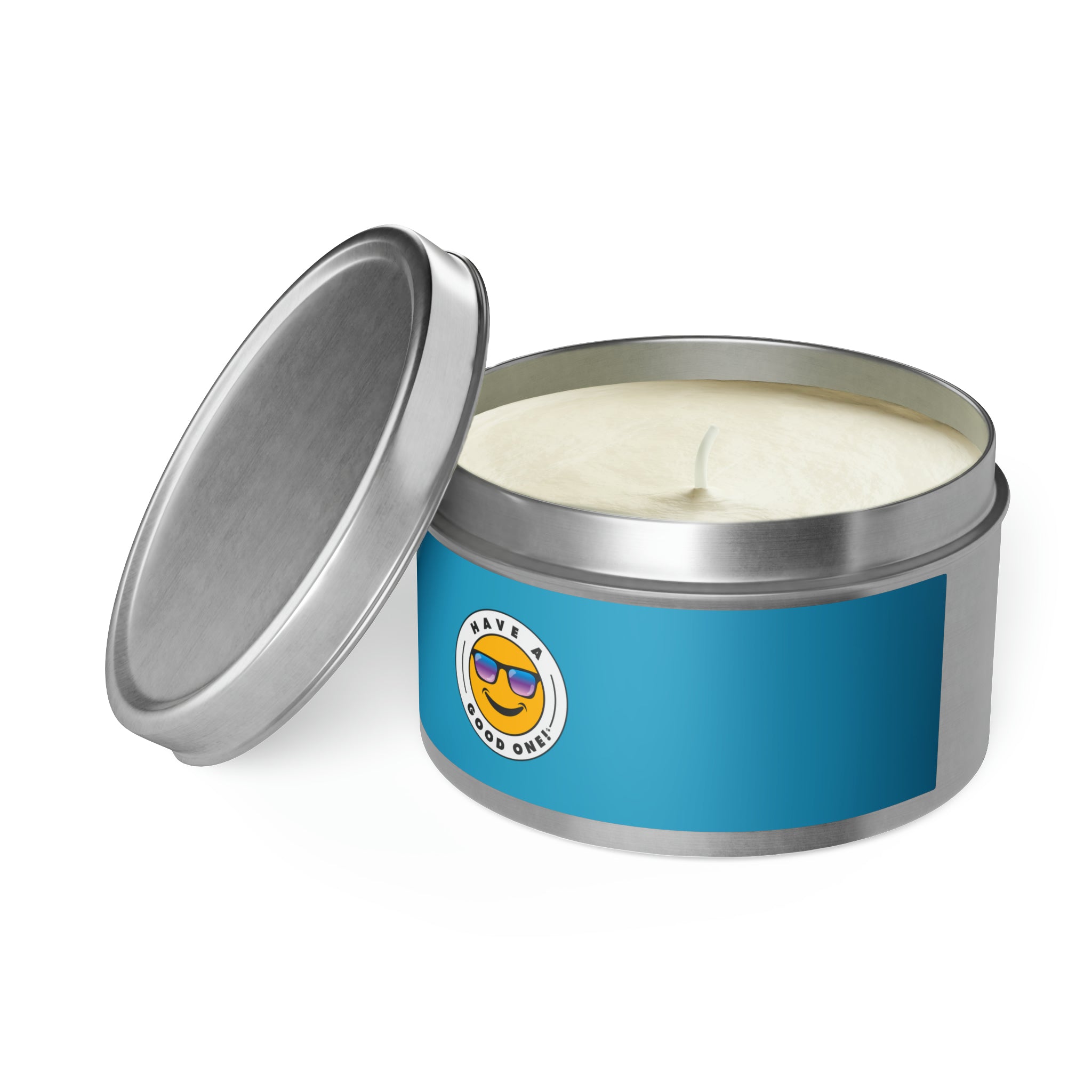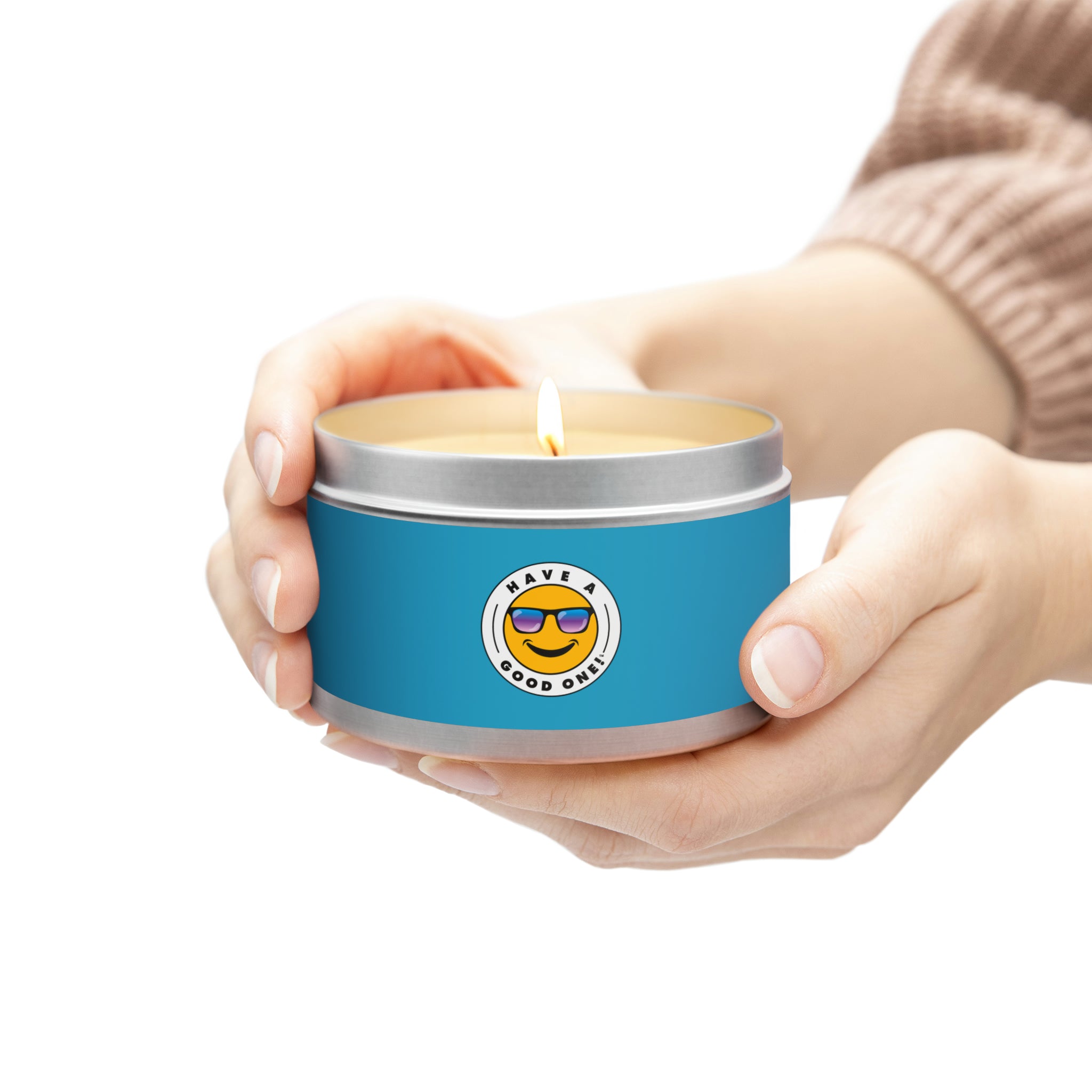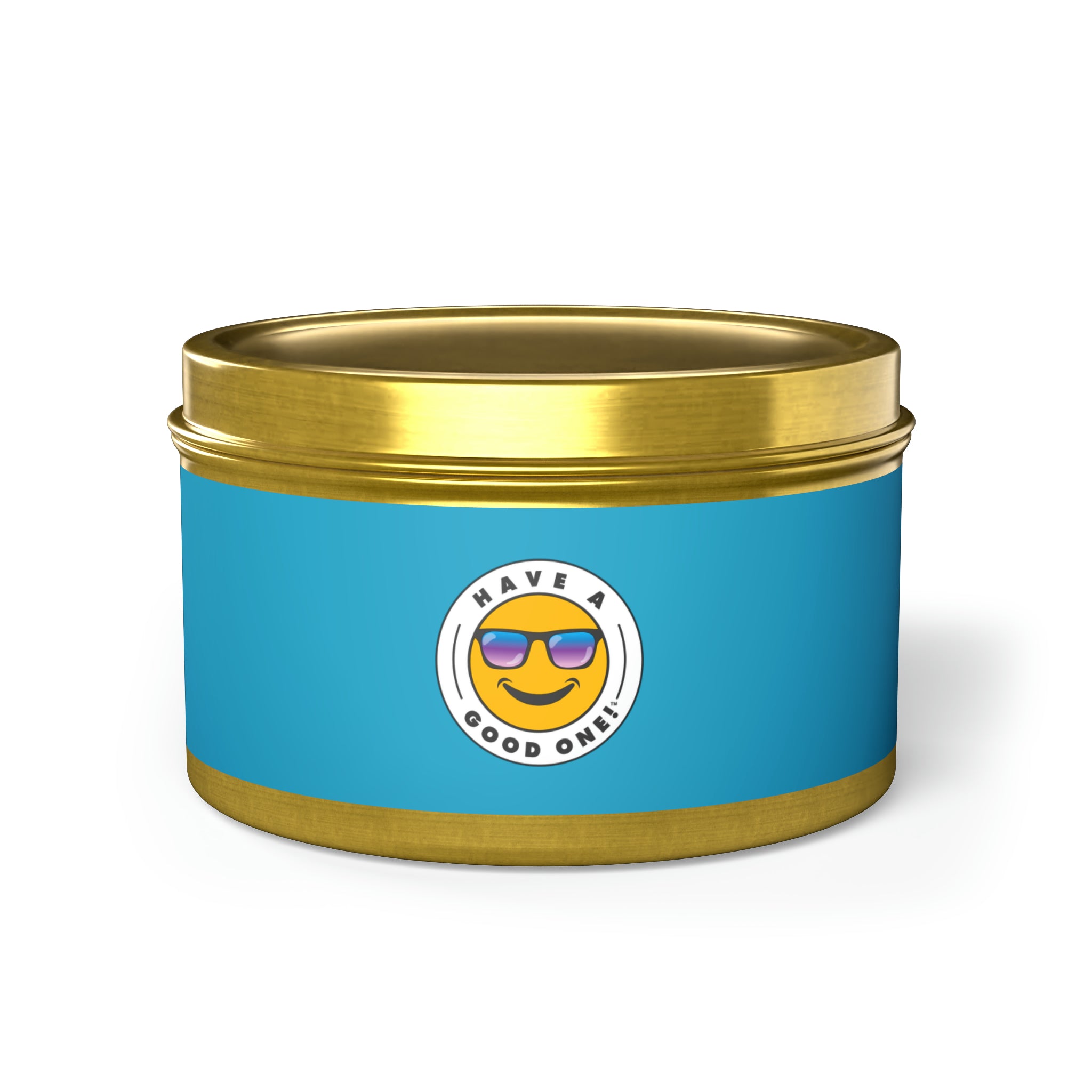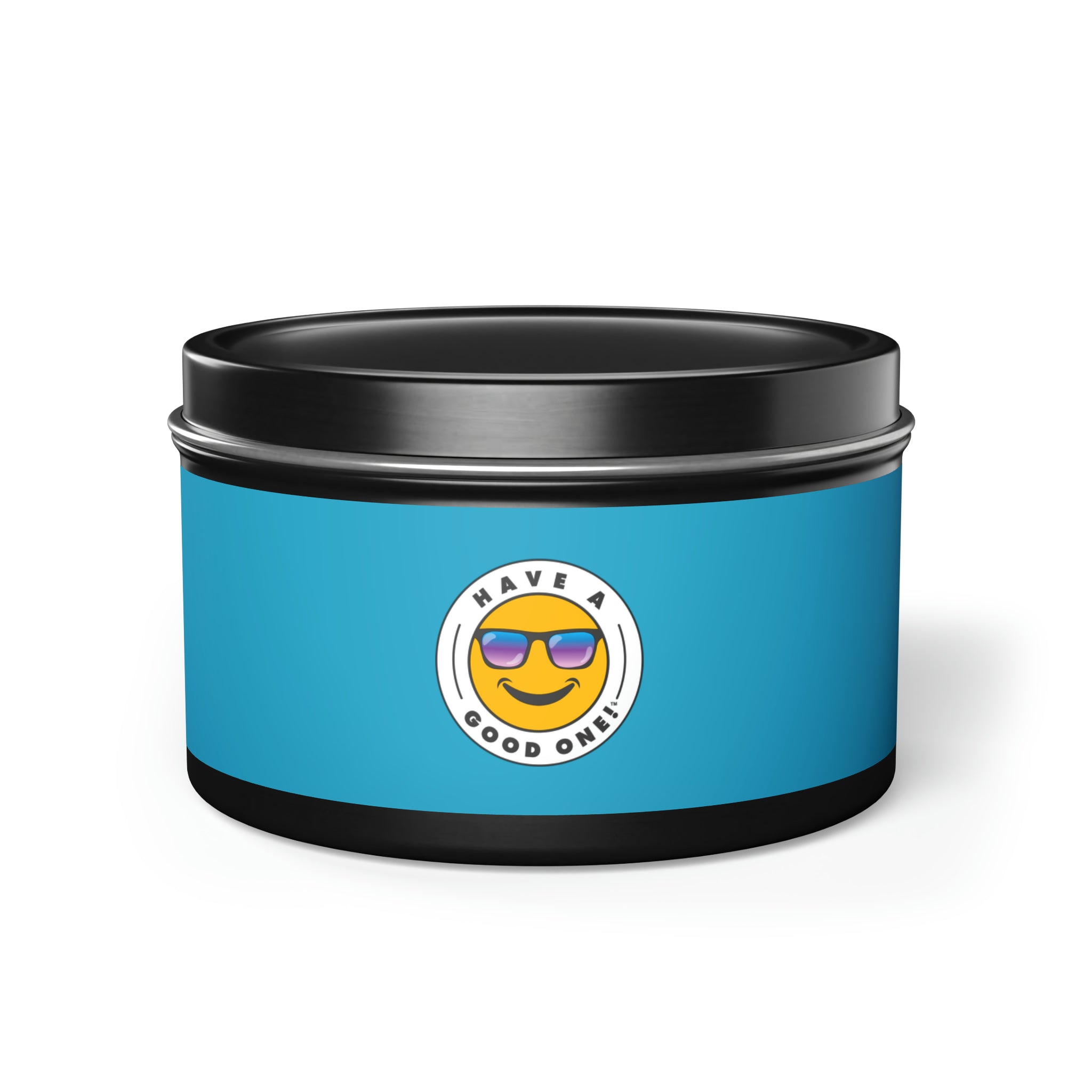 Tin Have A Good One! Candles With Lid - Turquoise Color With Blue Purple Have A Good One Logo