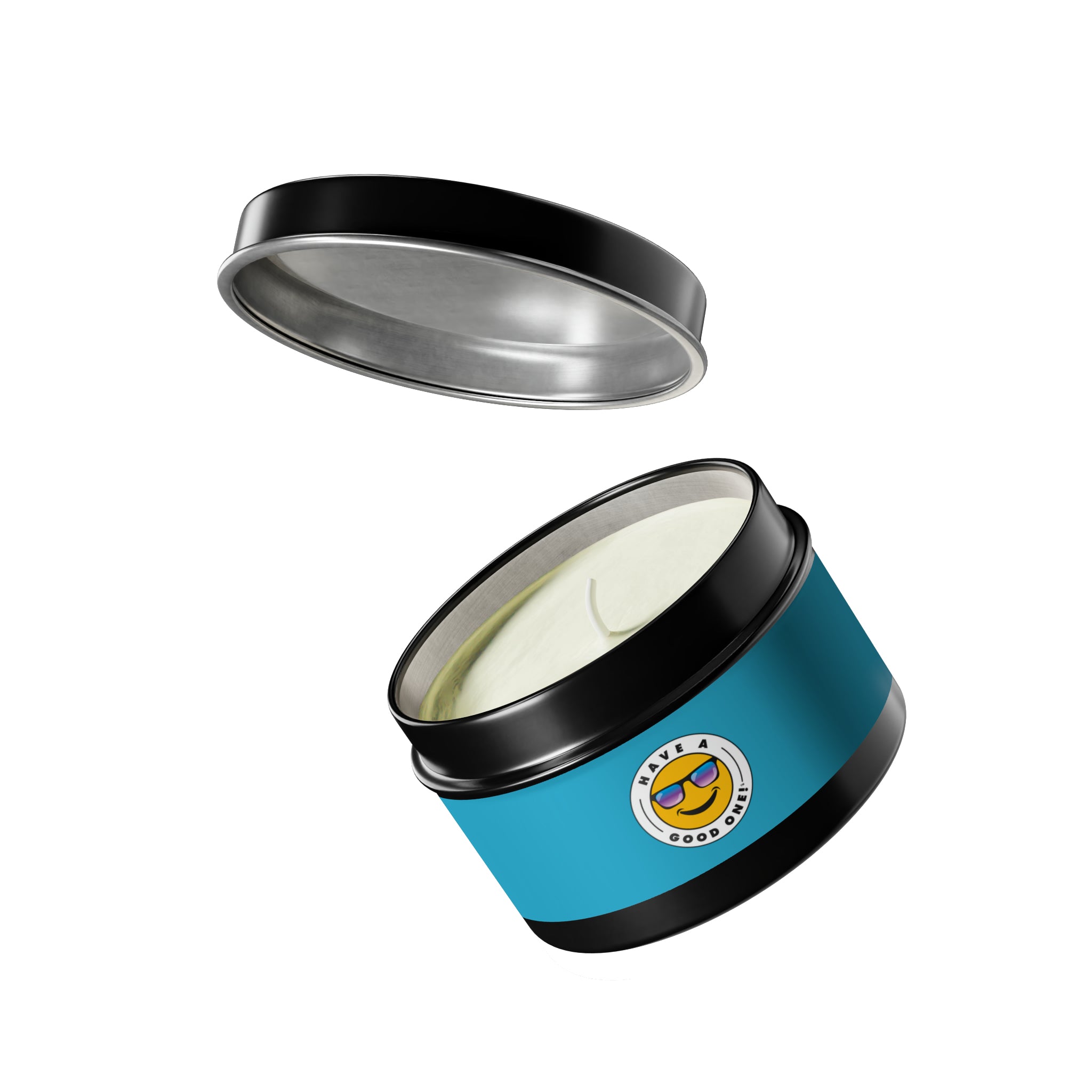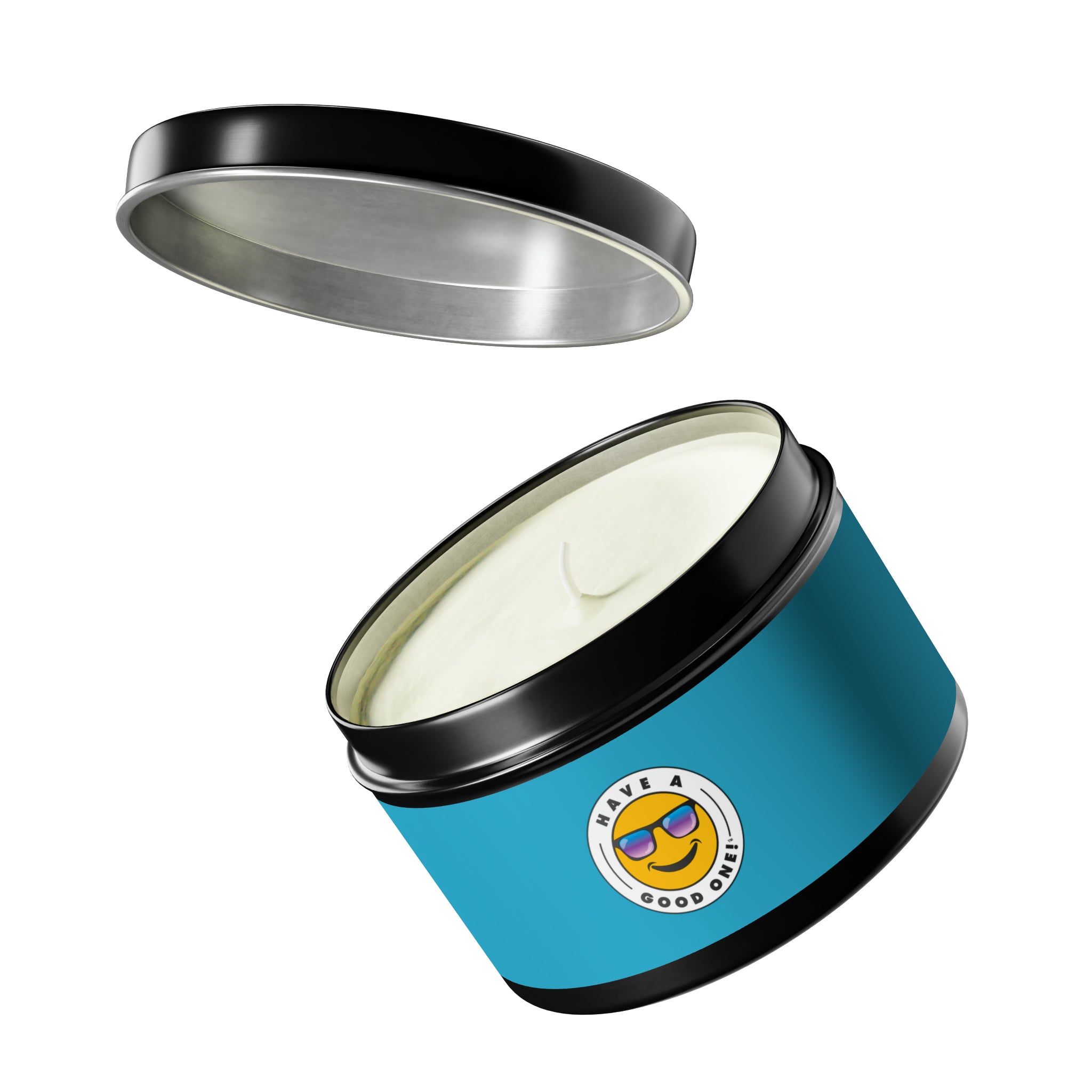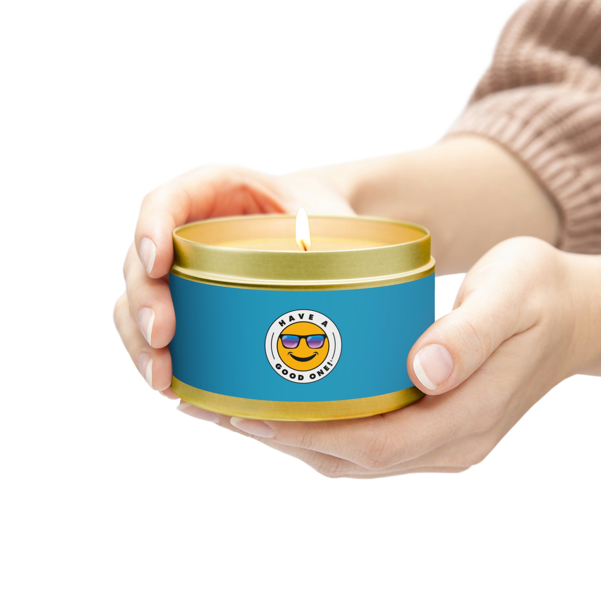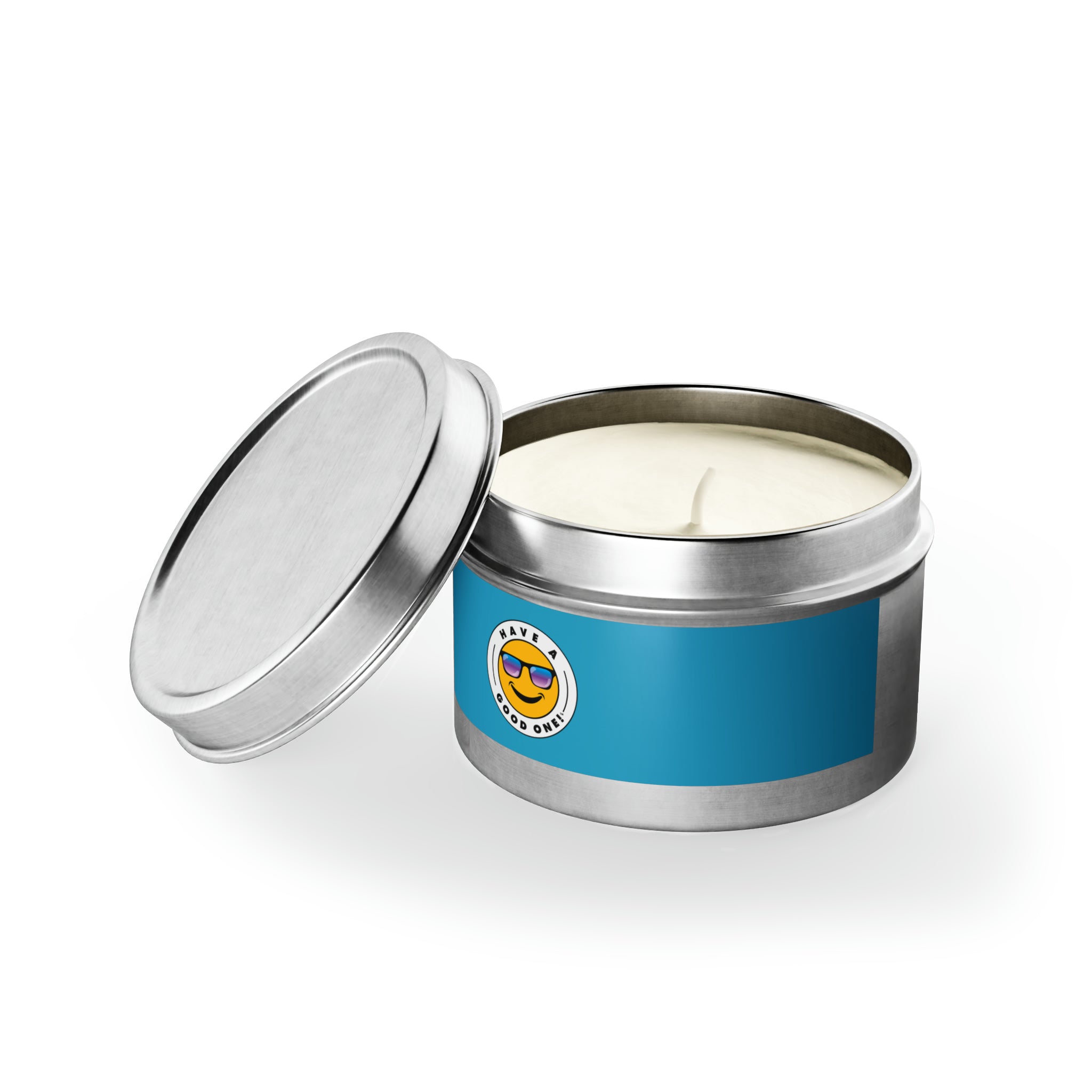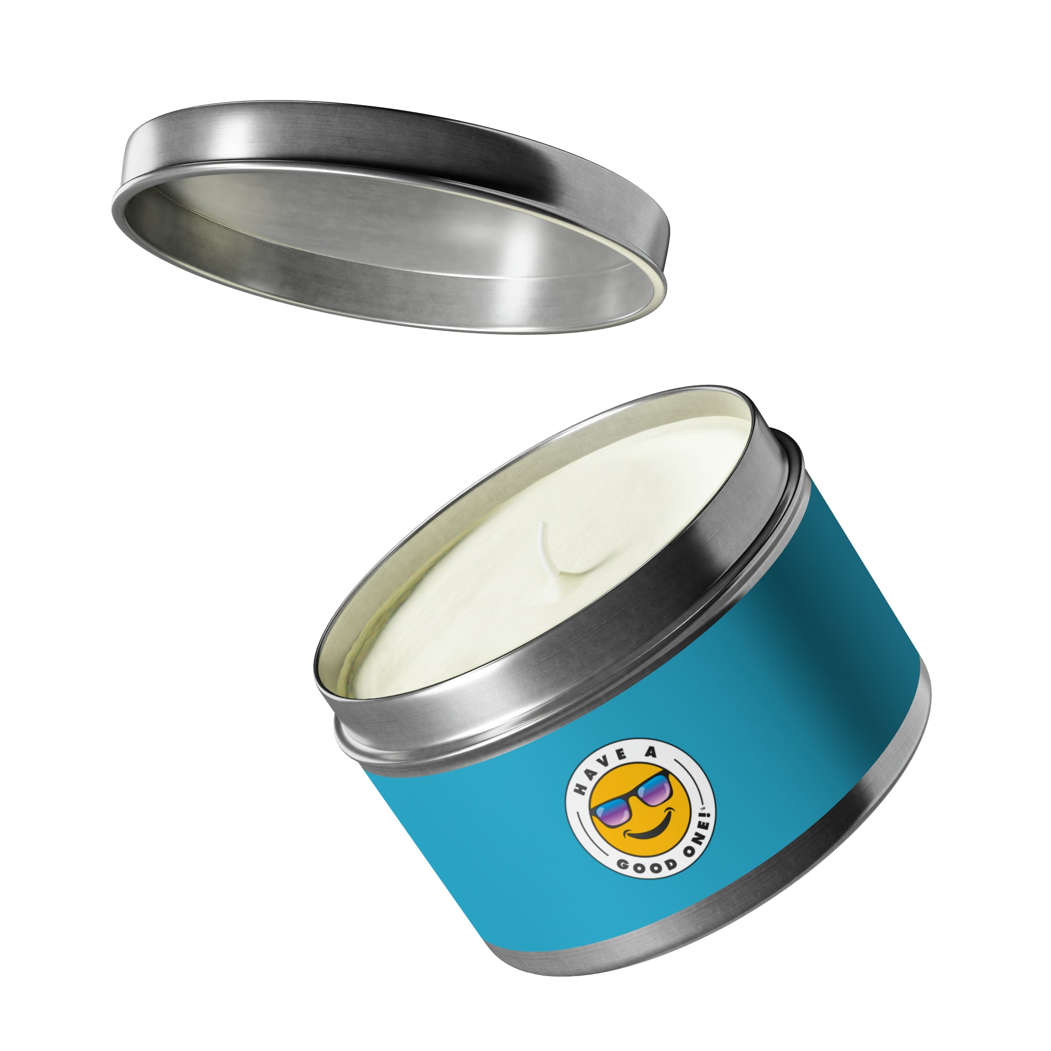 Tin Have A Good One! Candles With Lid - Turquoise Color With Blue Purple Have A Good One Logo
