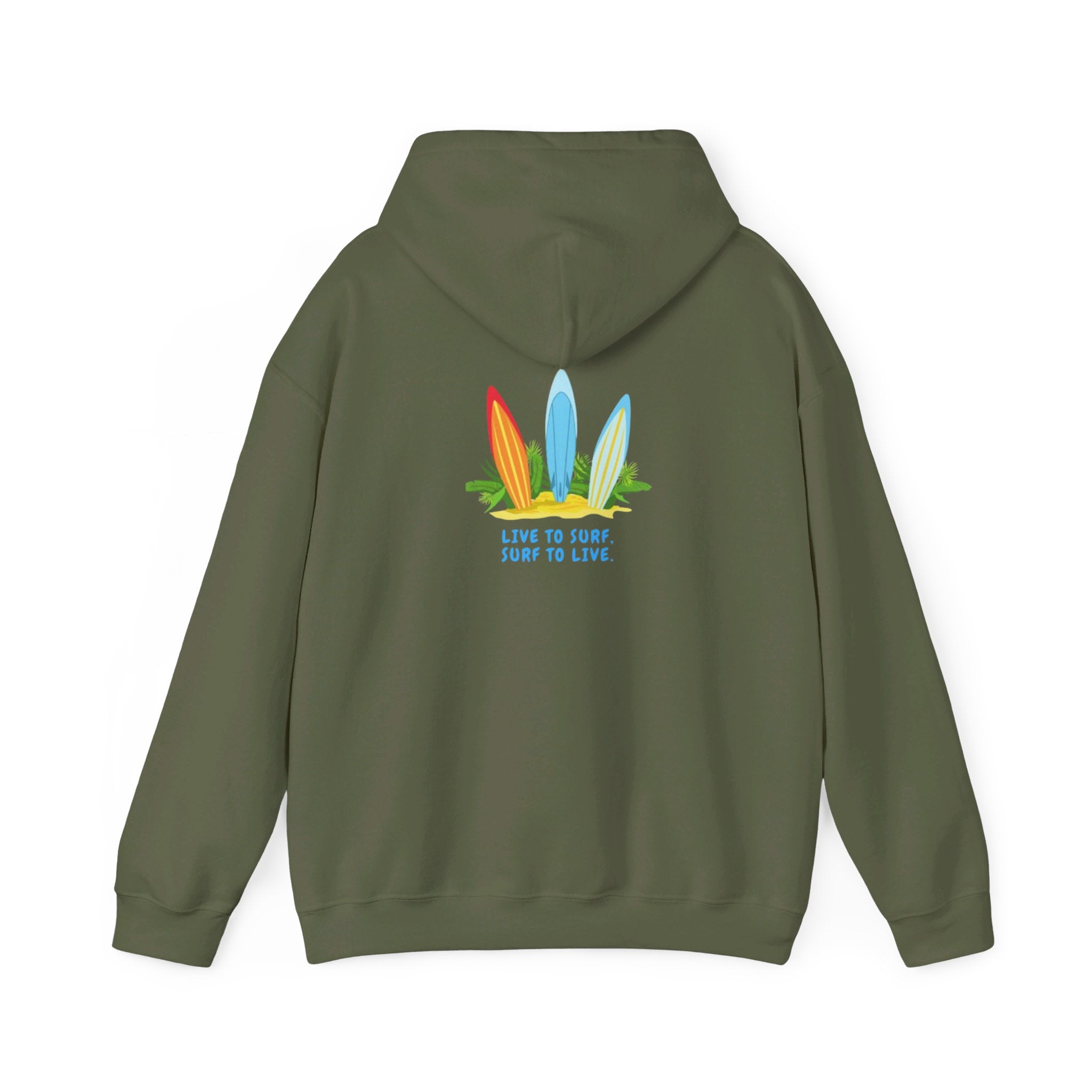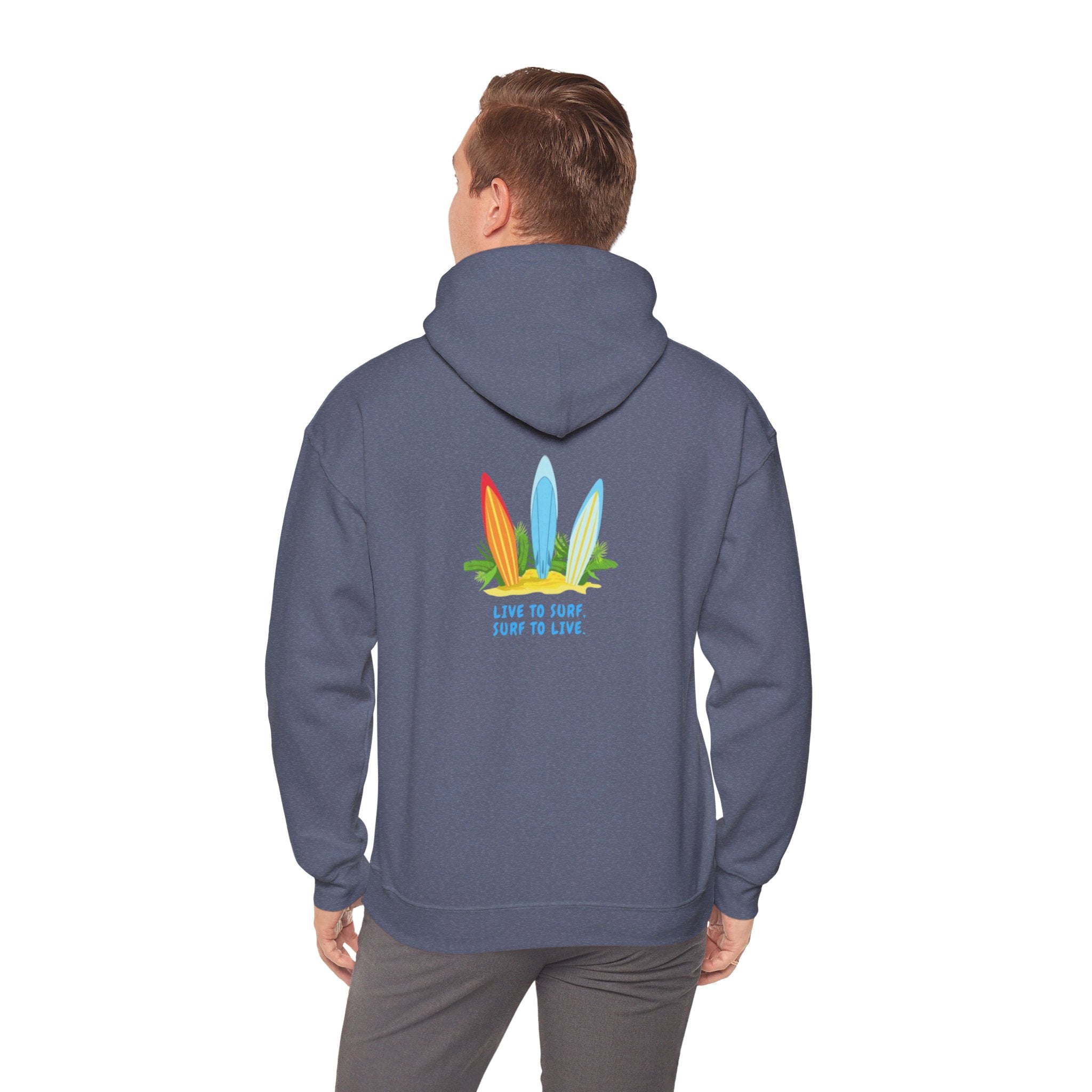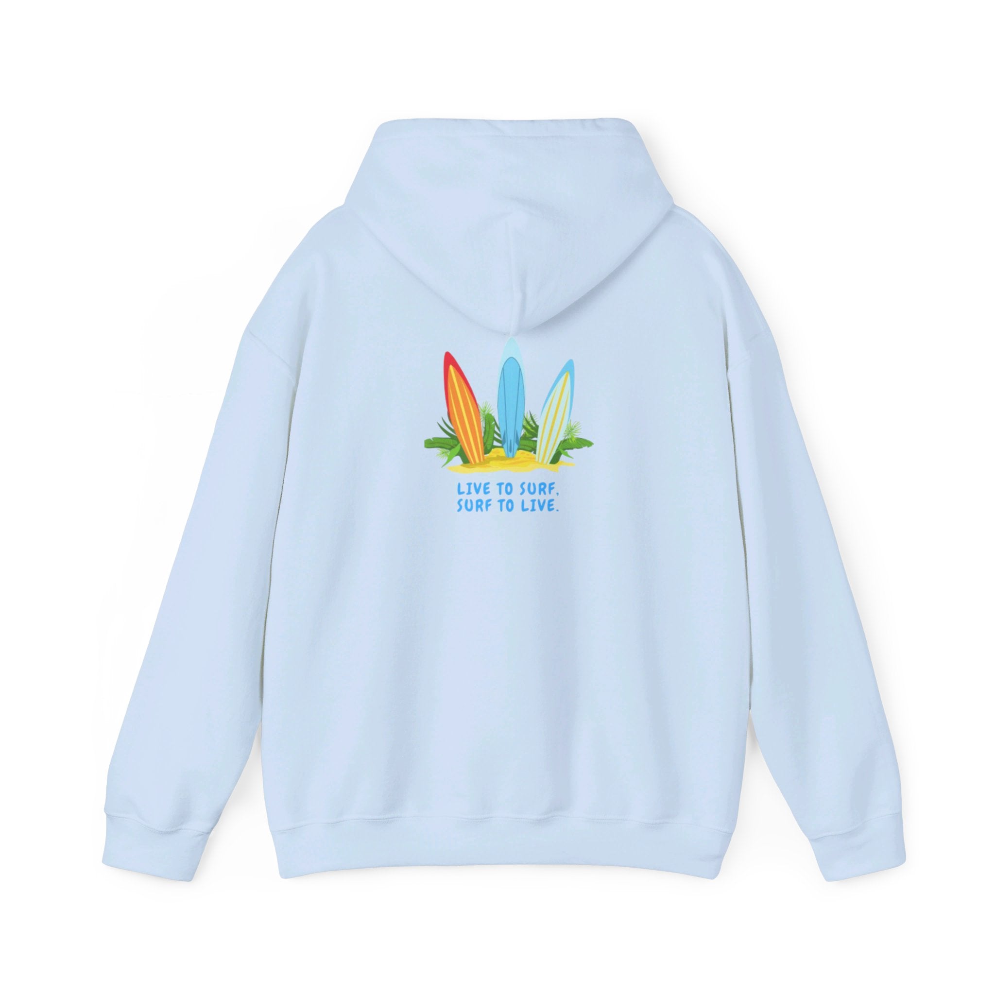 Unisex Heavy Blend Hooded Sweatshirt - Blue Green Logo on Front with Live To Surf on Back of Sweatshirt