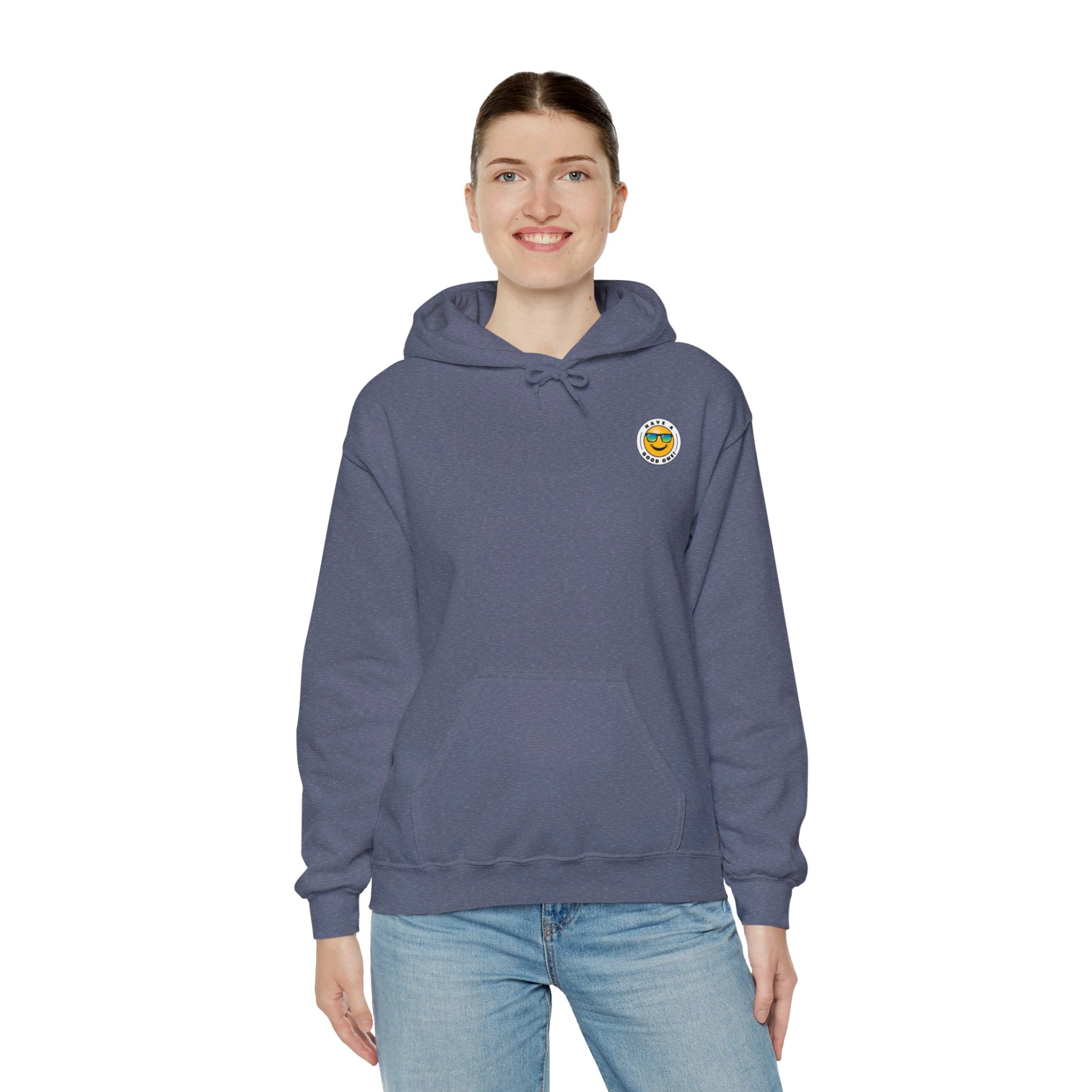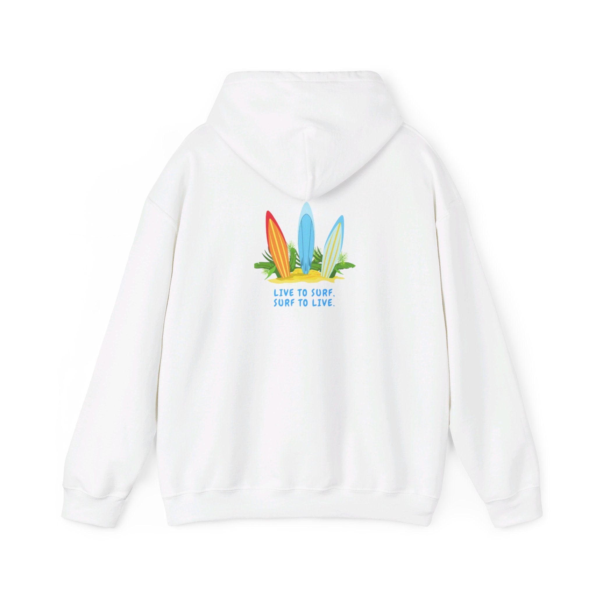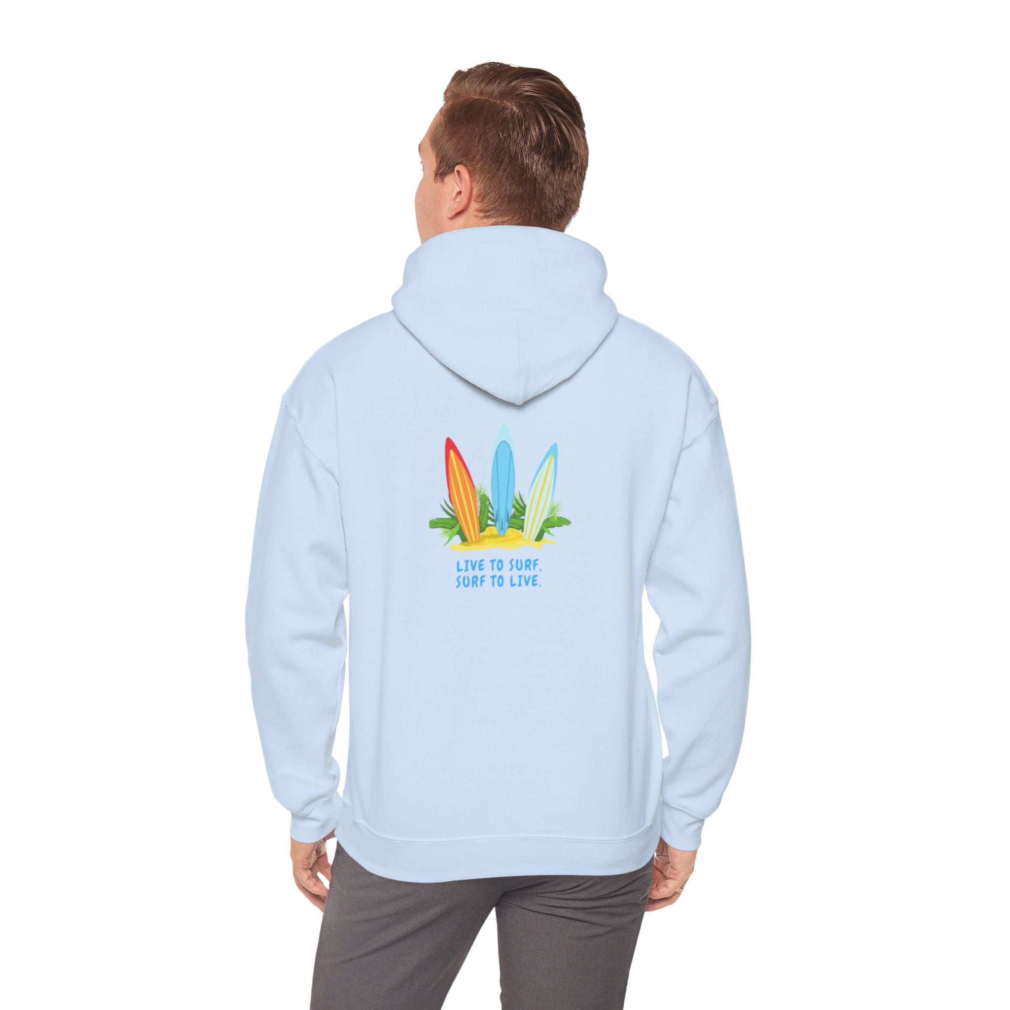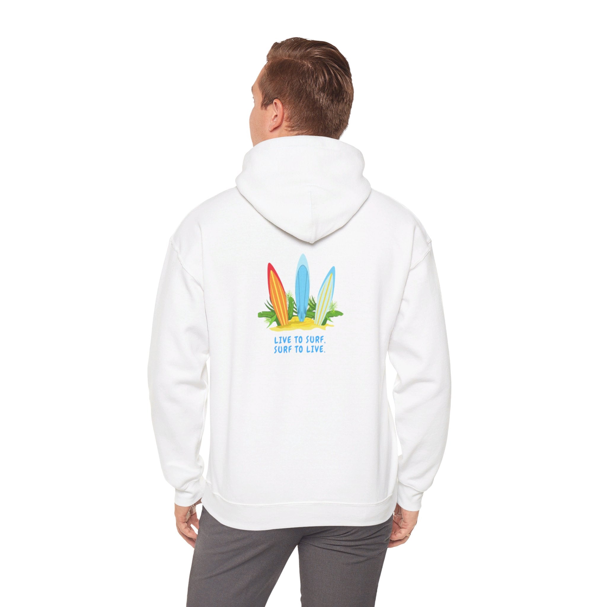 Unisex Heavy Blend Hooded Sweatshirt - Blue Green Logo on Front with Live To Surf on Back of Sweatshirt