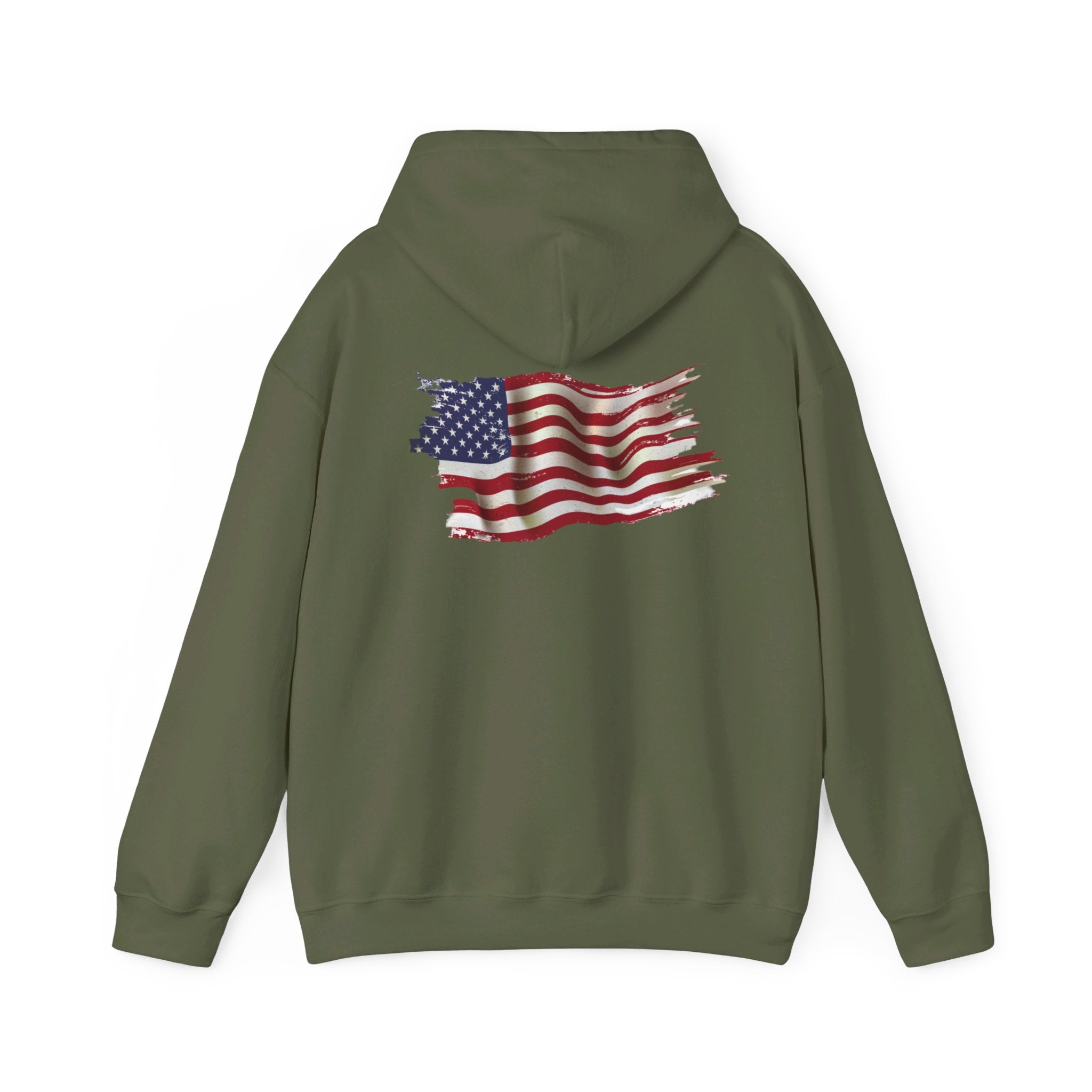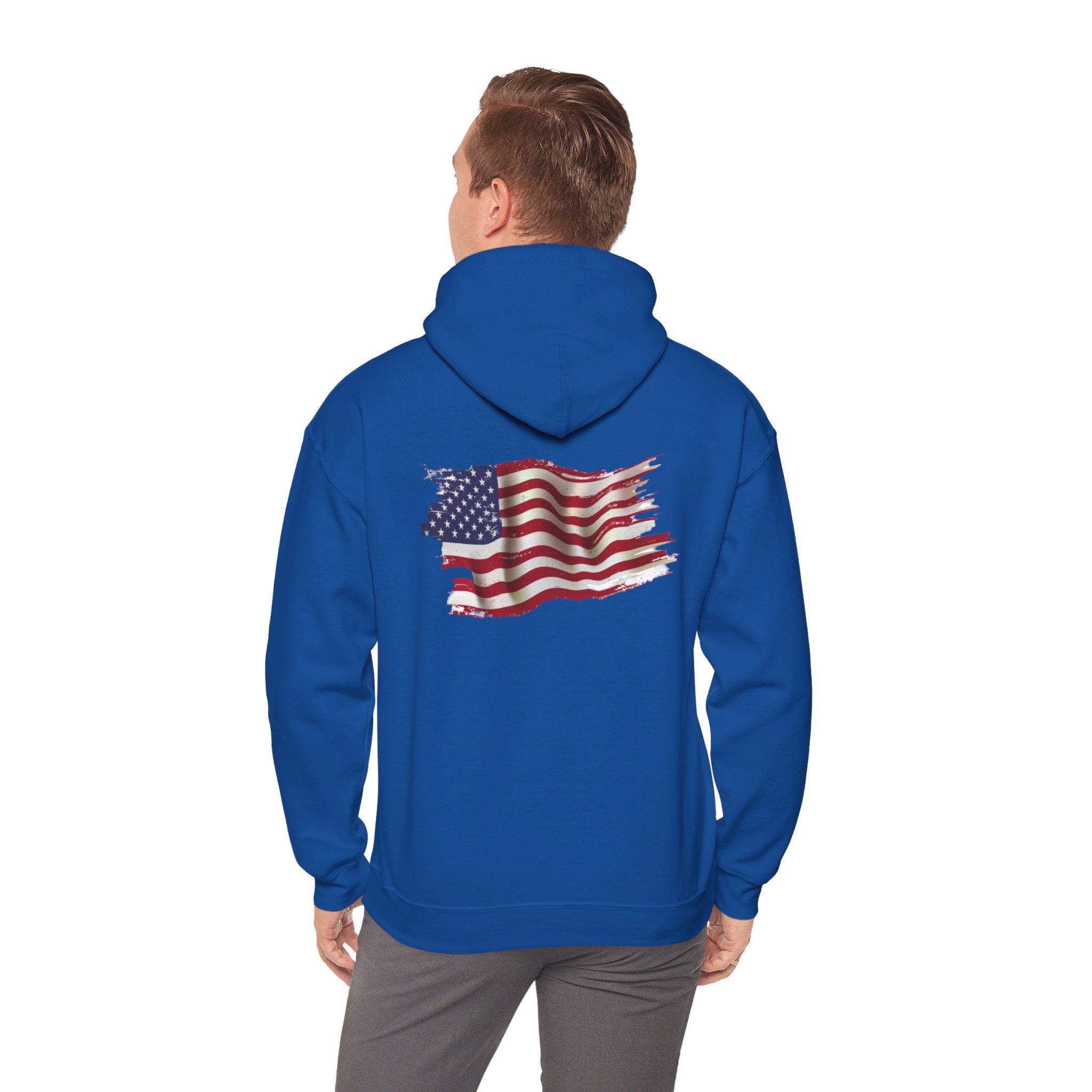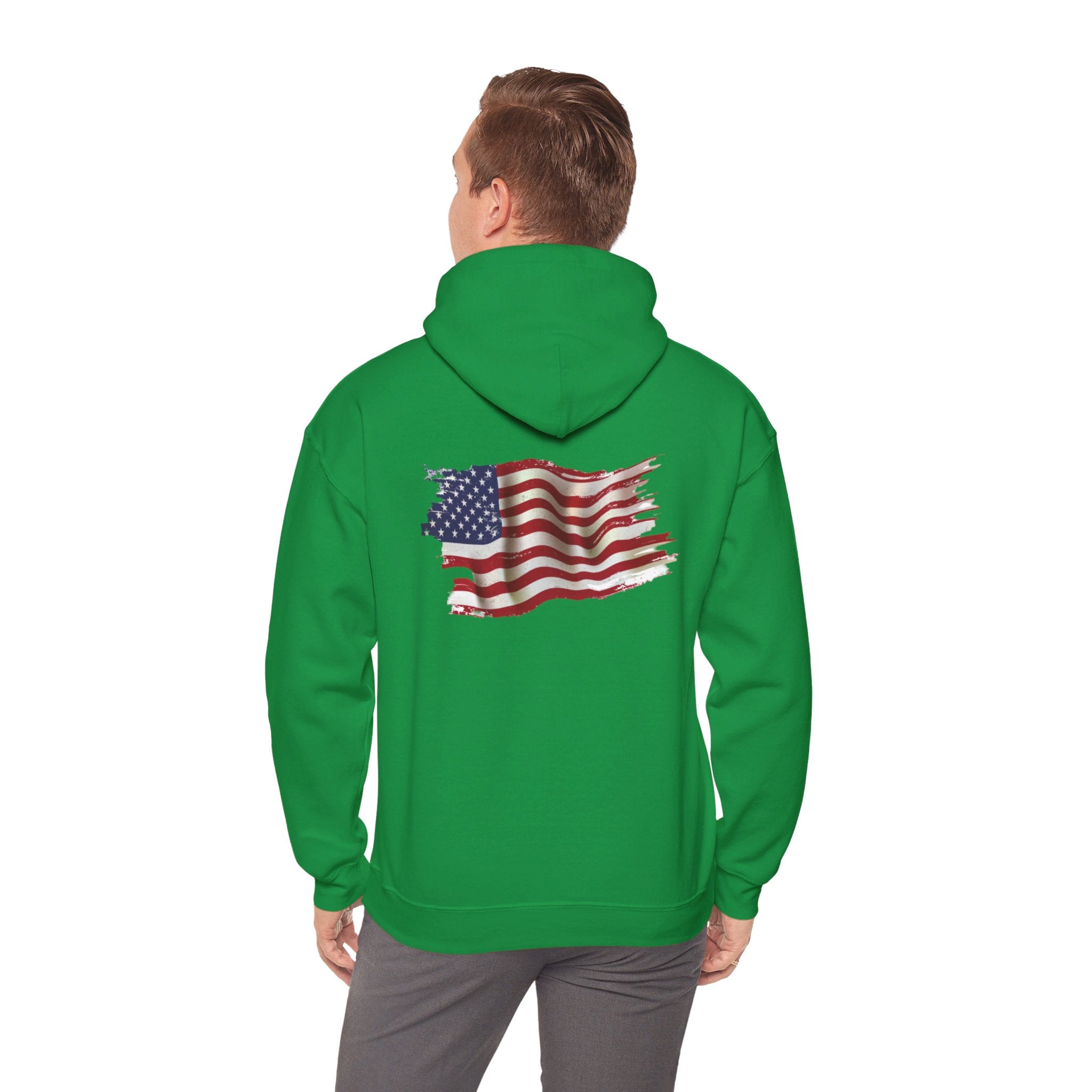 Unisex Heavy Blend Hooded Sweatshirt - Blue Green Logo on Front with USA Flag on Back of Sweatshirt