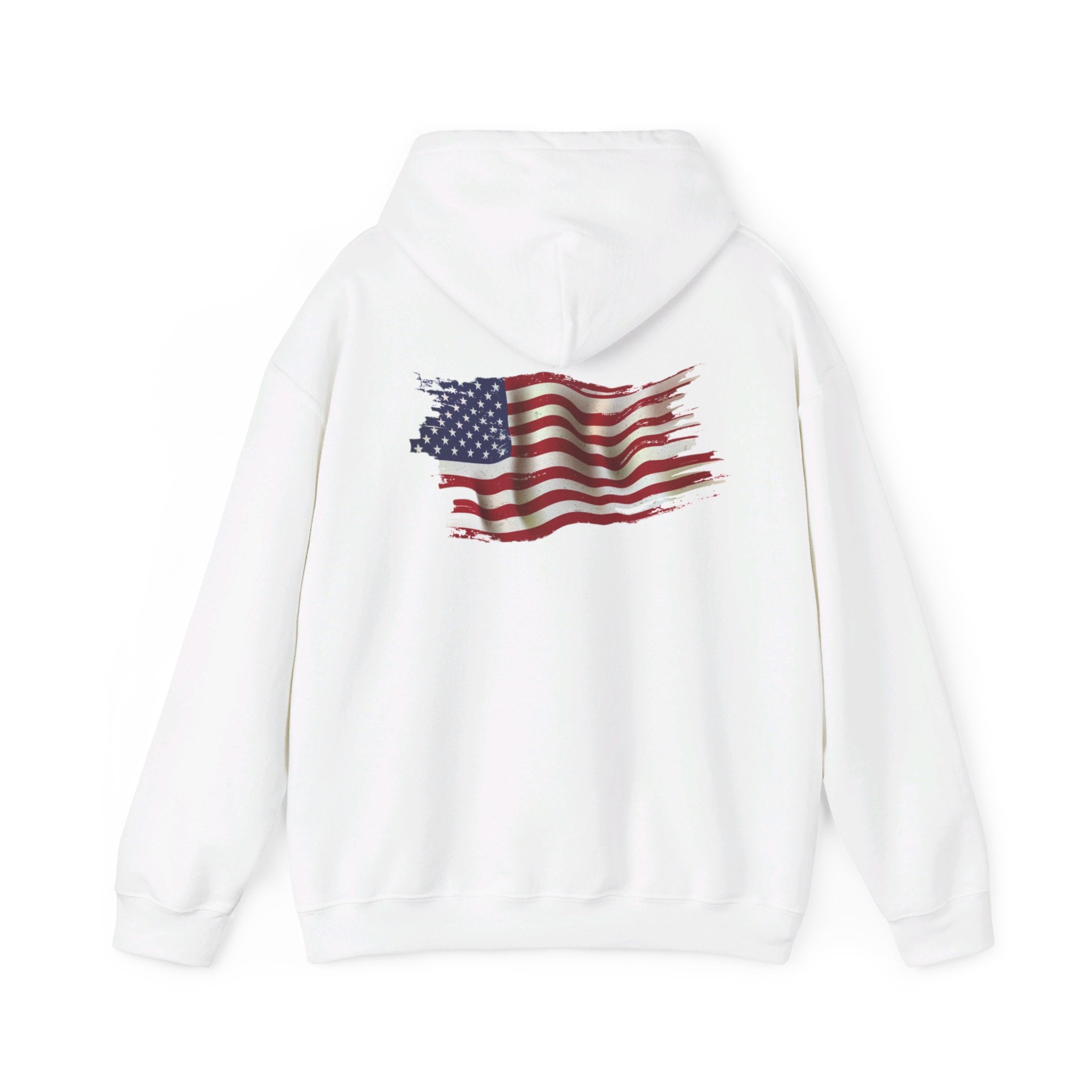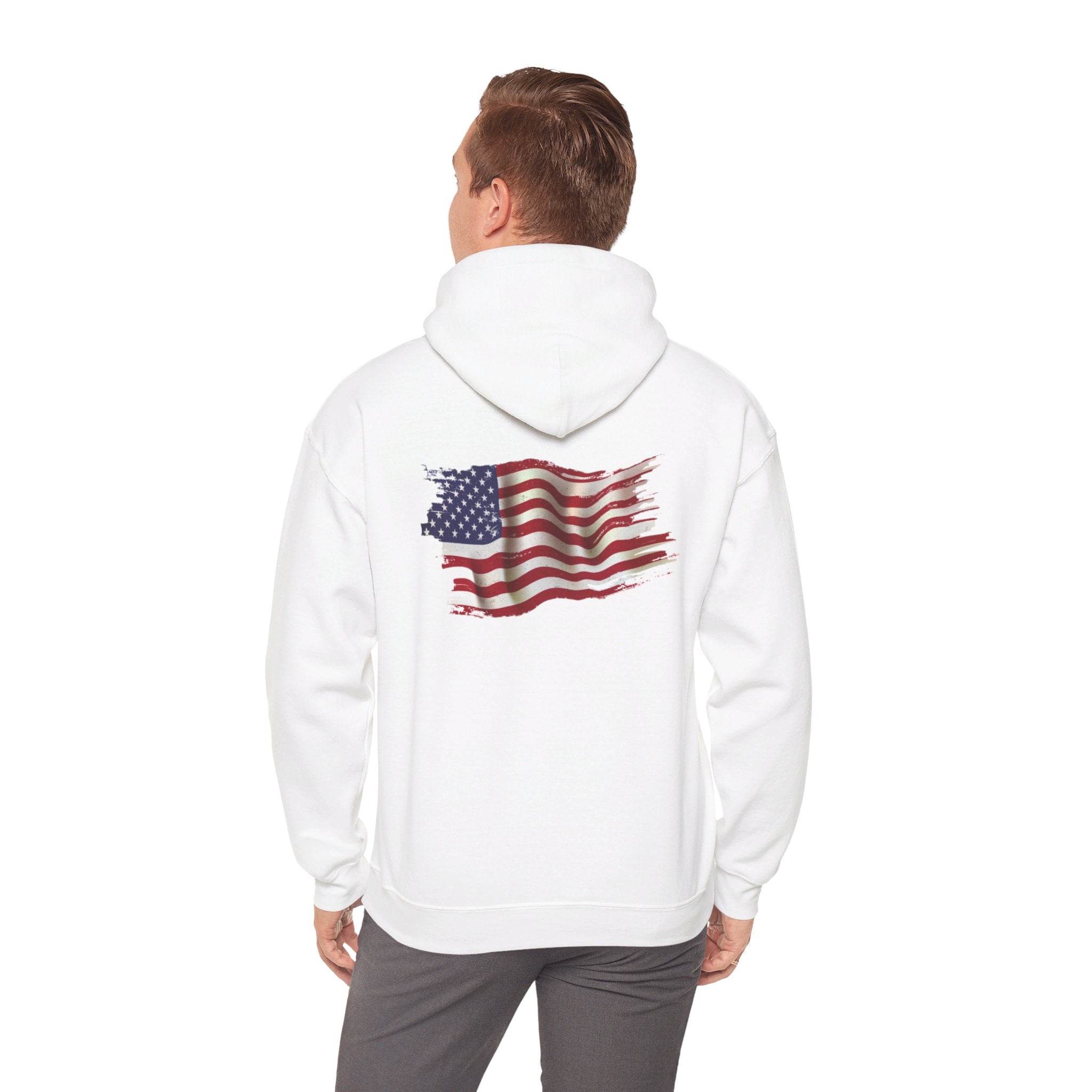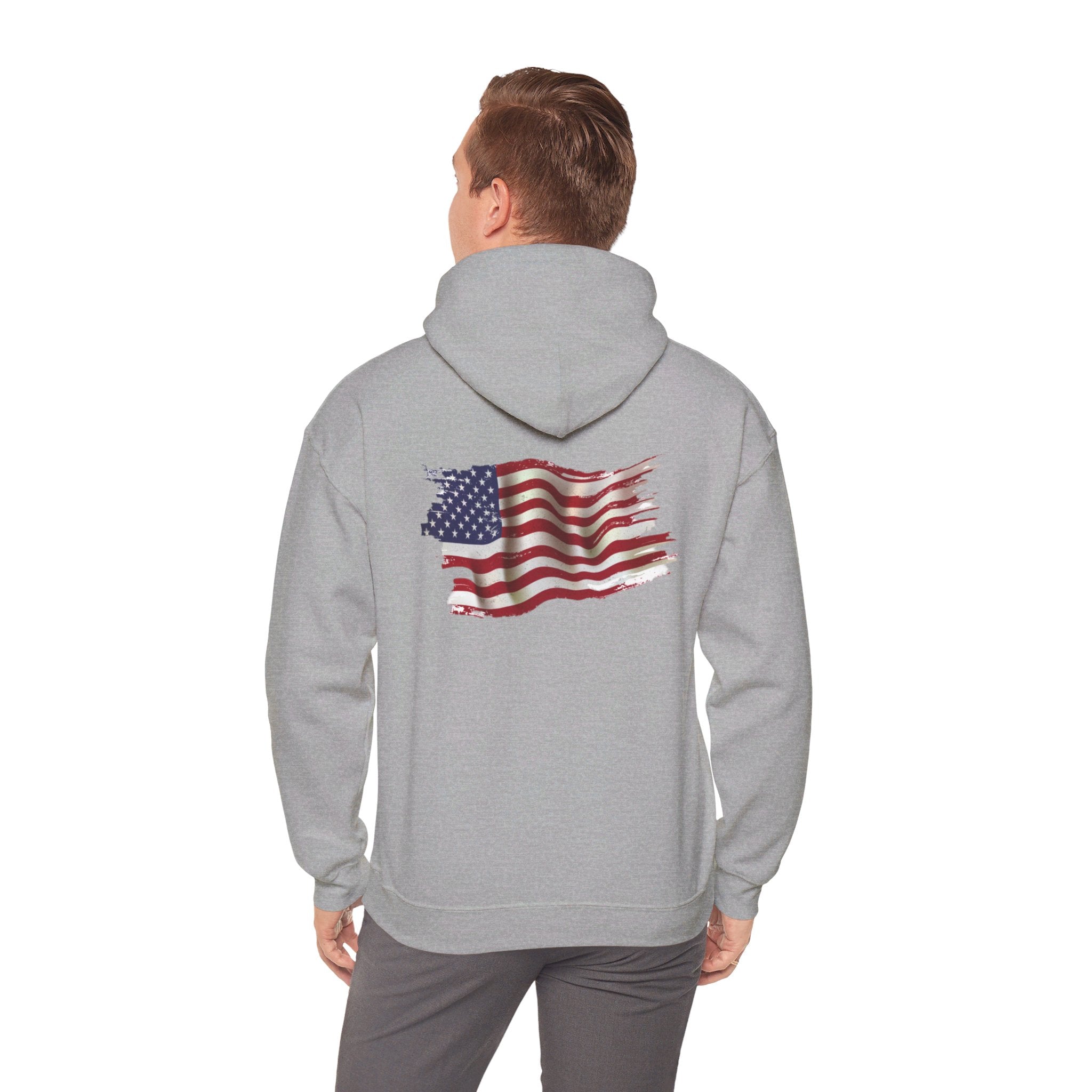 Unisex Heavy Blend Hooded Sweatshirt - Blue Green Logo on Front with USA Flag on Back of Sweatshirt