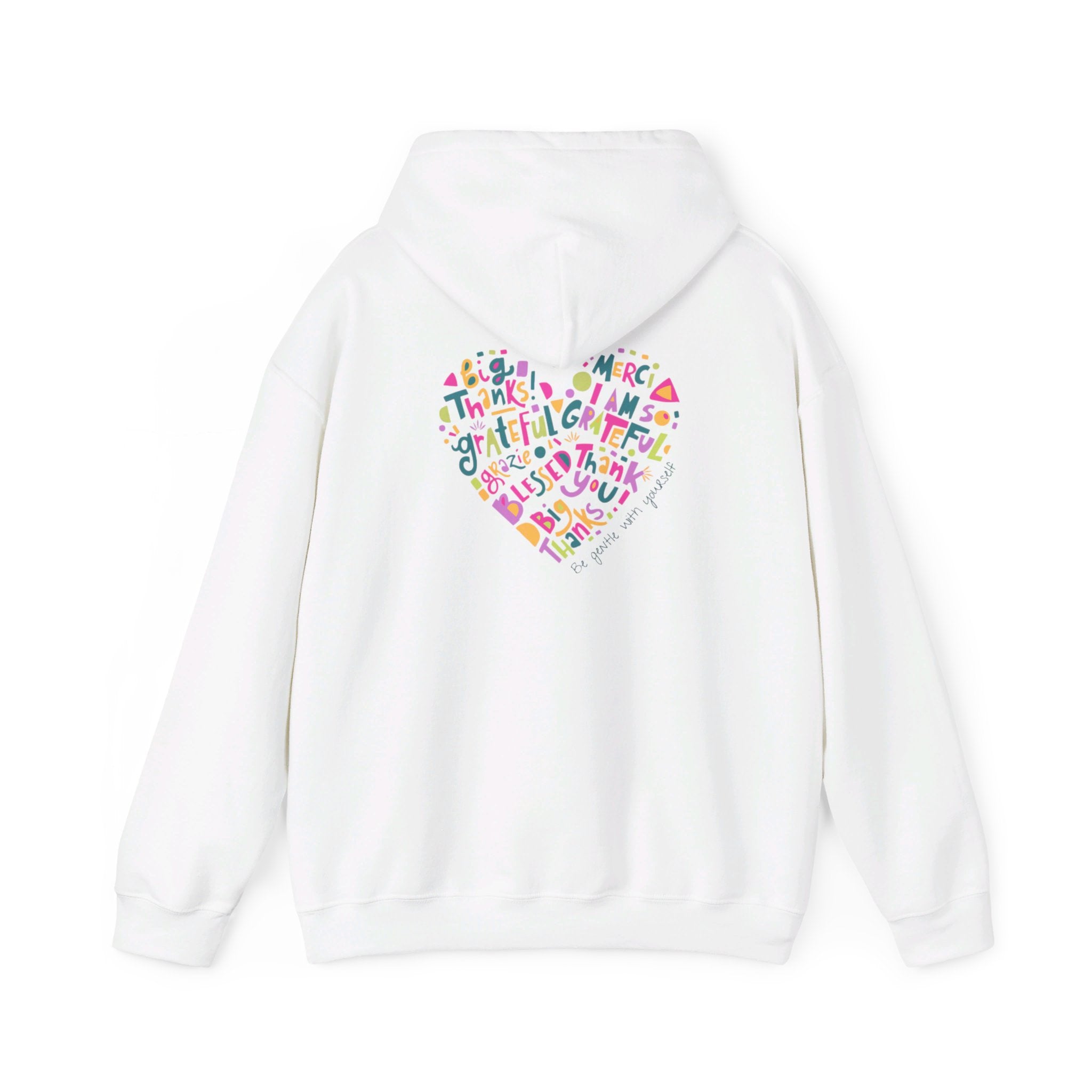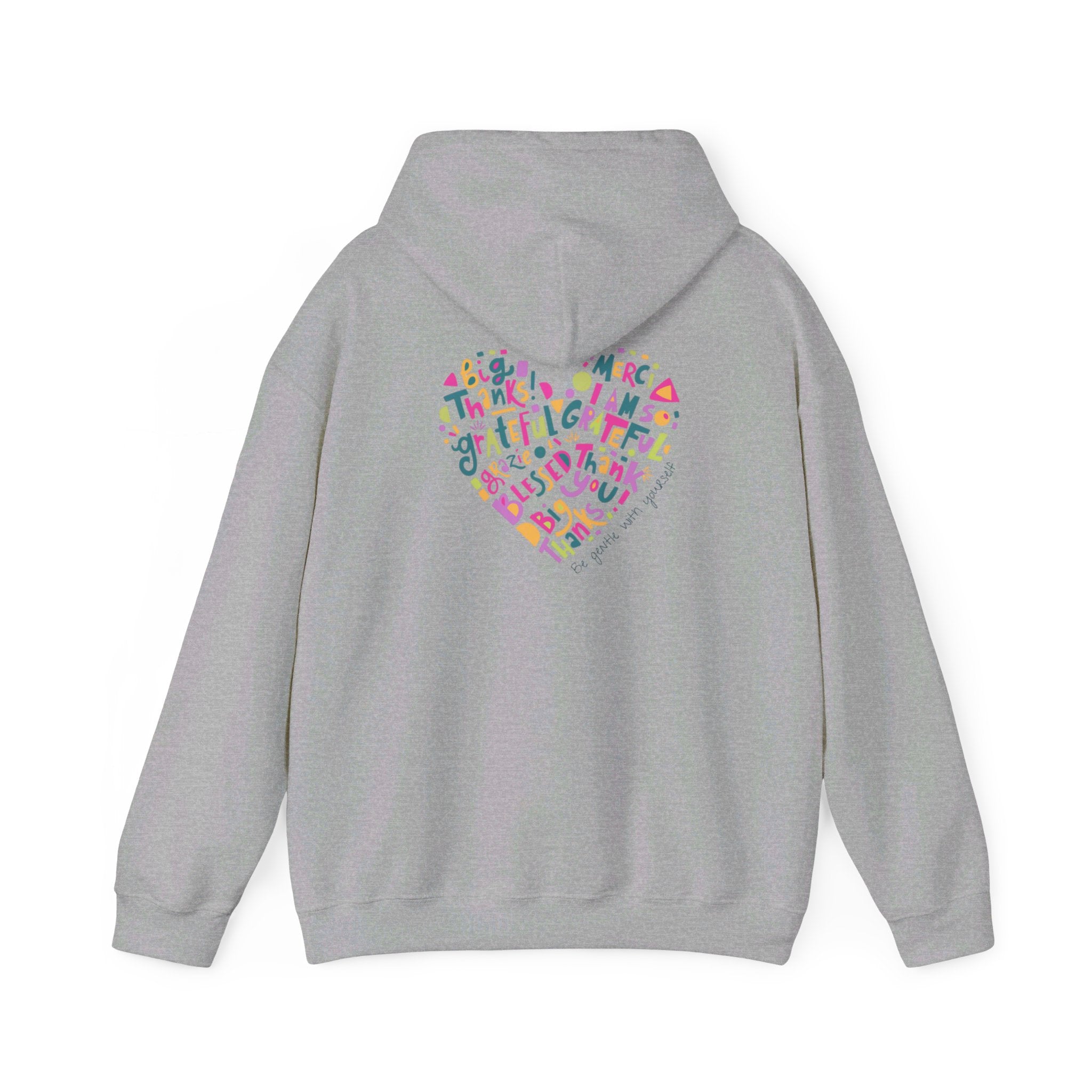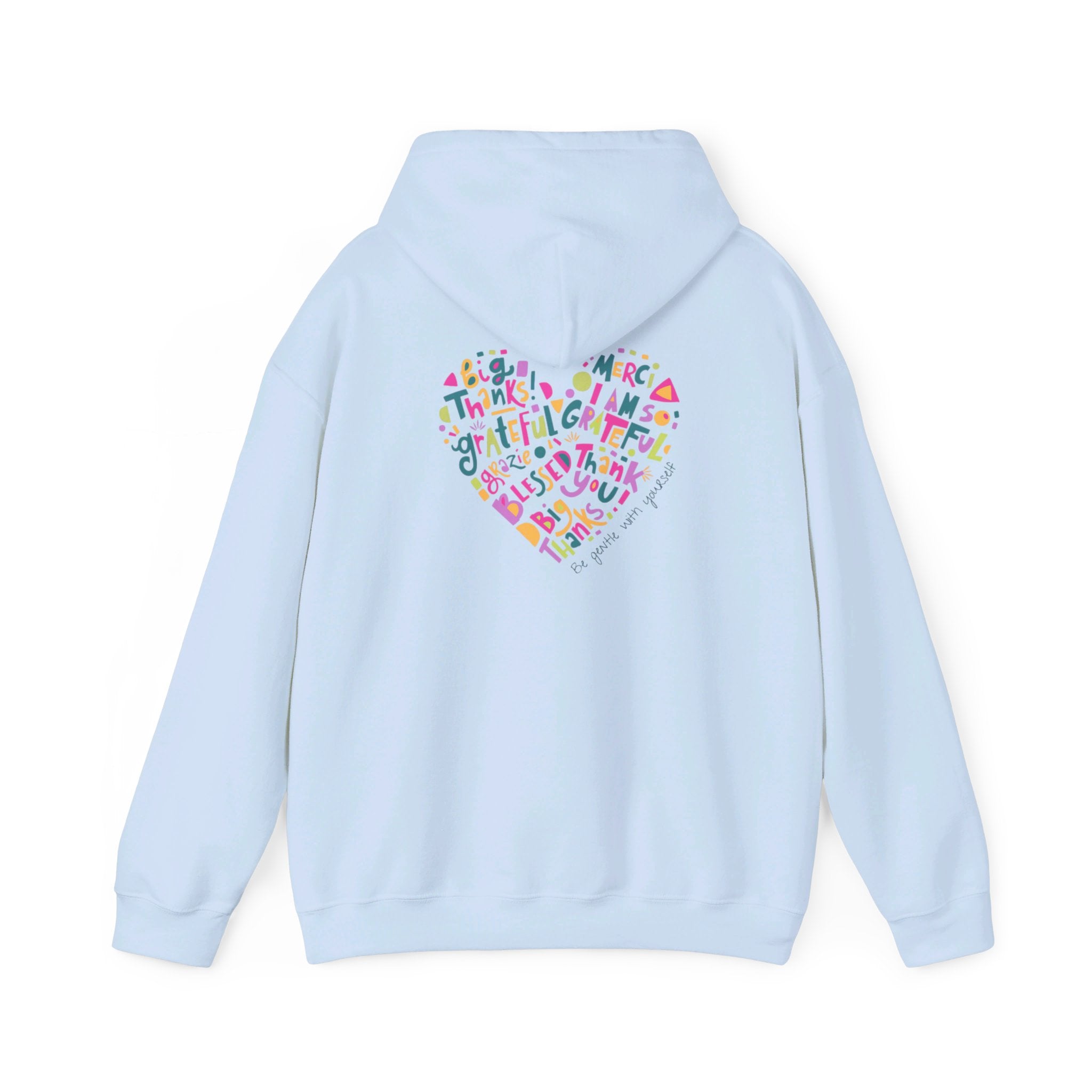 Unisex Heavy Blend Hooded Sweatshirt - Blue Purple Logo Front and Gratitude Heart on Back of Sweatshirt