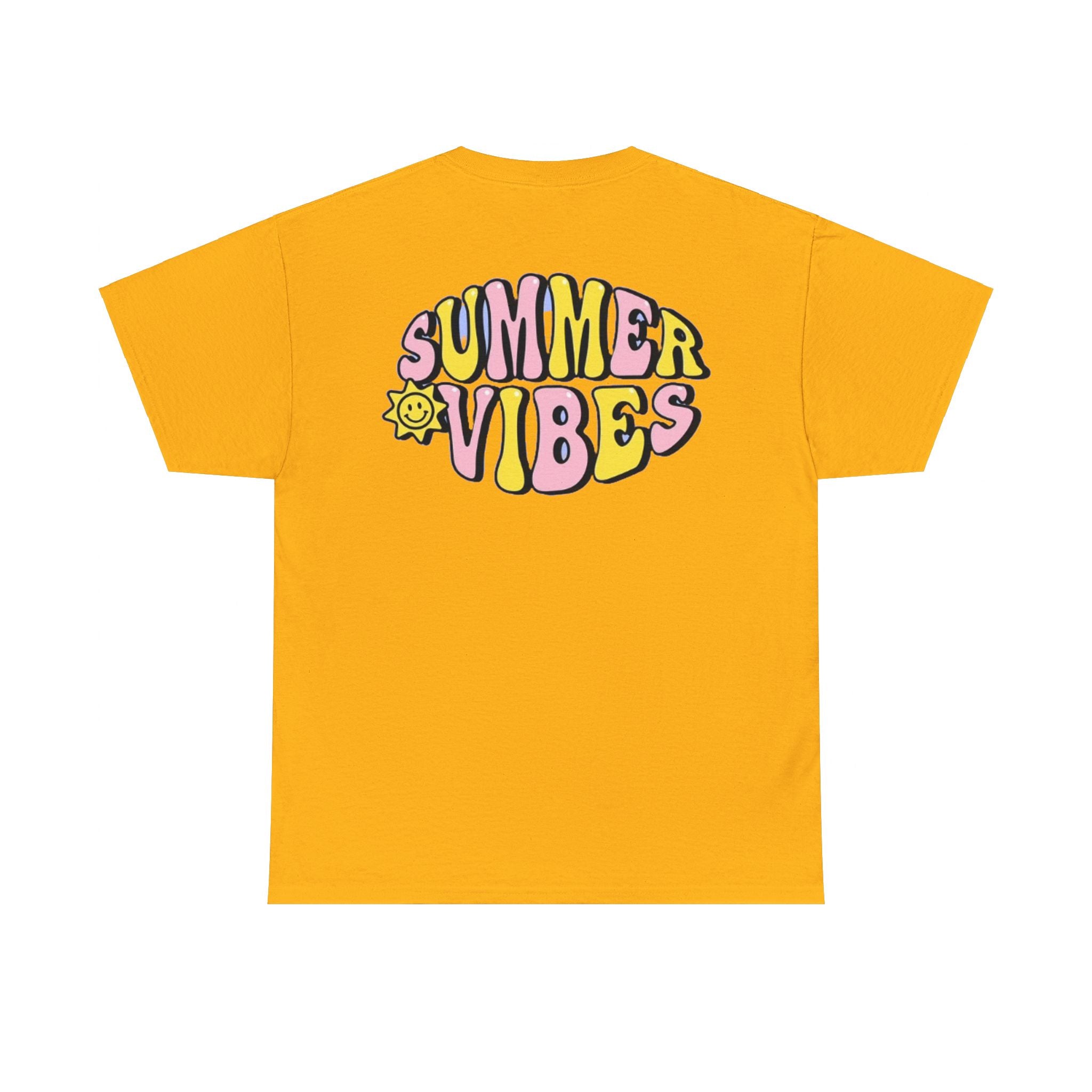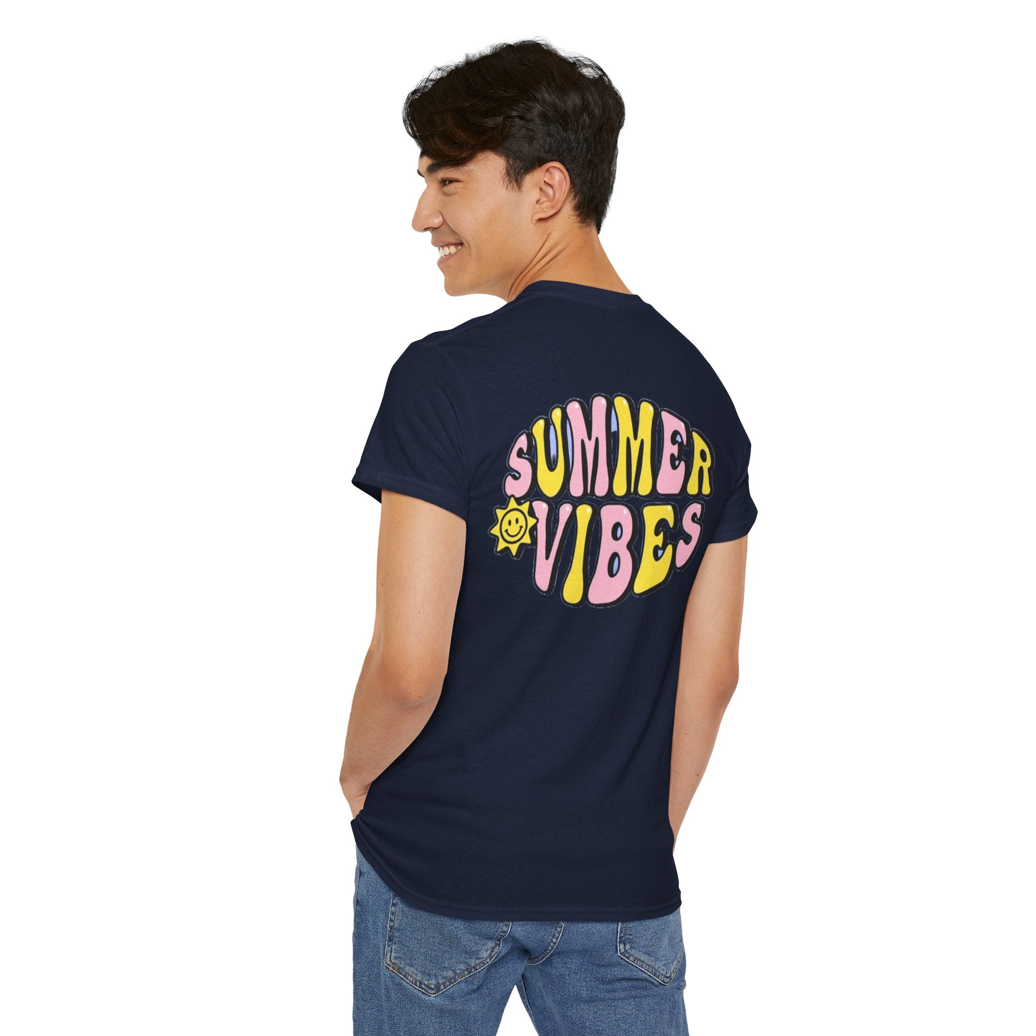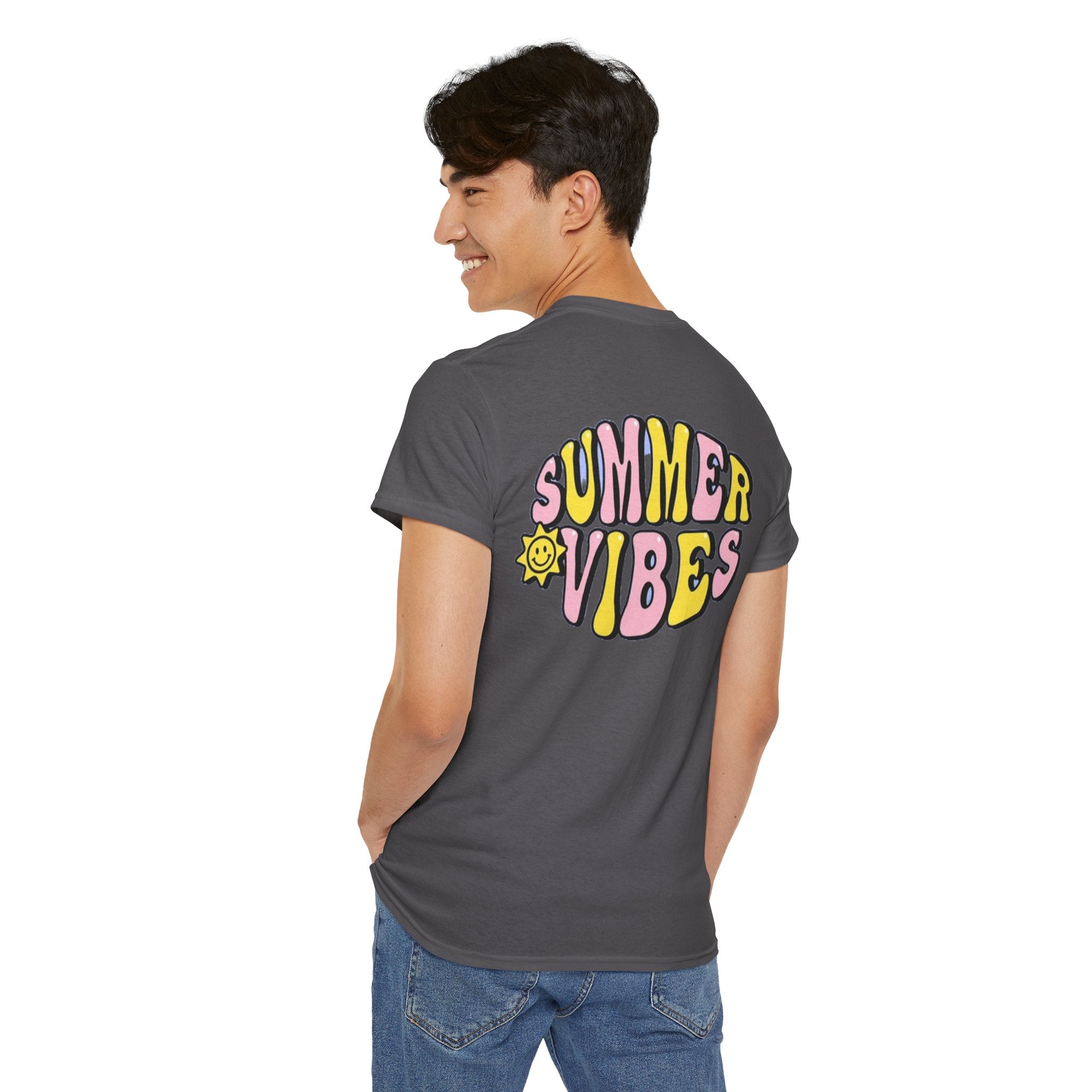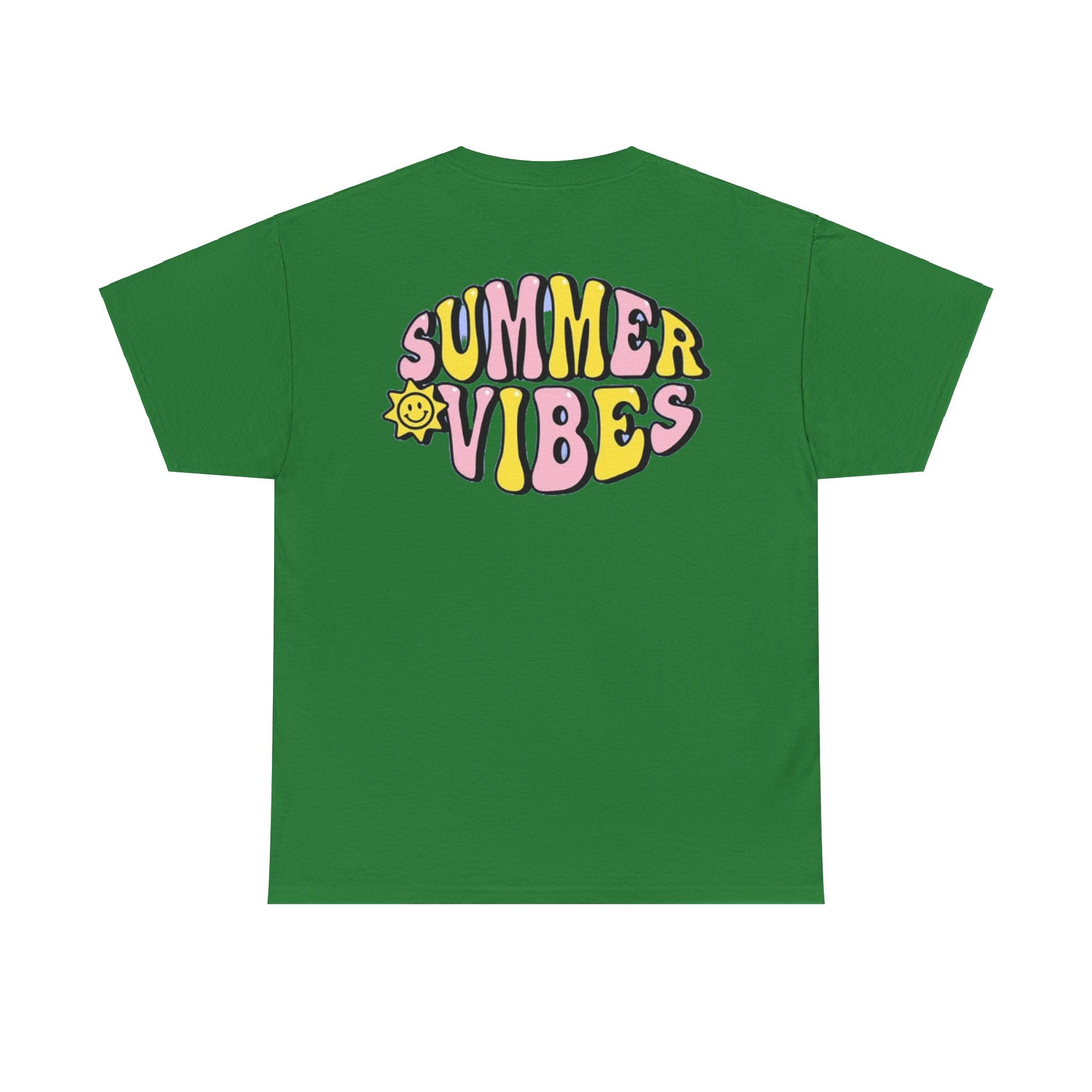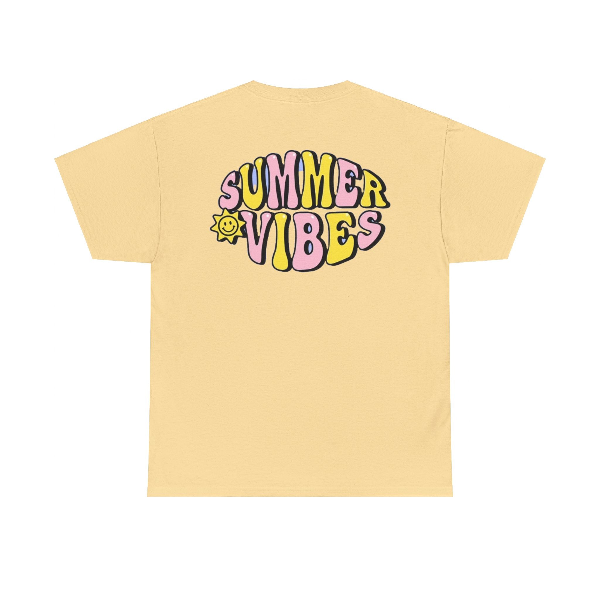 SUMMER VIBES! Hip and comfy casual t-shirt for the beach, boat, sporting event, or just relaxing wherever you are! You can be cool and spread the good vibes with this fun t-shirt! It a relaxed, classic fit designed for comfort and style. It is made from 100% cotton and is both durable and soft. It is unisex so it wears well on anyone and everyone. Let's all Have A Good One! Great vibes, good times, pass it on!