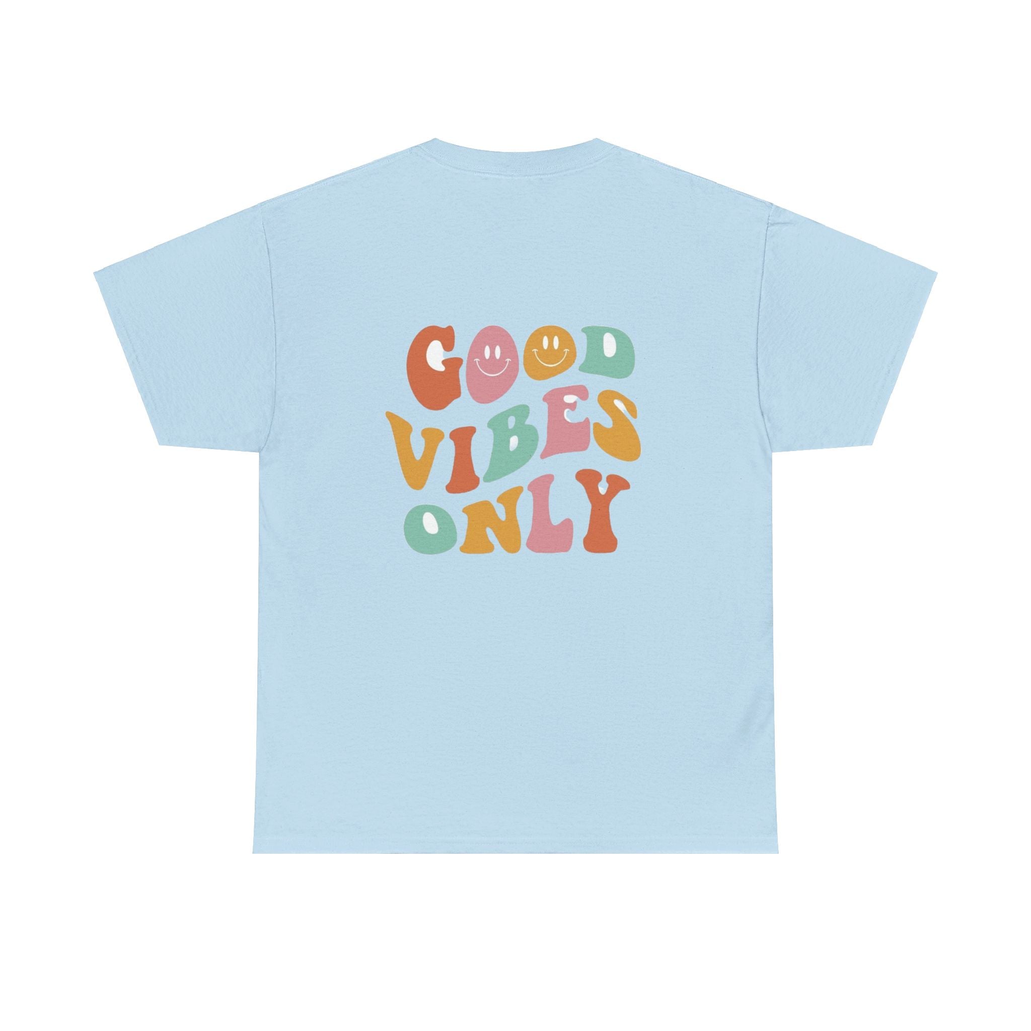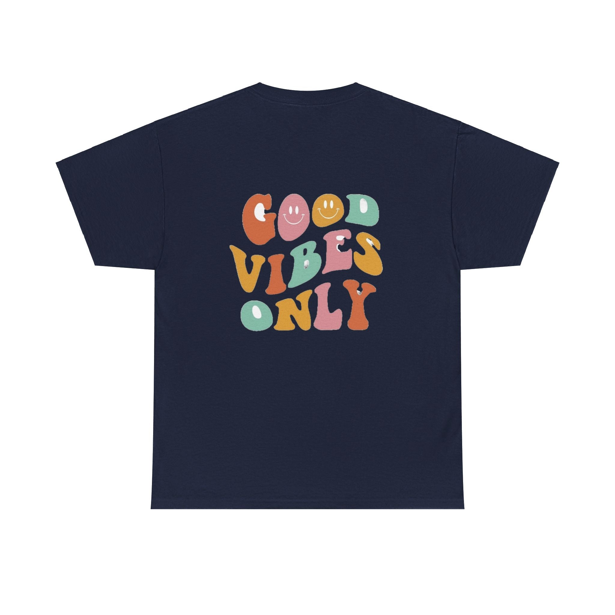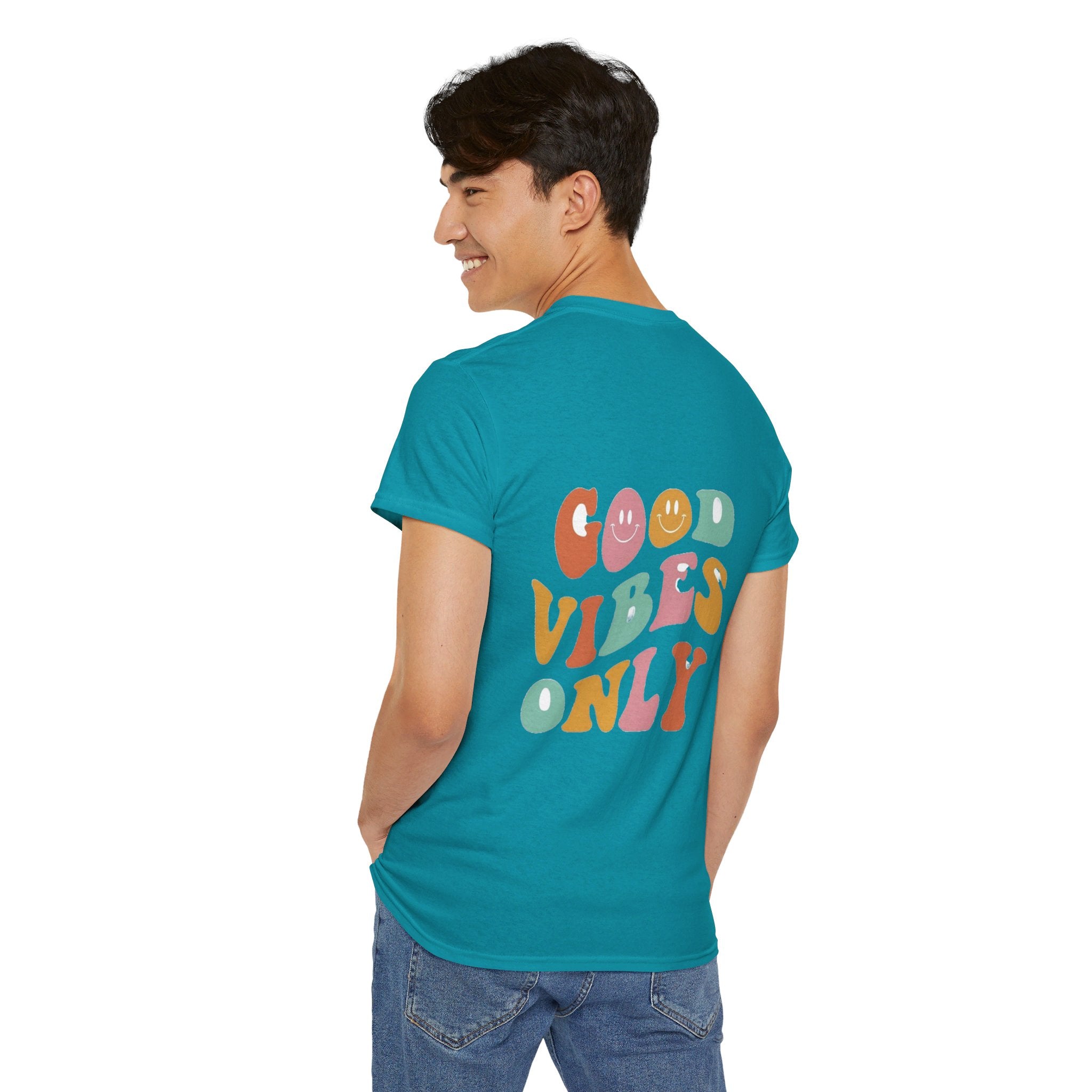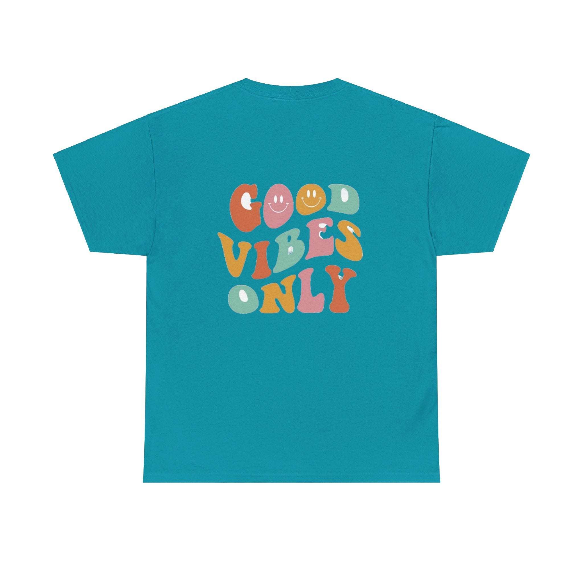 Cotton T-Shirt With Blue Green Logo and GOOD VIBES ONLY Design on Back of Shirt