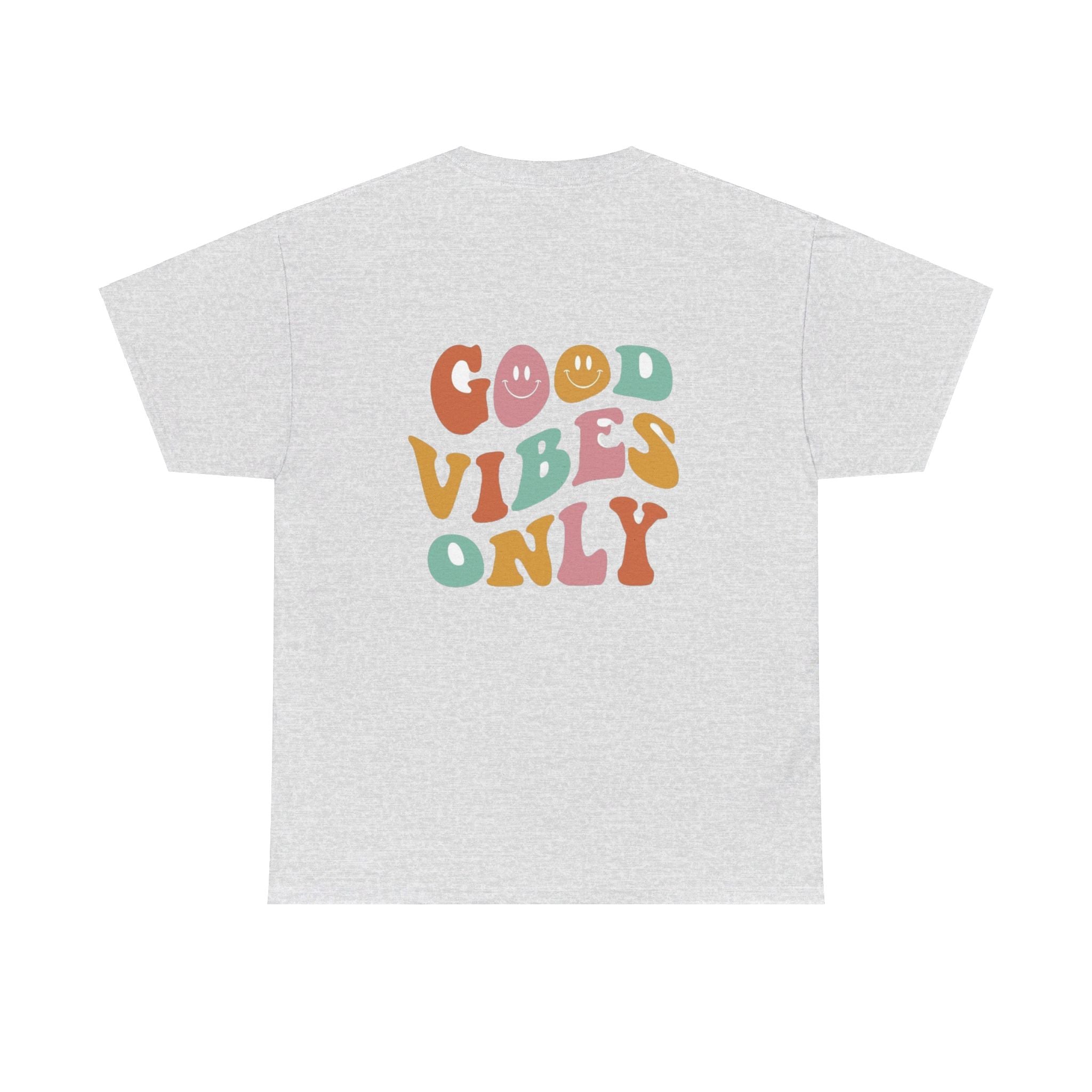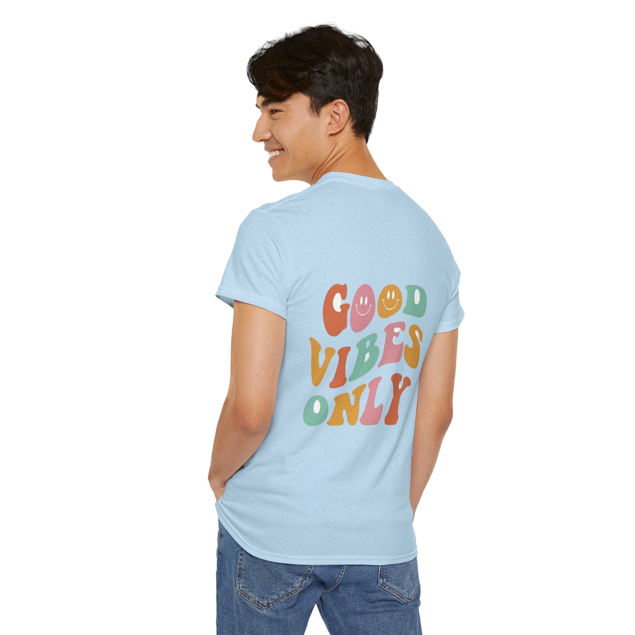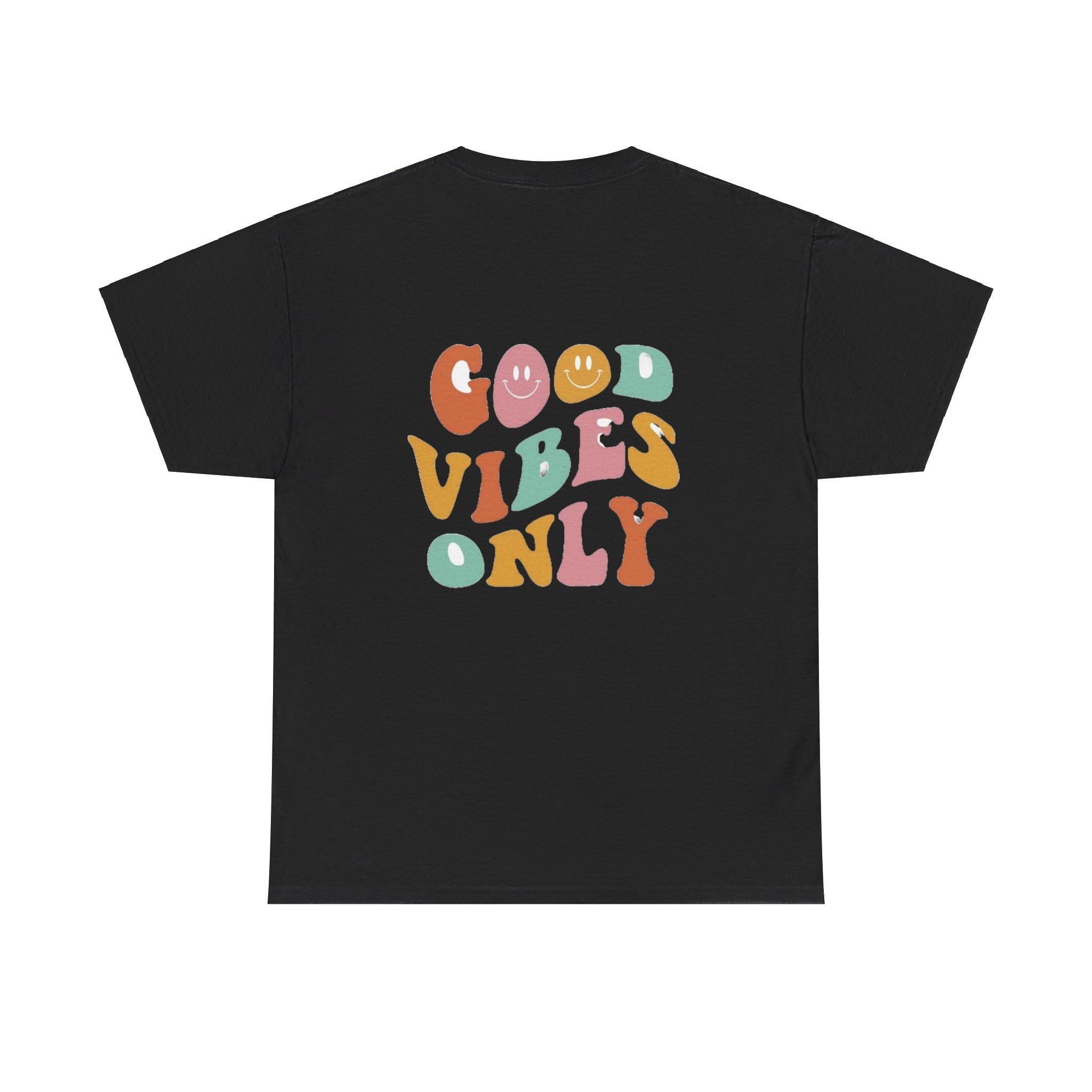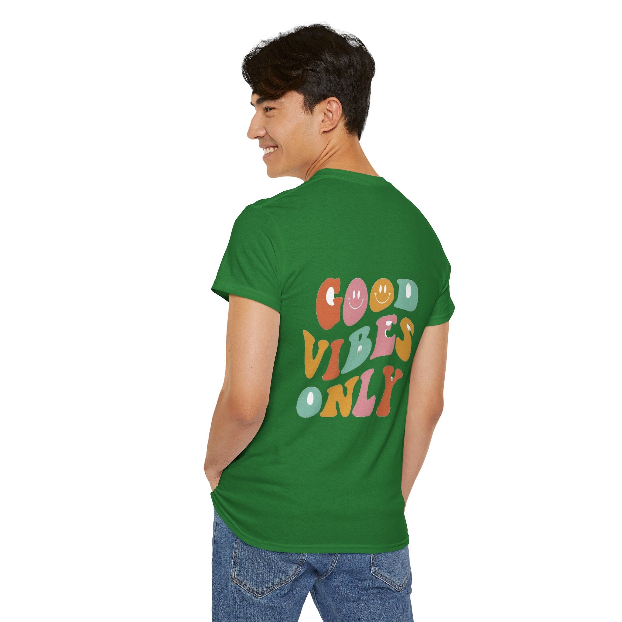 Cotton T-Shirt With Blue Green Logo and GOOD VIBES ONLY Design on Back of Shirt