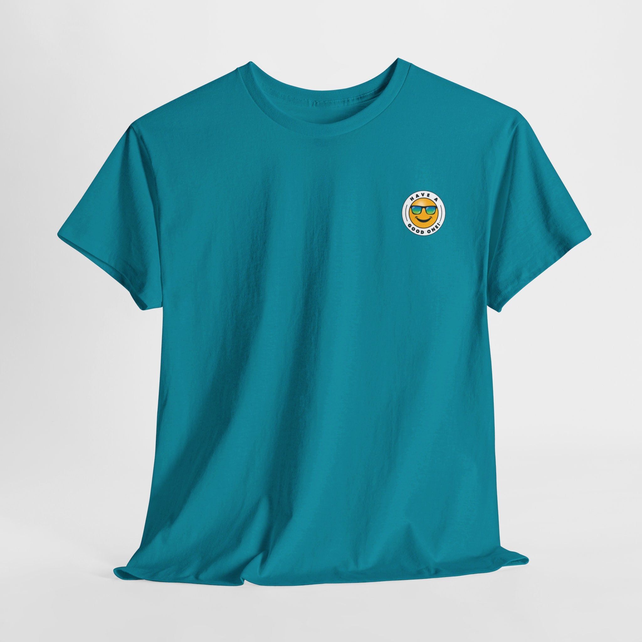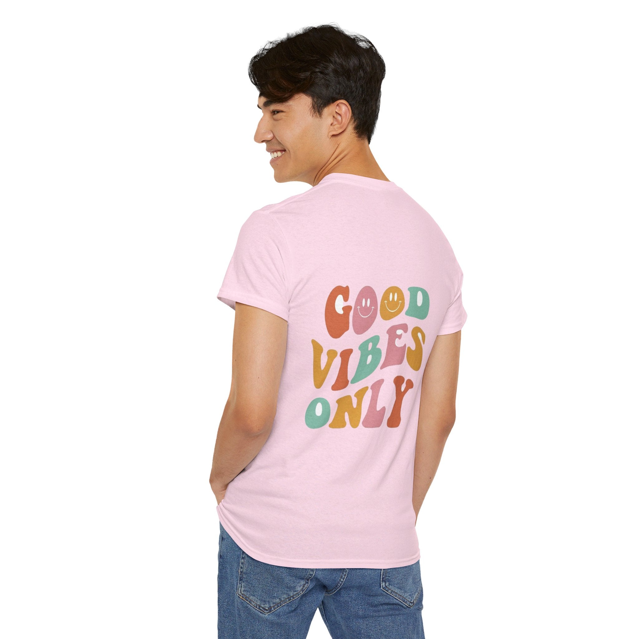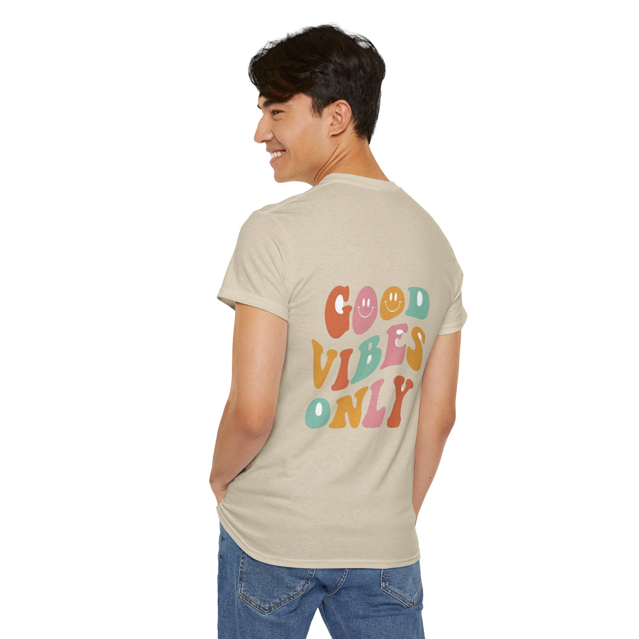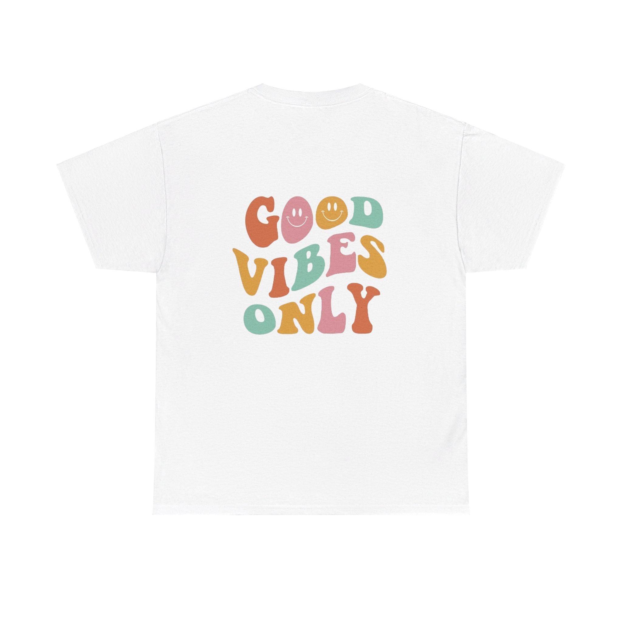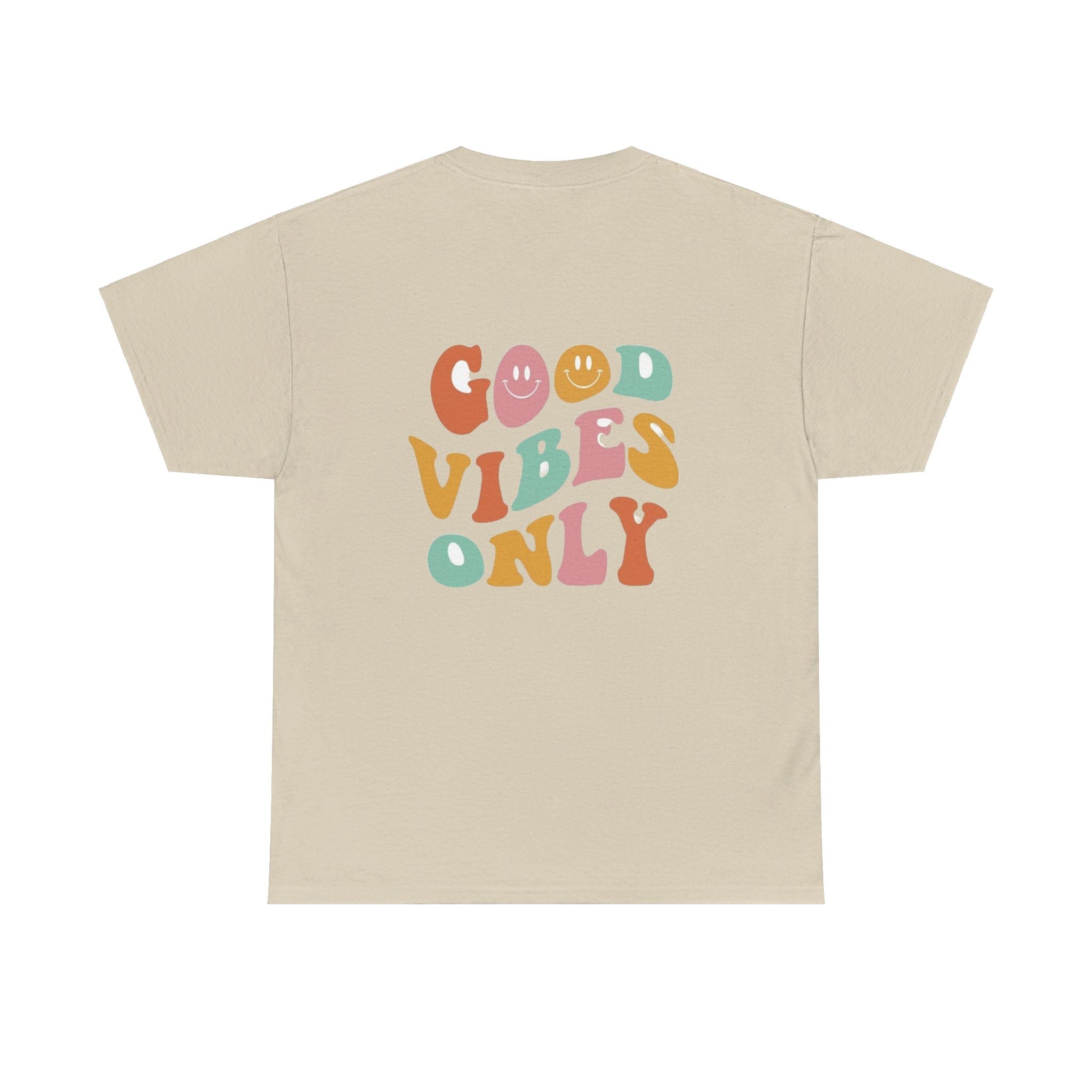 Cotton T-Shirt With Blue Green Logo and GOOD VIBES ONLY Design on Back of Shirt