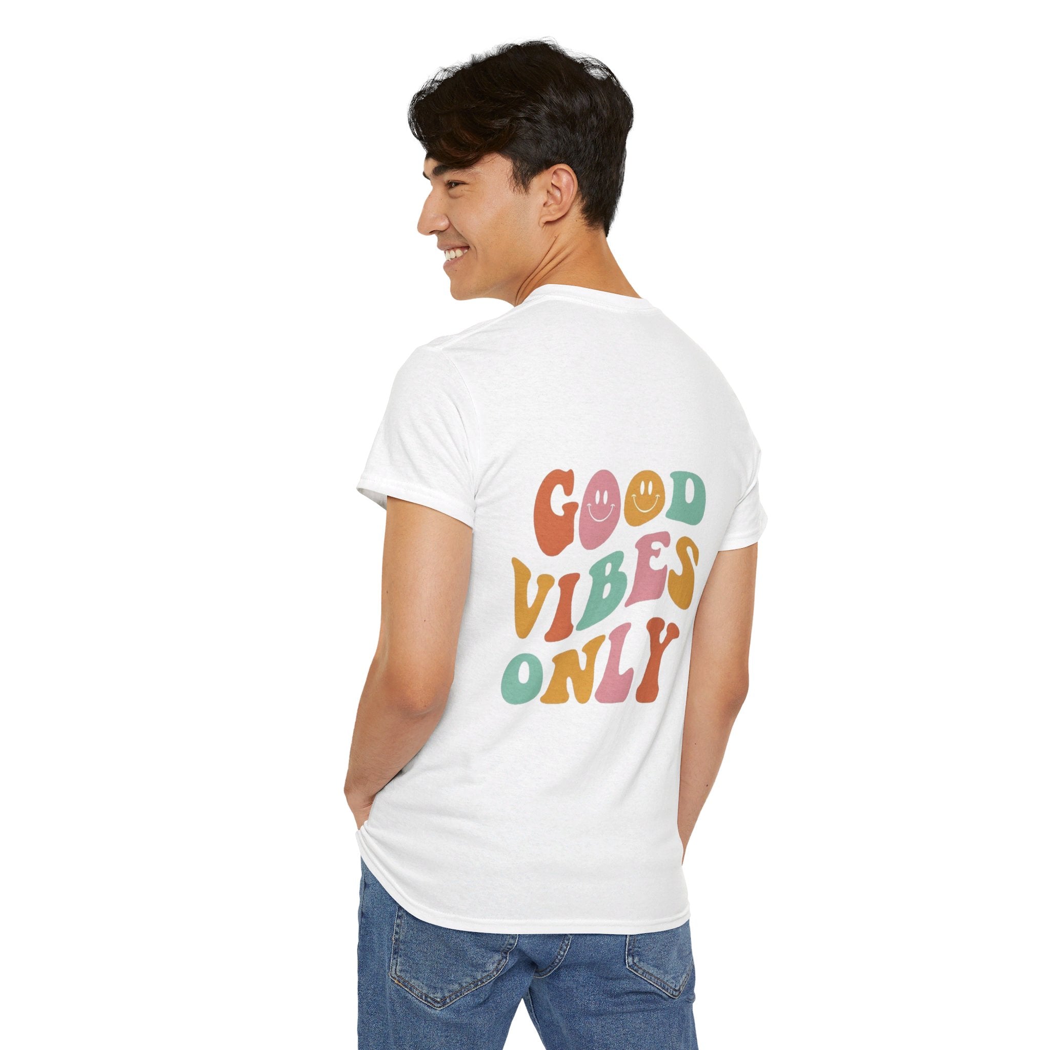 GOOD VIBES ONLY! Hip and comfy casual t-shirt for the beach, boat, sporting event, or just relaxing wherever you are! You can be cool and spread the good vibes with this fun t-shirt! It a relaxed, classic fit designed for comfort and style. It is made from 100% cotton and is both durable and soft. It is unisex so it wears well on anyone and everyone. Let's all Have A Good One! Great vibes, good times, pass it on!