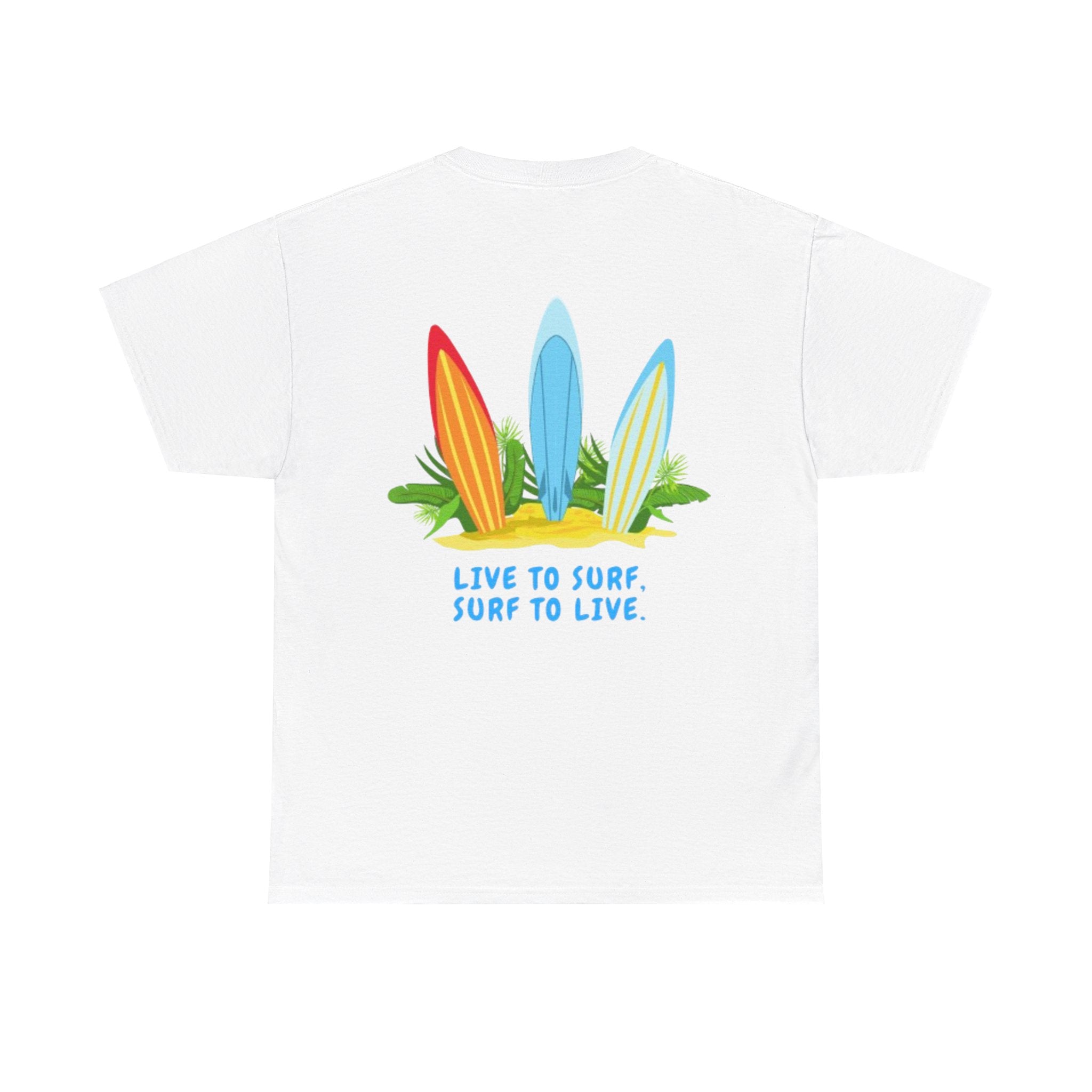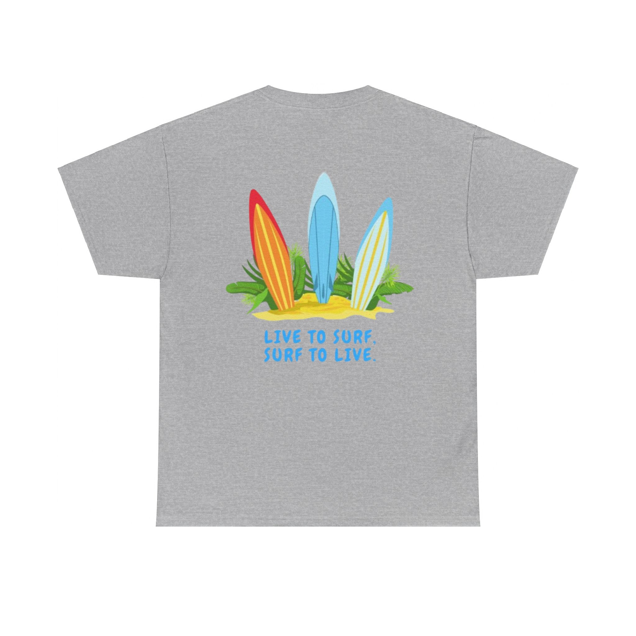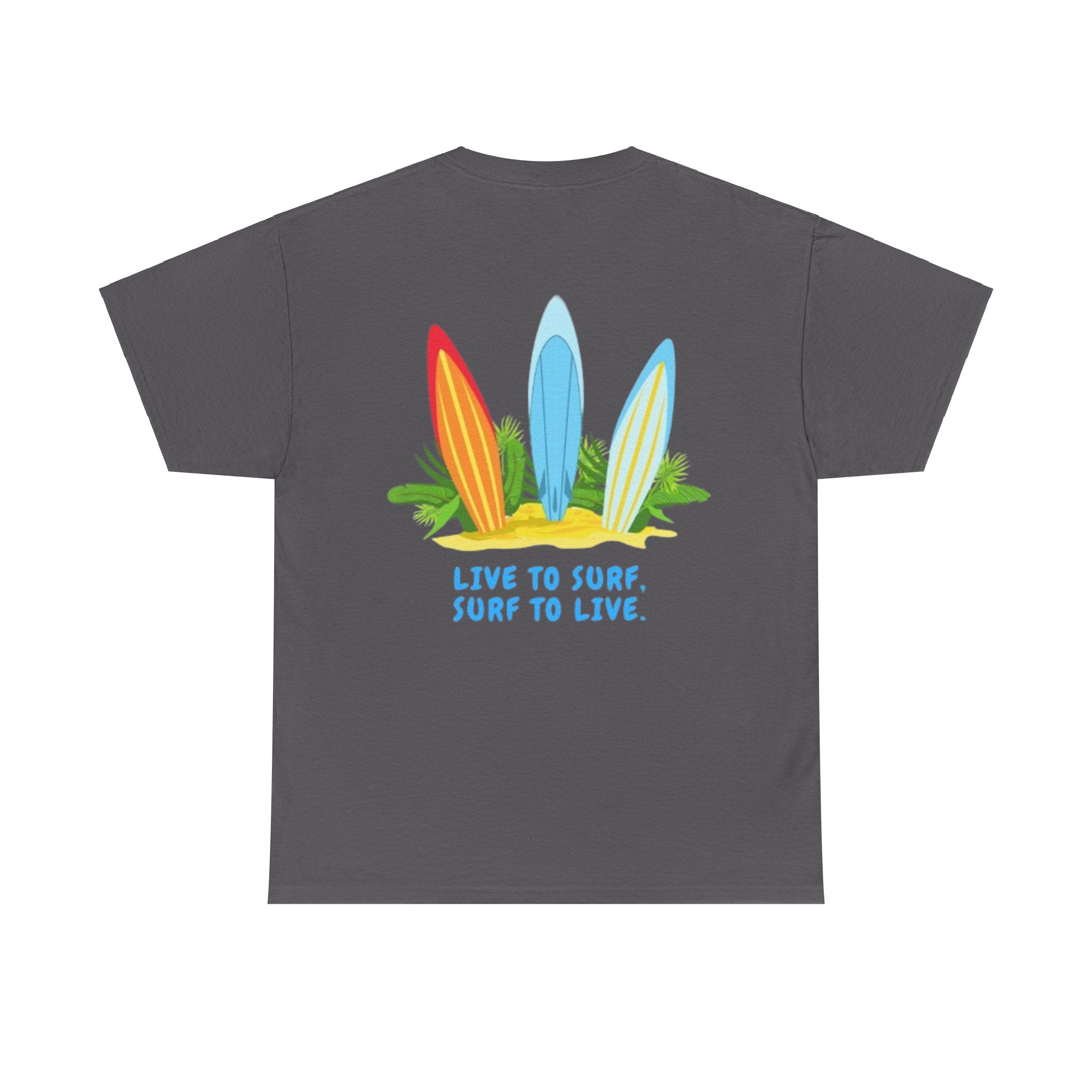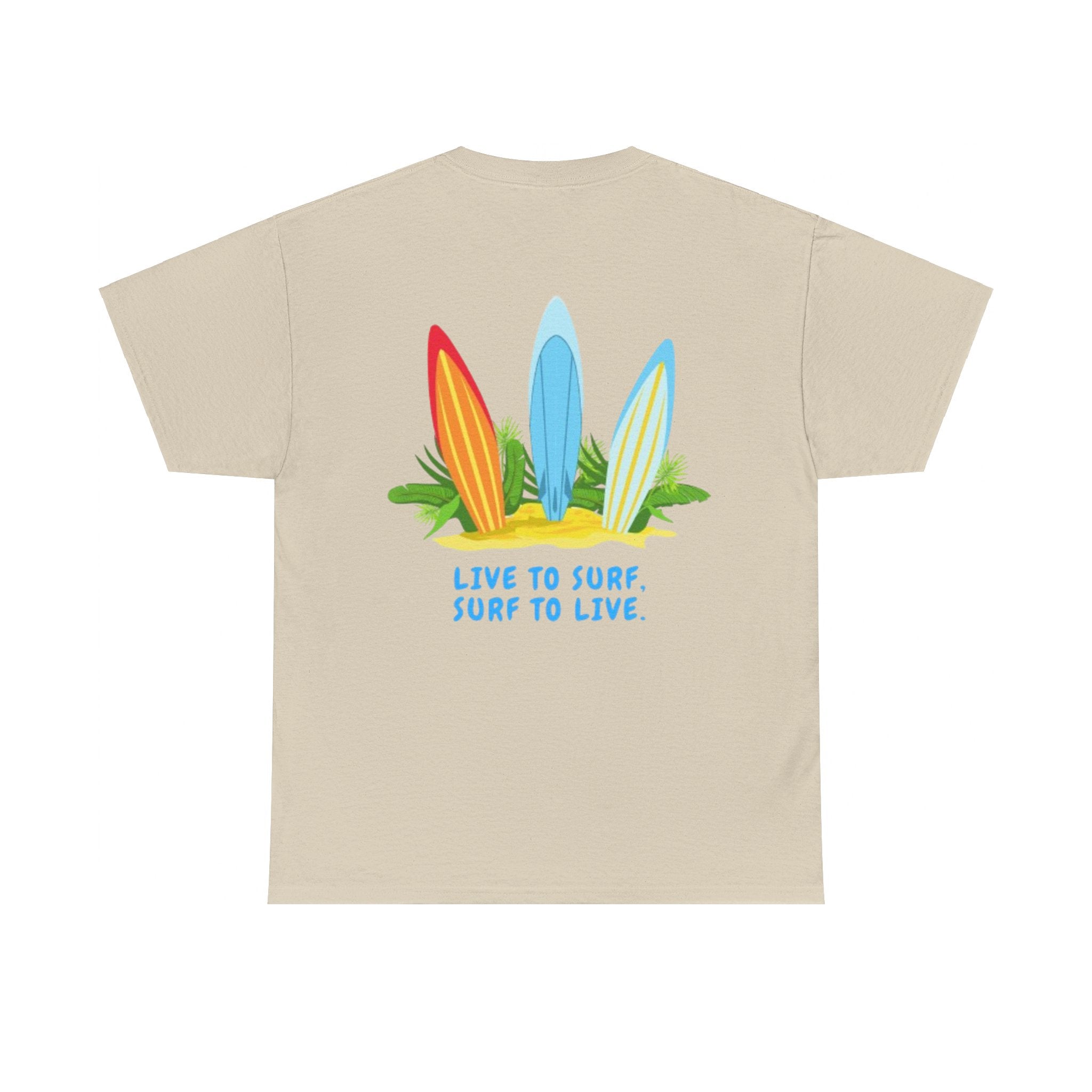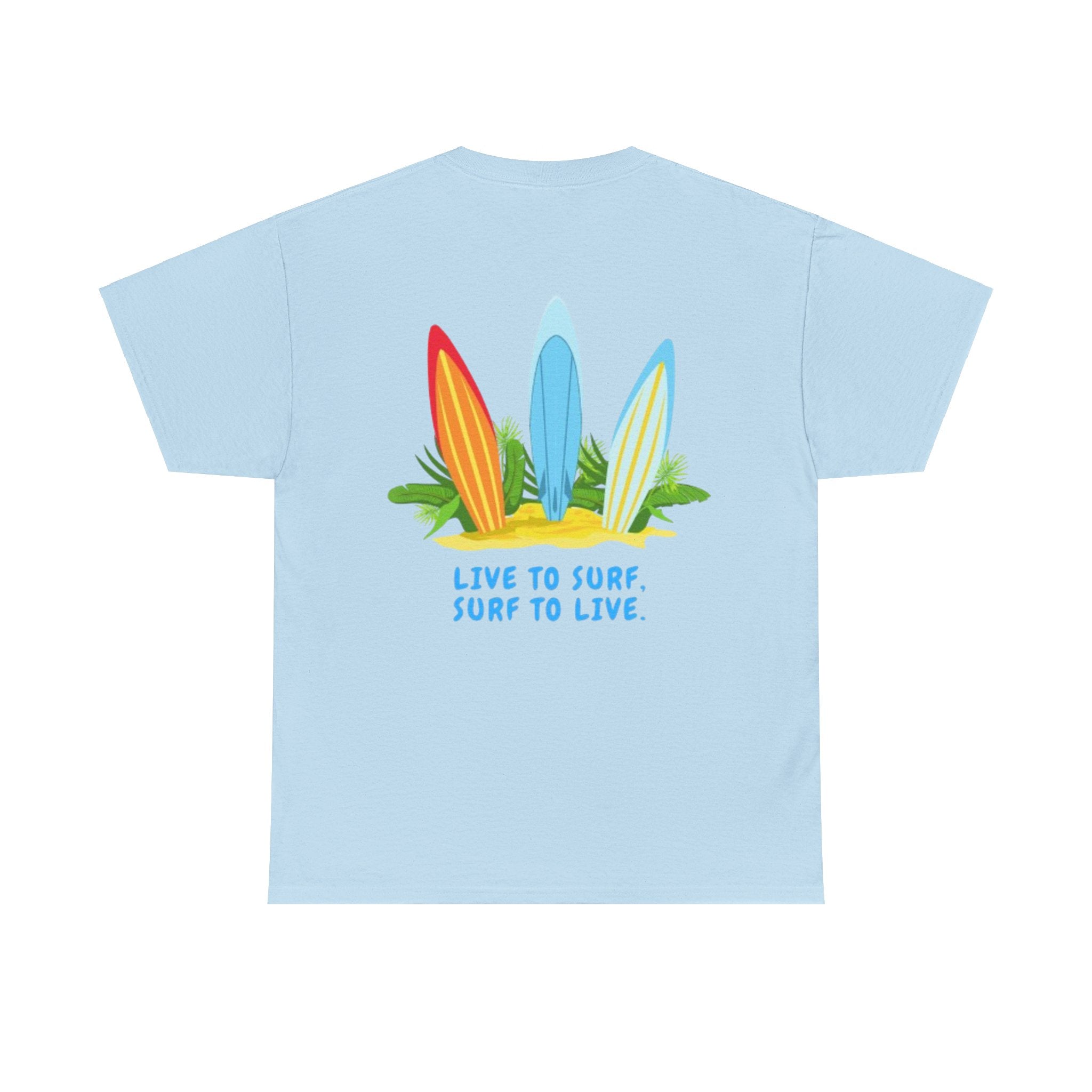 Cotton T-Shirt With Blue Green Have A Good One Logo on Front and Live To Surf on Back of Shirt