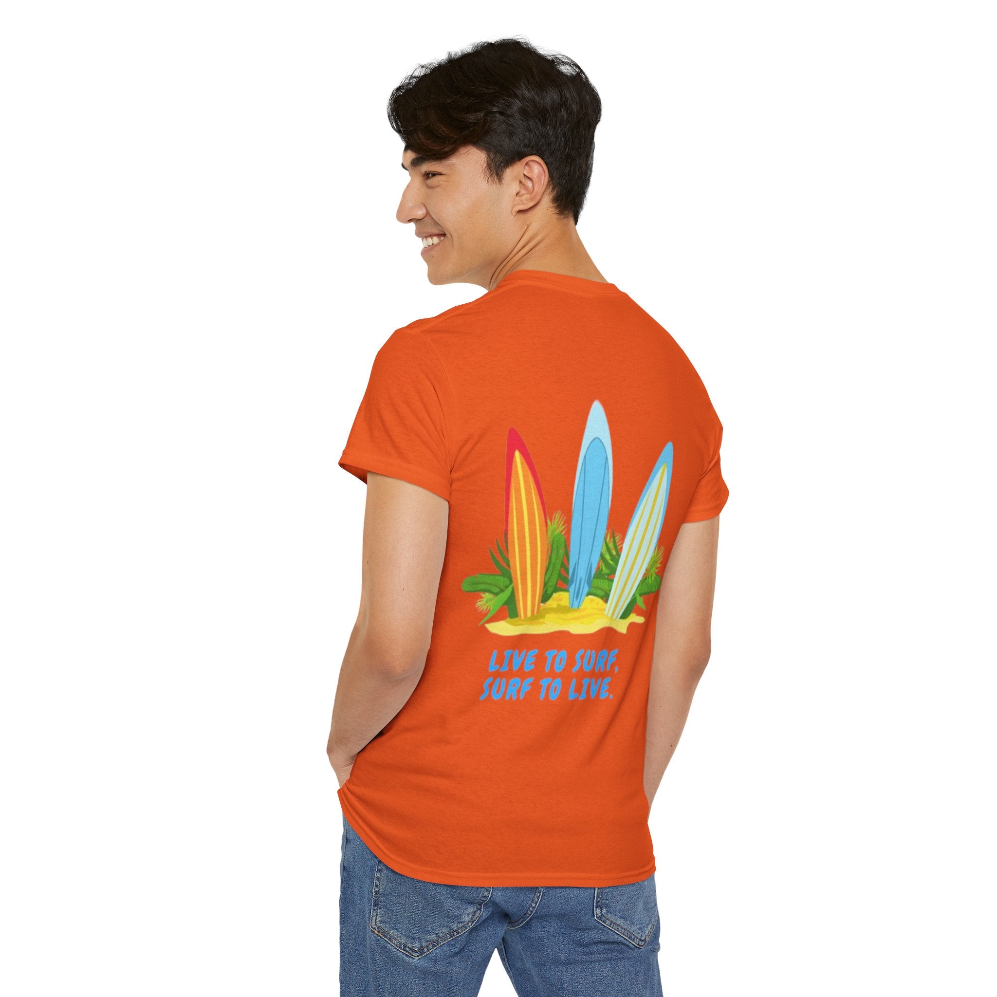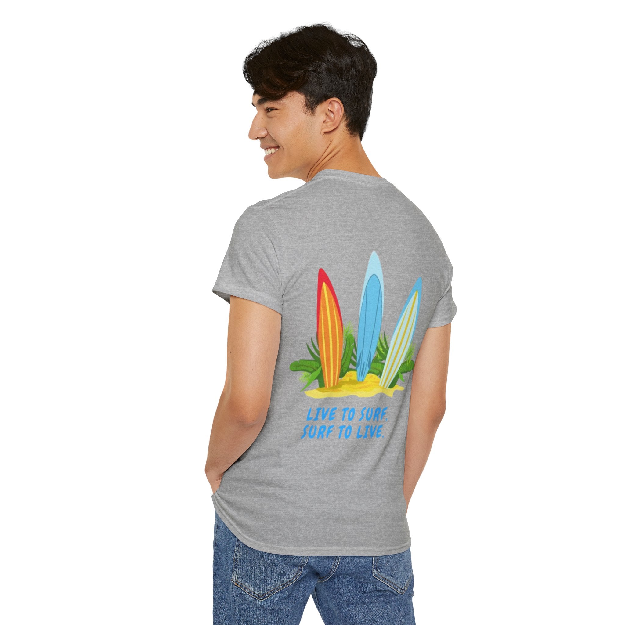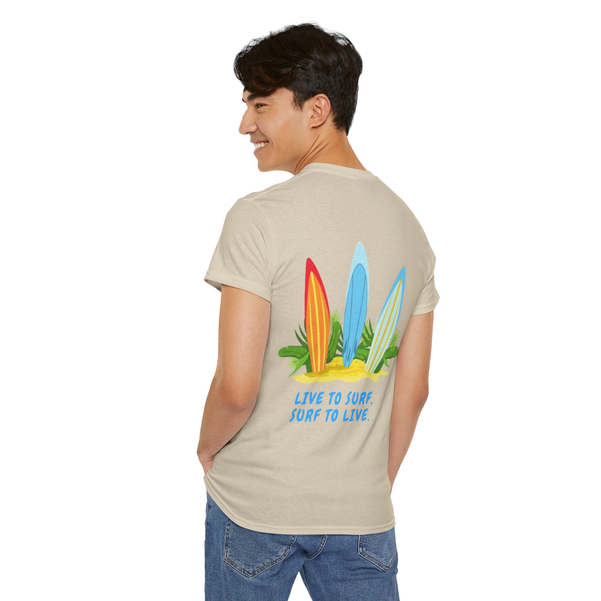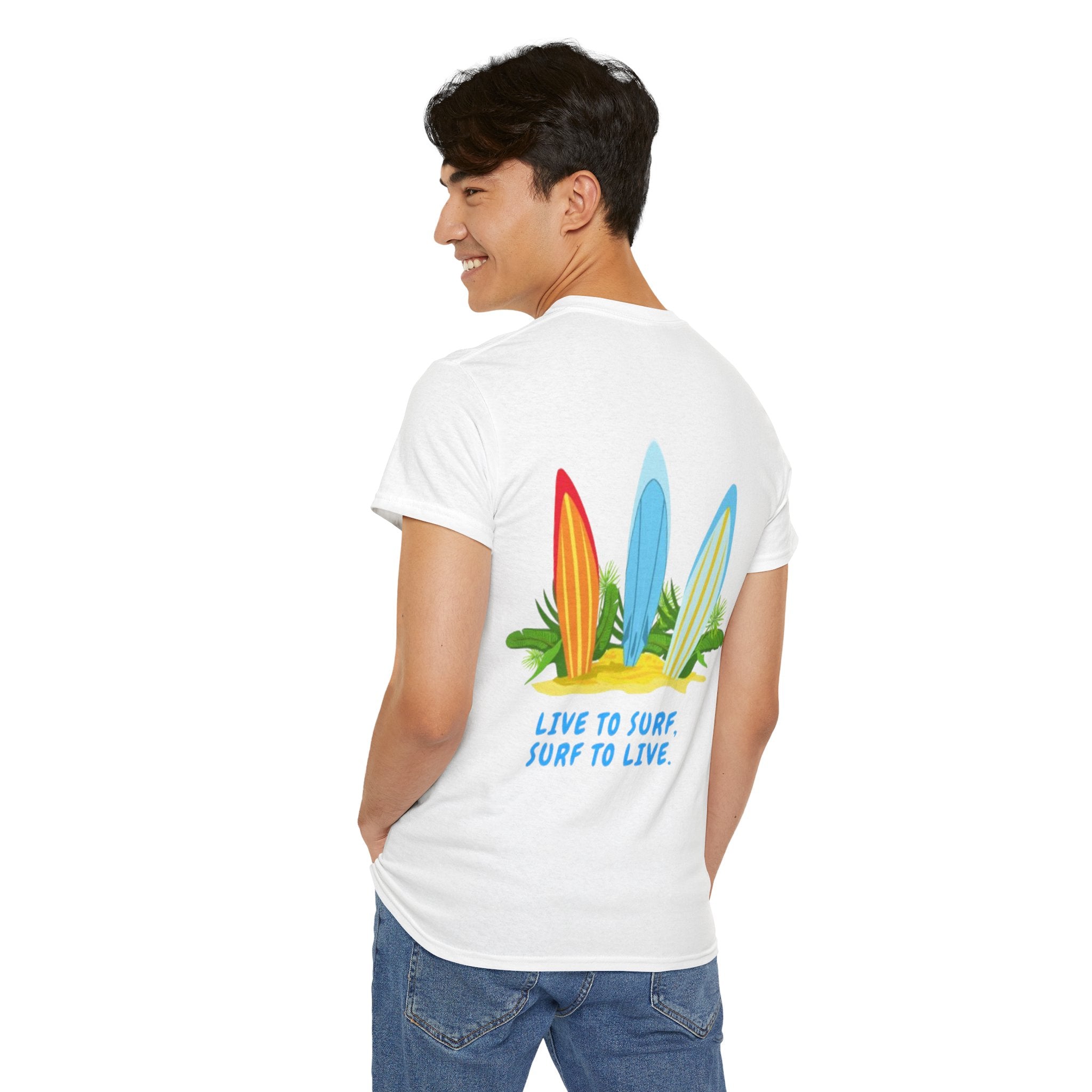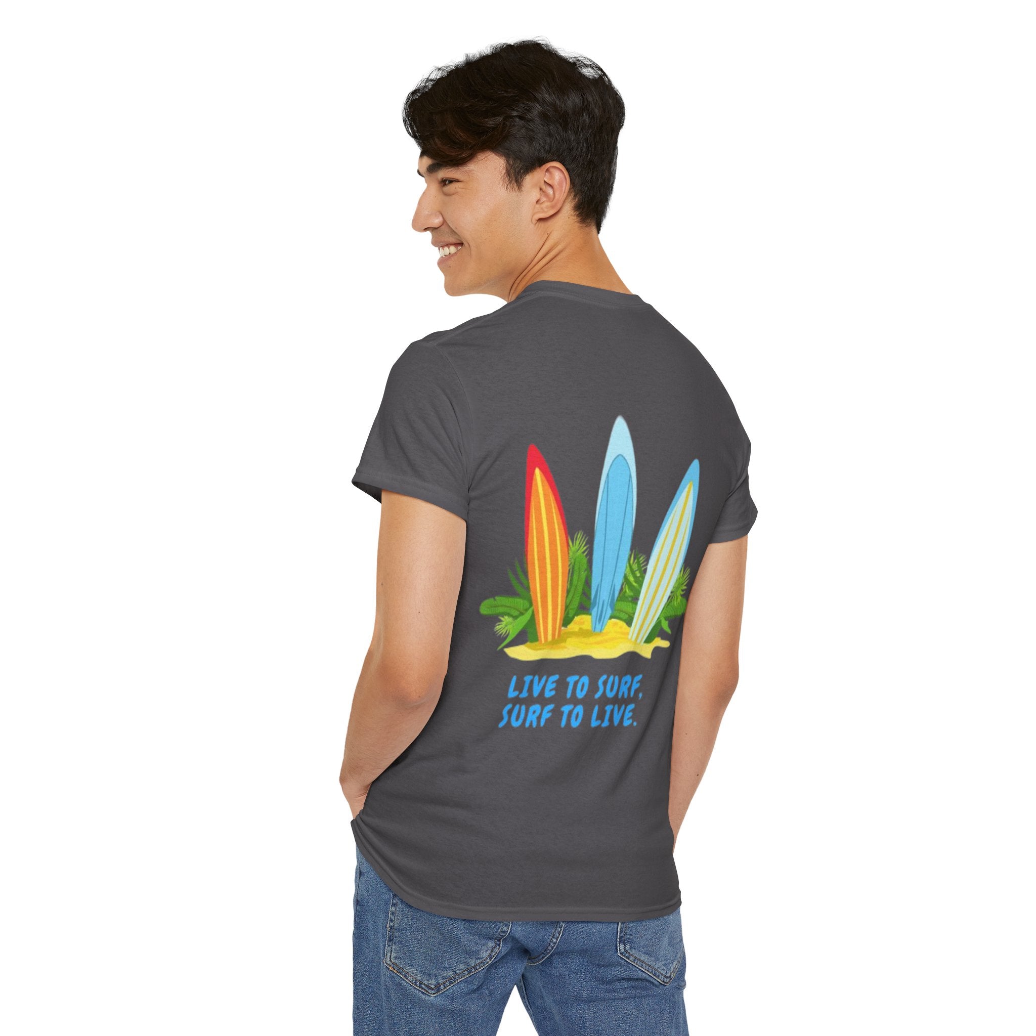 Cotton T-Shirt With Blue Green Have A Good One Logo on Front and Live To Surf on Back of Shirt
