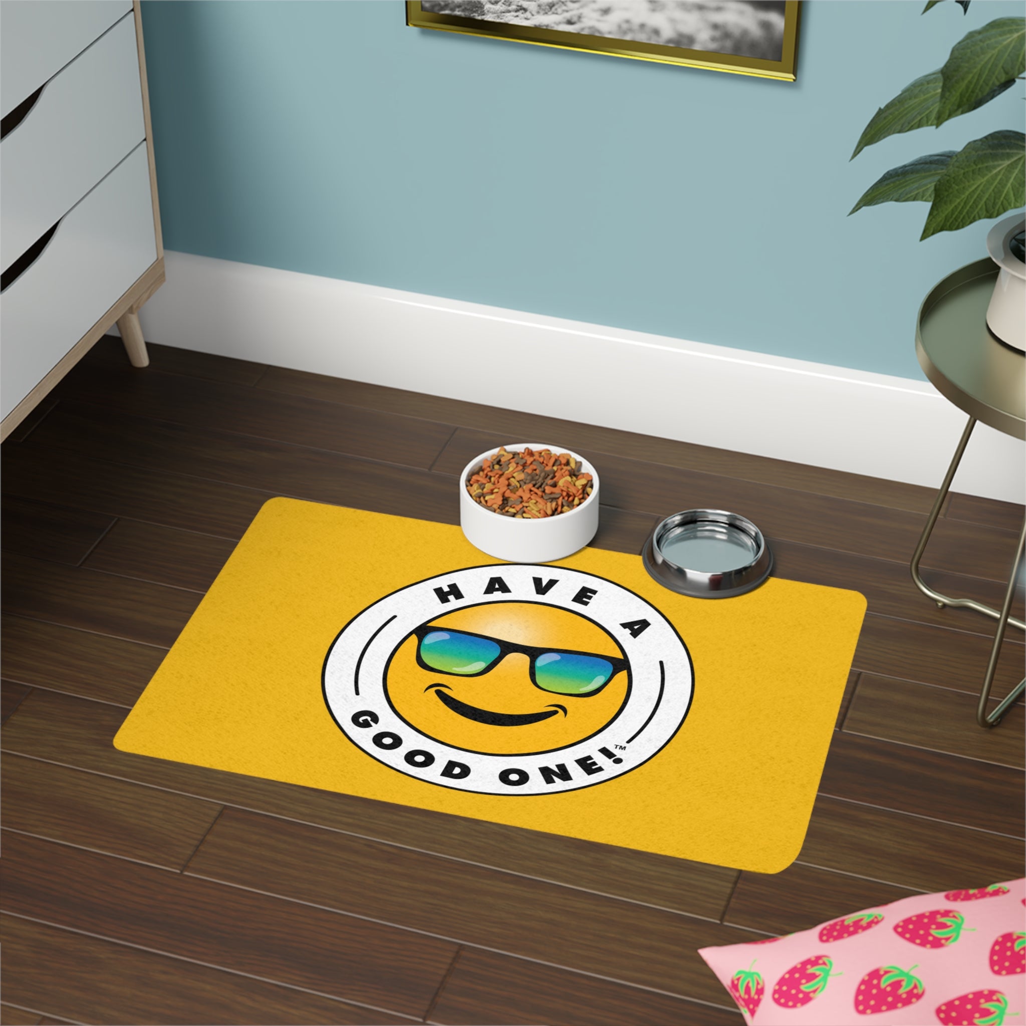 Posh Pet Have A Good One! Food Mat - Yellow Color With Blue Green Logo
