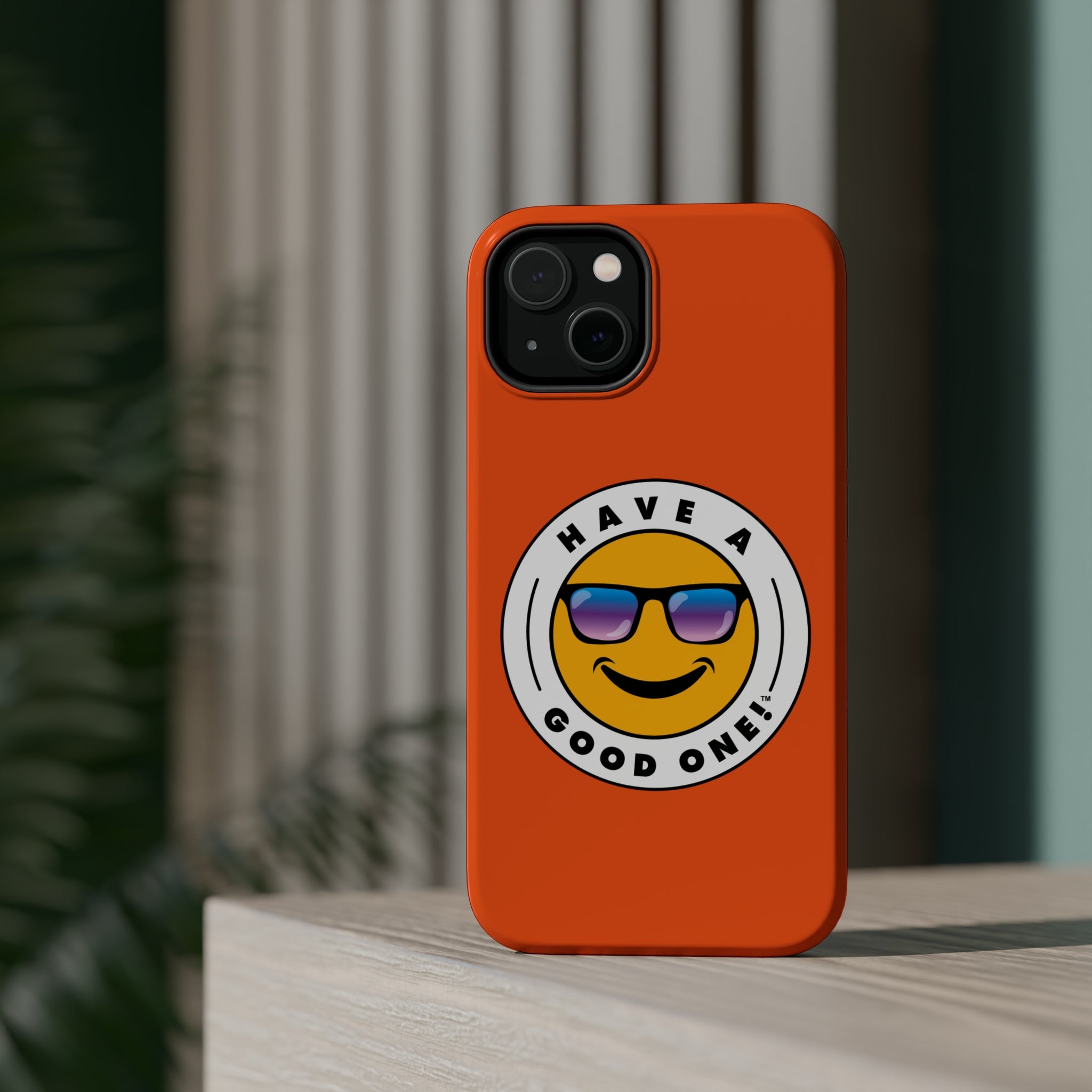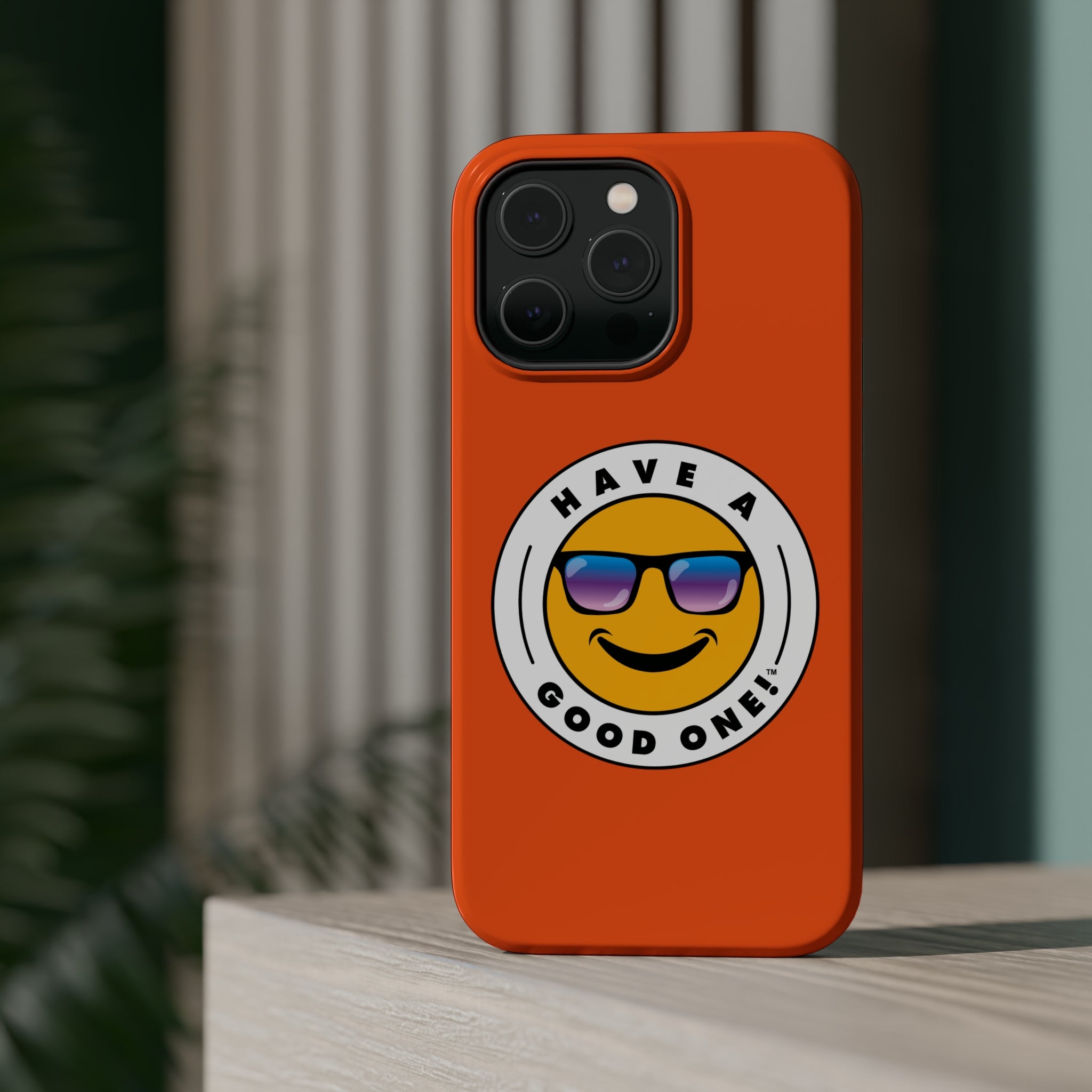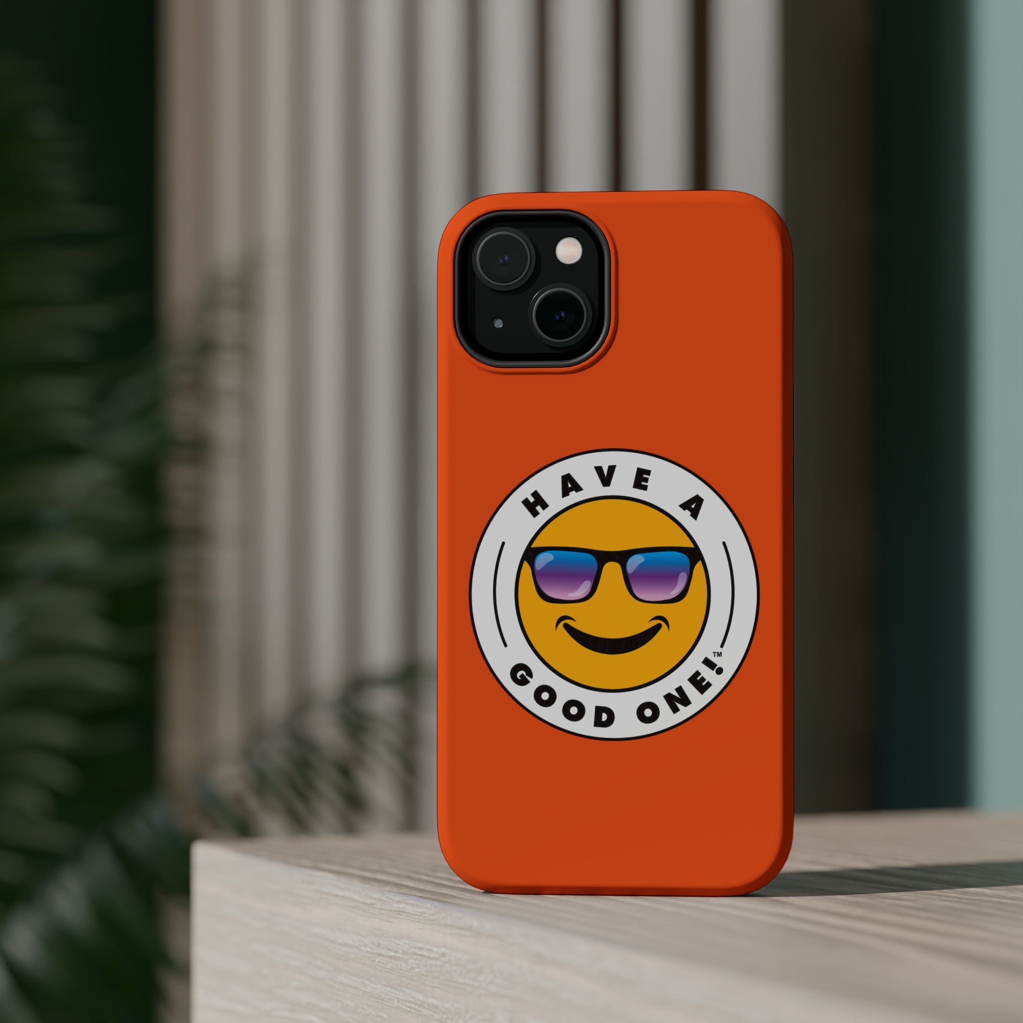 Have fun on the run with our Have A Good One phone cases! Wherever you go this phone case is sure to brighten your day and bring a smile to your face! This is where aesthetics meet function with our MagSafe case. This case delivers impeccable phone protection thanks to its durable, flexible, impact-resistant nature. It has an outer polycarbonate shell and inner black lining to protect against scratches and minor bumps. Each case comes with an embedded magnet to enhance compatibility with Apple MagSafe accessories. The case is available in glossy or matte finish so you can select which one you prefer. We have all of the popular sizes so you are sure to find the best fit for your phone. Lots of vibrant and fun colors to choose from which will surely make you feel the Have A Good One vibe every time you use it!