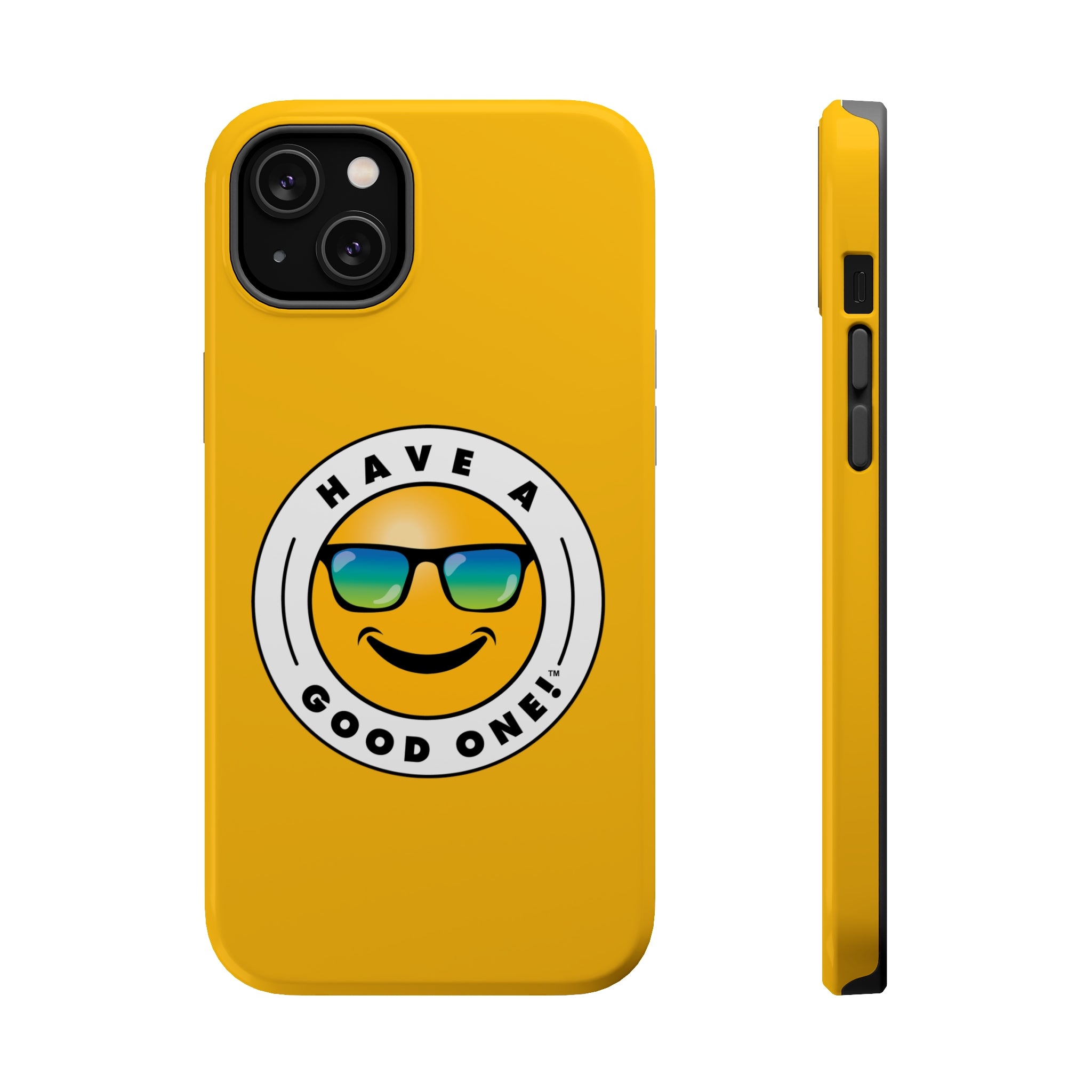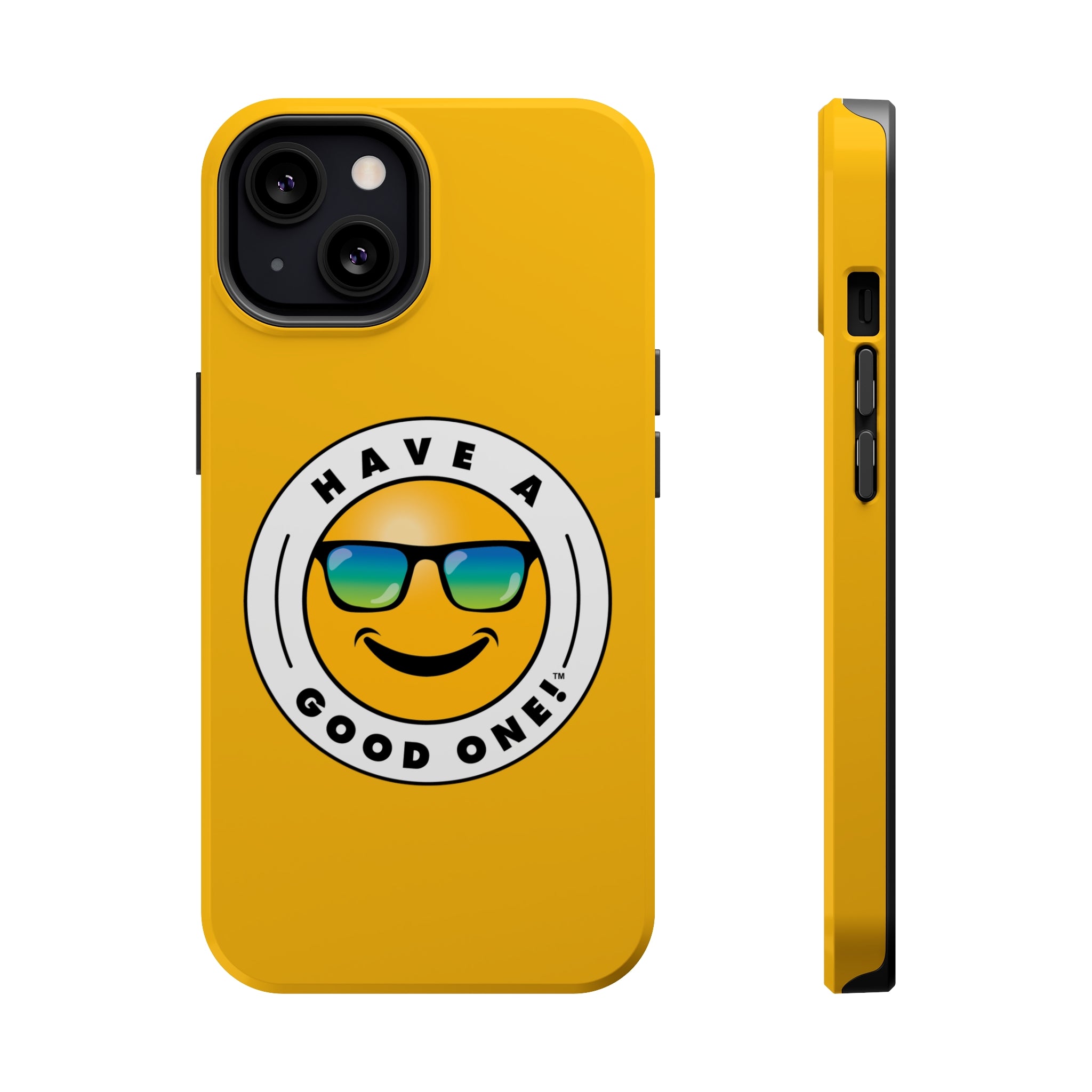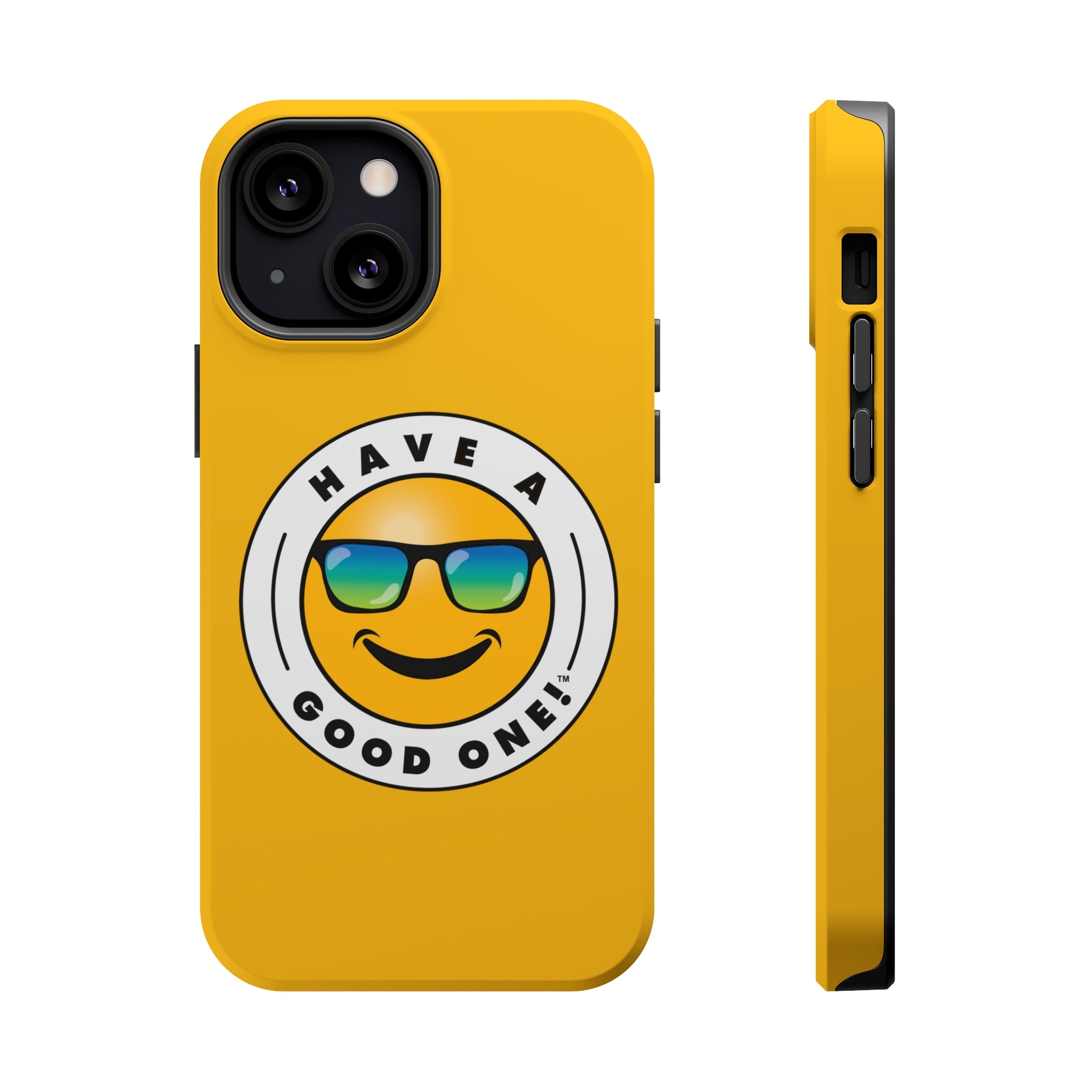 Fun On The Run MagSafe Tough Phone Case - Yellow Color With Blue Green Have a Good One! Logo