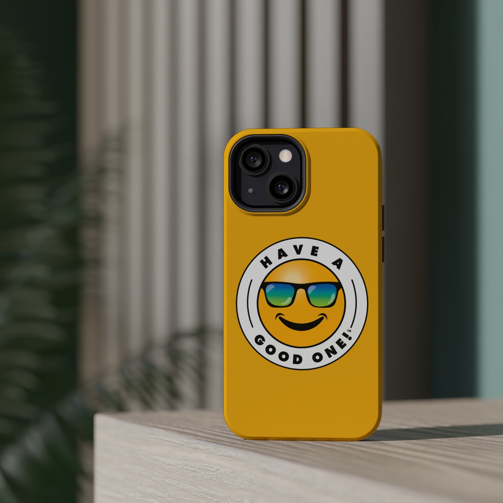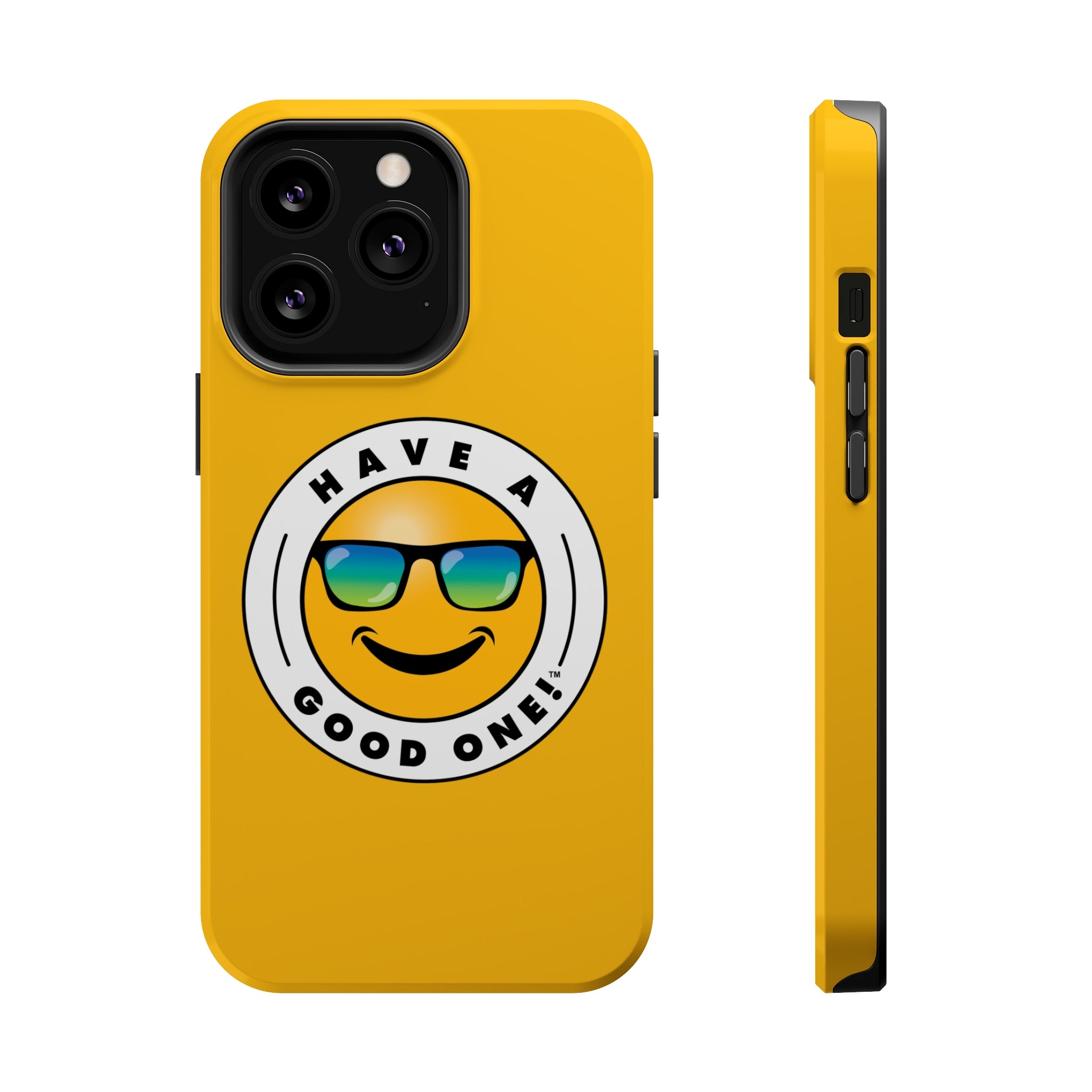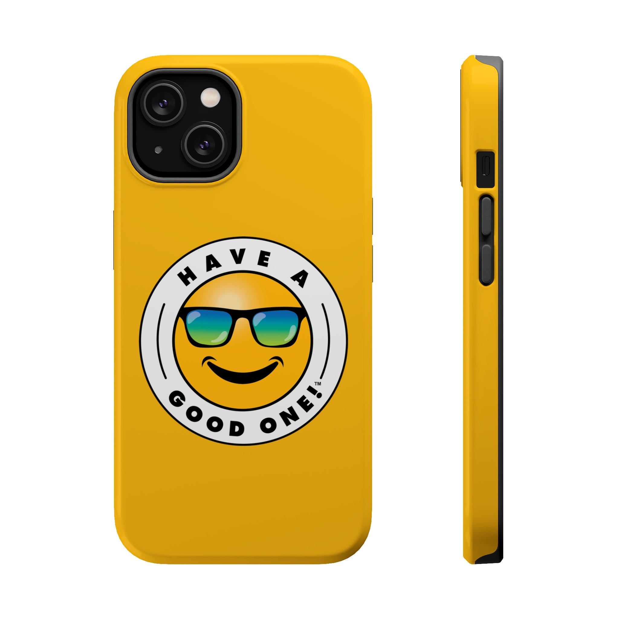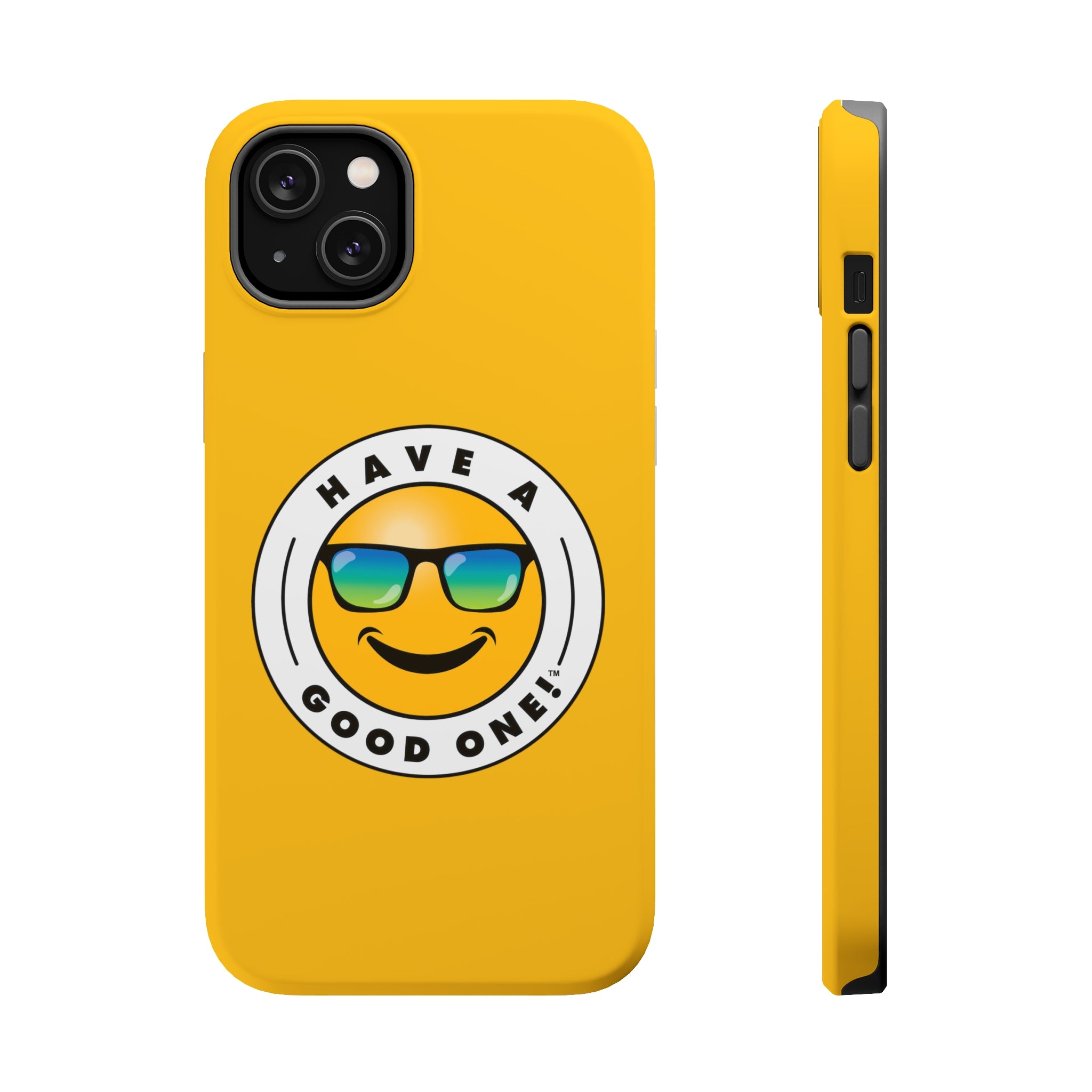 Fun On The Run MagSafe Tough Phone Case - Yellow Color With Blue Green Have a Good One! Logo