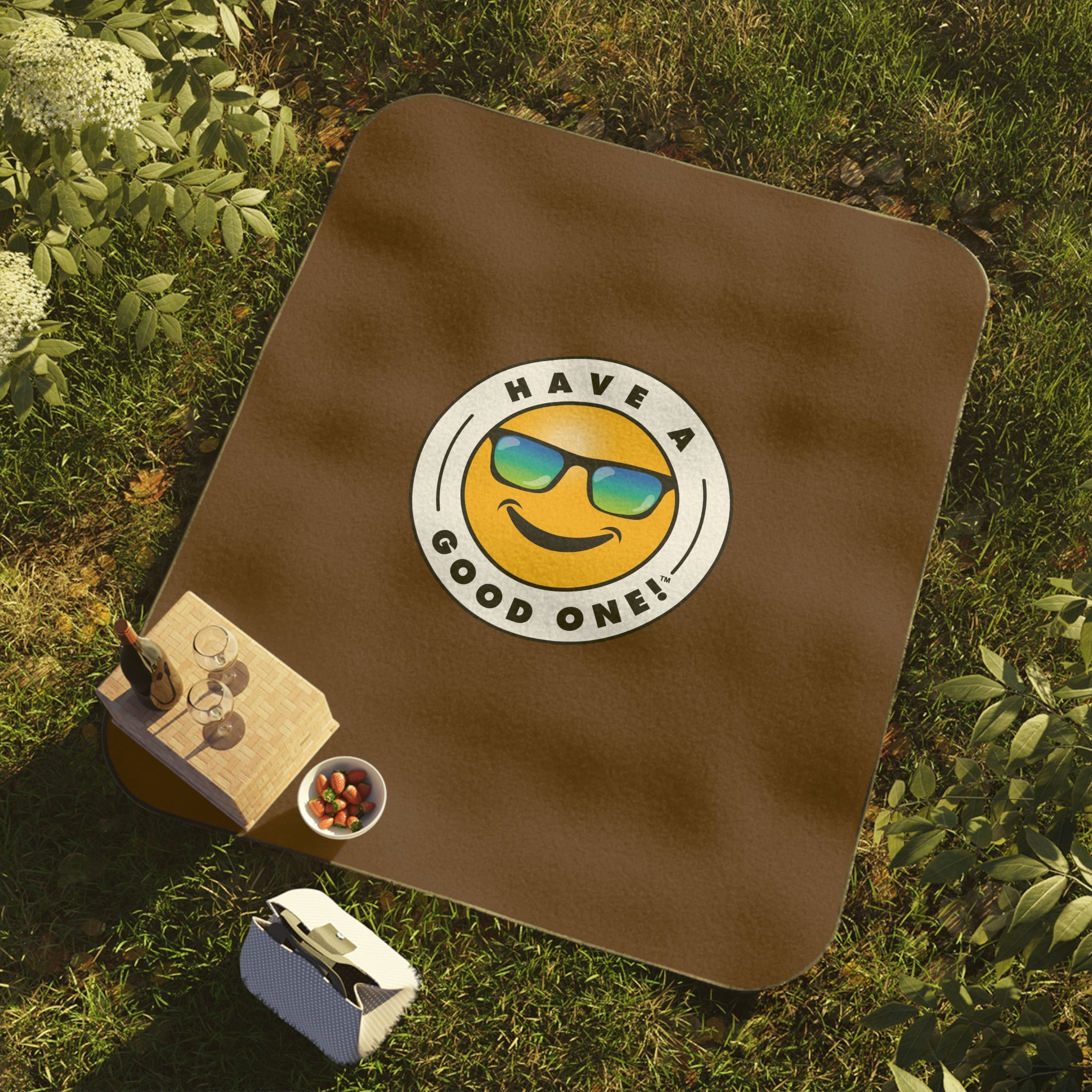 Grab N’ Go Picnic Blanket – Brown Color With Blue Green Have A Good One! Logo