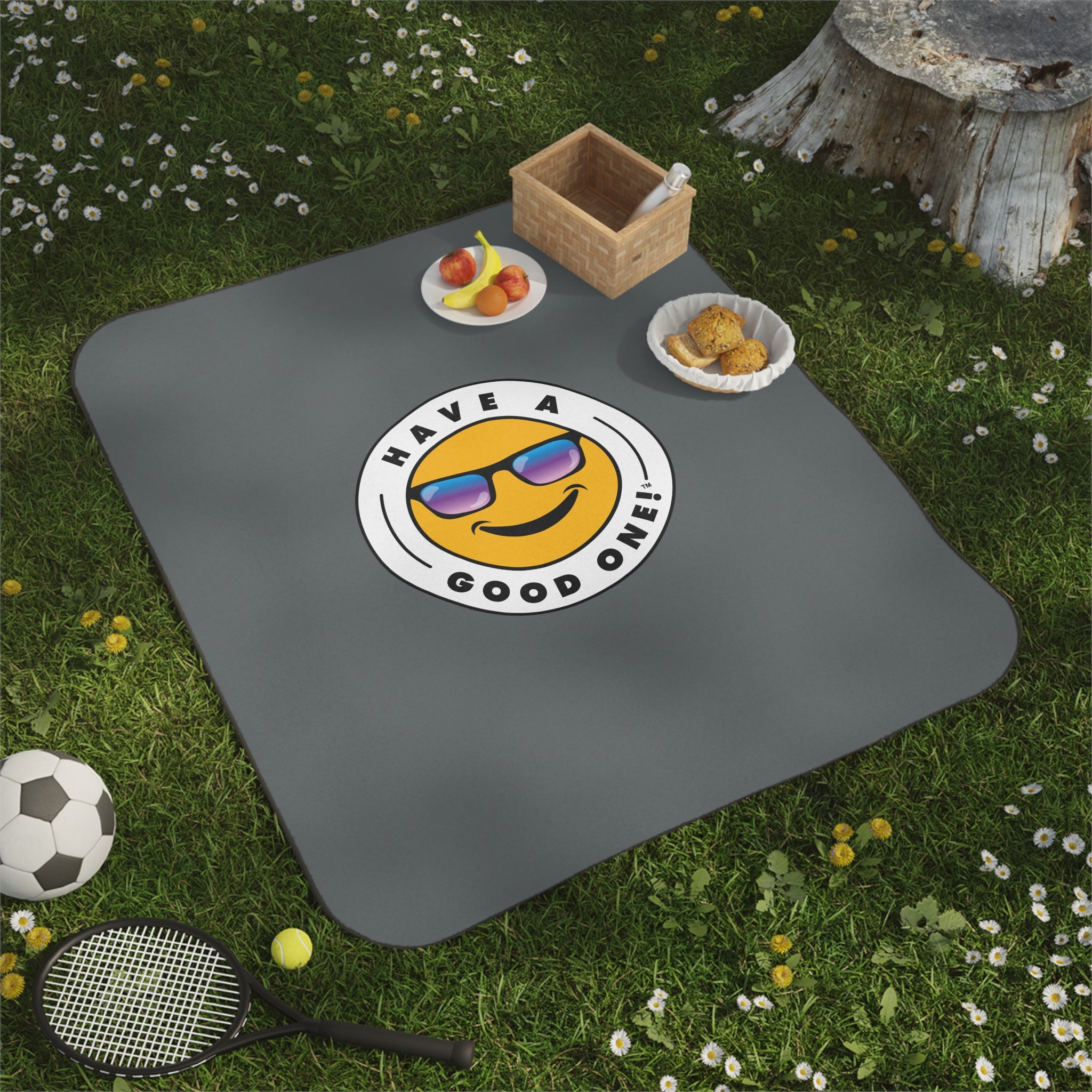 Grab N’ Go Picnic Blanket – Dark Grey Color With Blue Purple Have A Good One! Logo