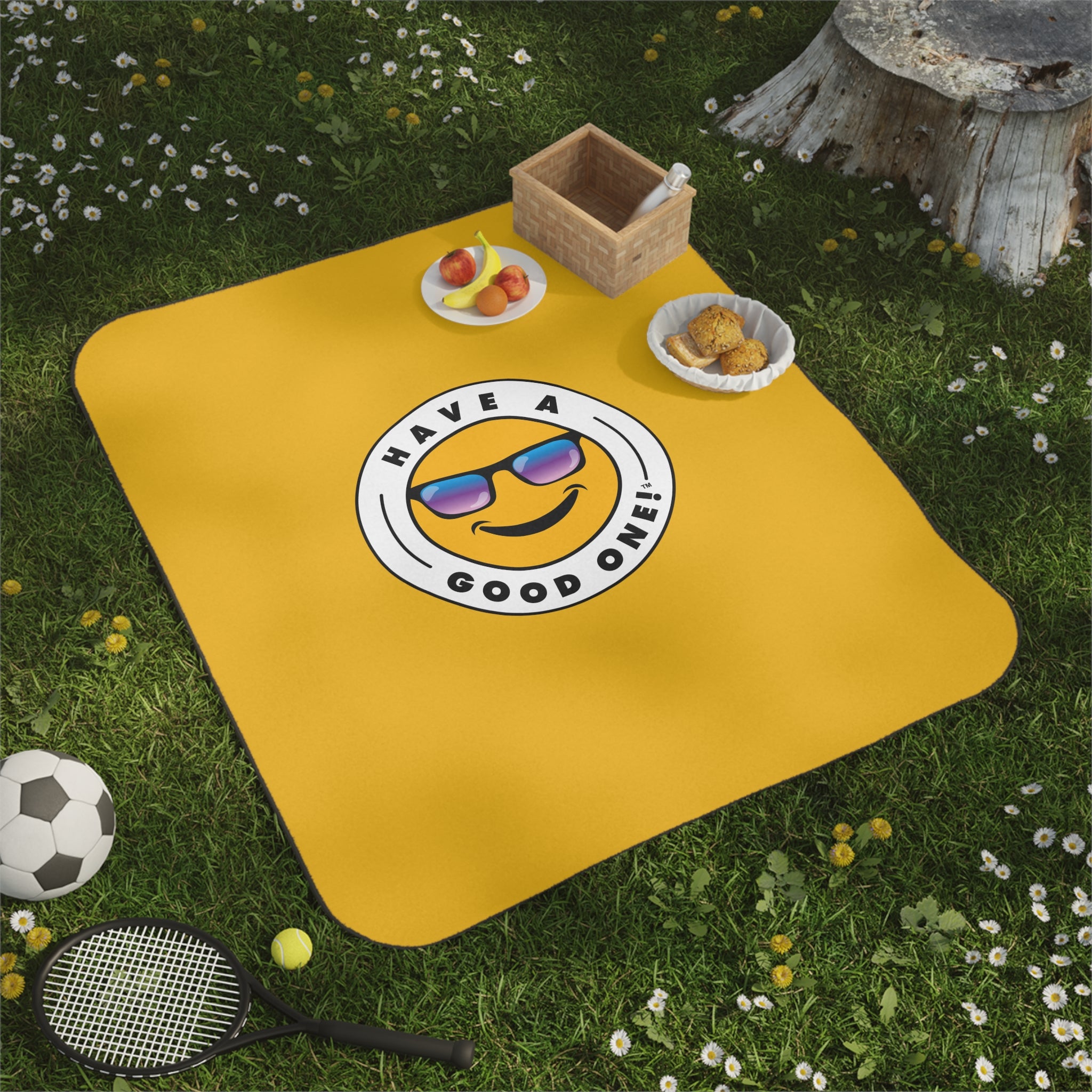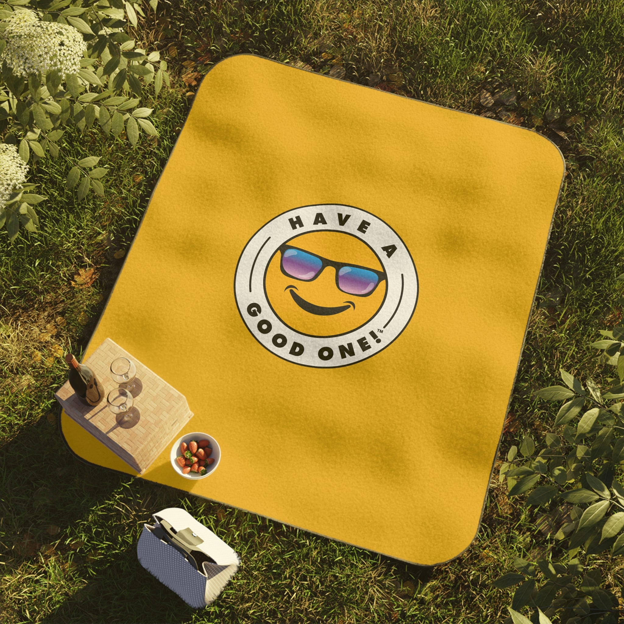Grab N’ Go Picnic Blanket – Yellow Color With Blue Purple Have A Good One! Logo