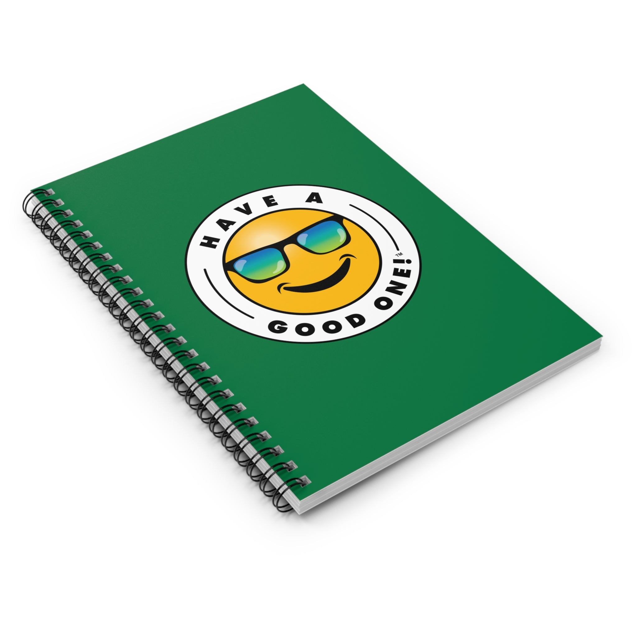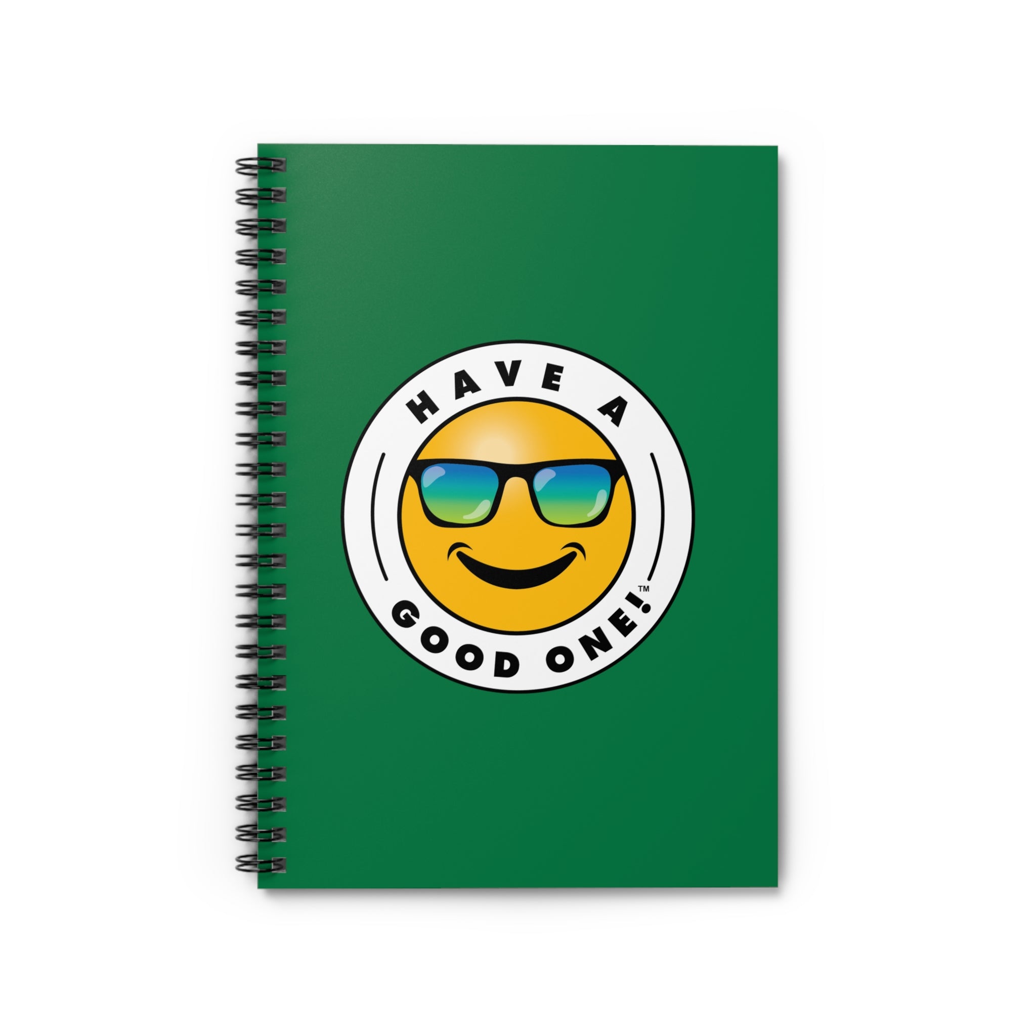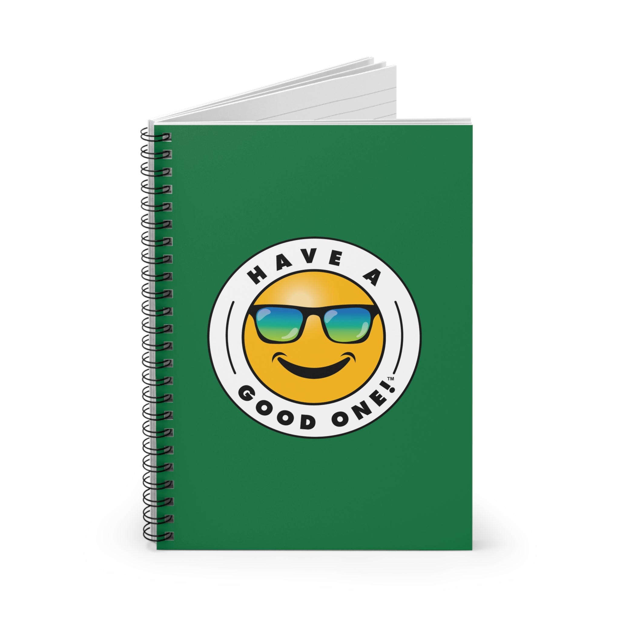 Fun Spiral Lined Notebook - Dark Green Color With Blue and Green Have A Good One! Logo