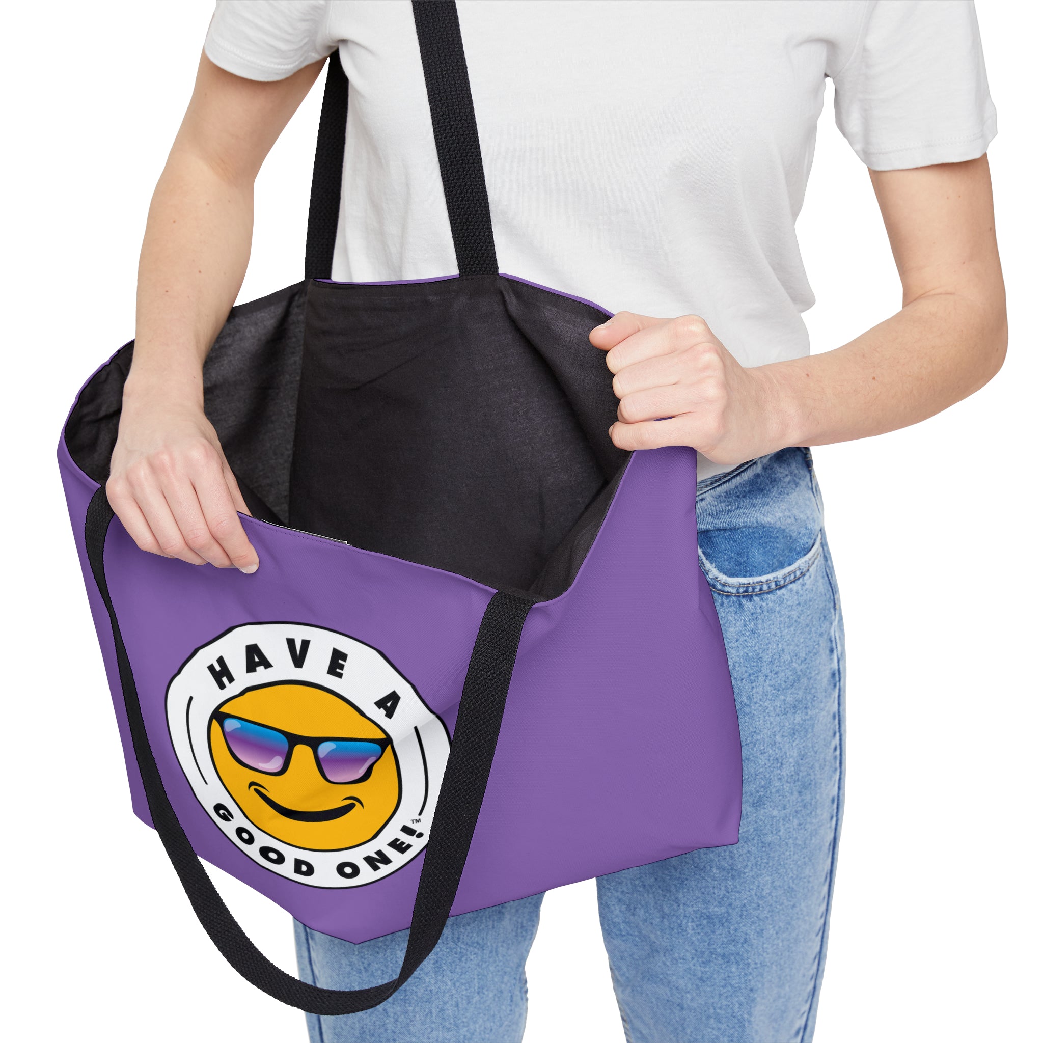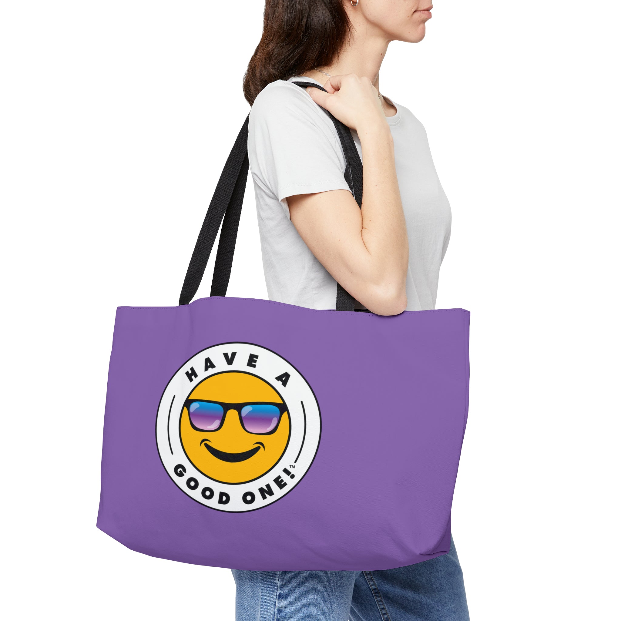 Pack up your belongings and head out to the beach, store, errands, pick up the kids up, head to the gym, travel or go just about anywhere! This versatile bag is light weight and made with very high quality craftsmanship. The logo is on the front and back. This tote bag is made from polyester so it is as durable as it is fun and fashionable. Its t-bottom construction and black handles give it a sleek, classic look. Get packing and go with the Weekender Tote Bag! Wherever you are headed this bag with make it a more memorable and special trip! We know you will Have A Good One wherever life takes you with this fun tote bag!