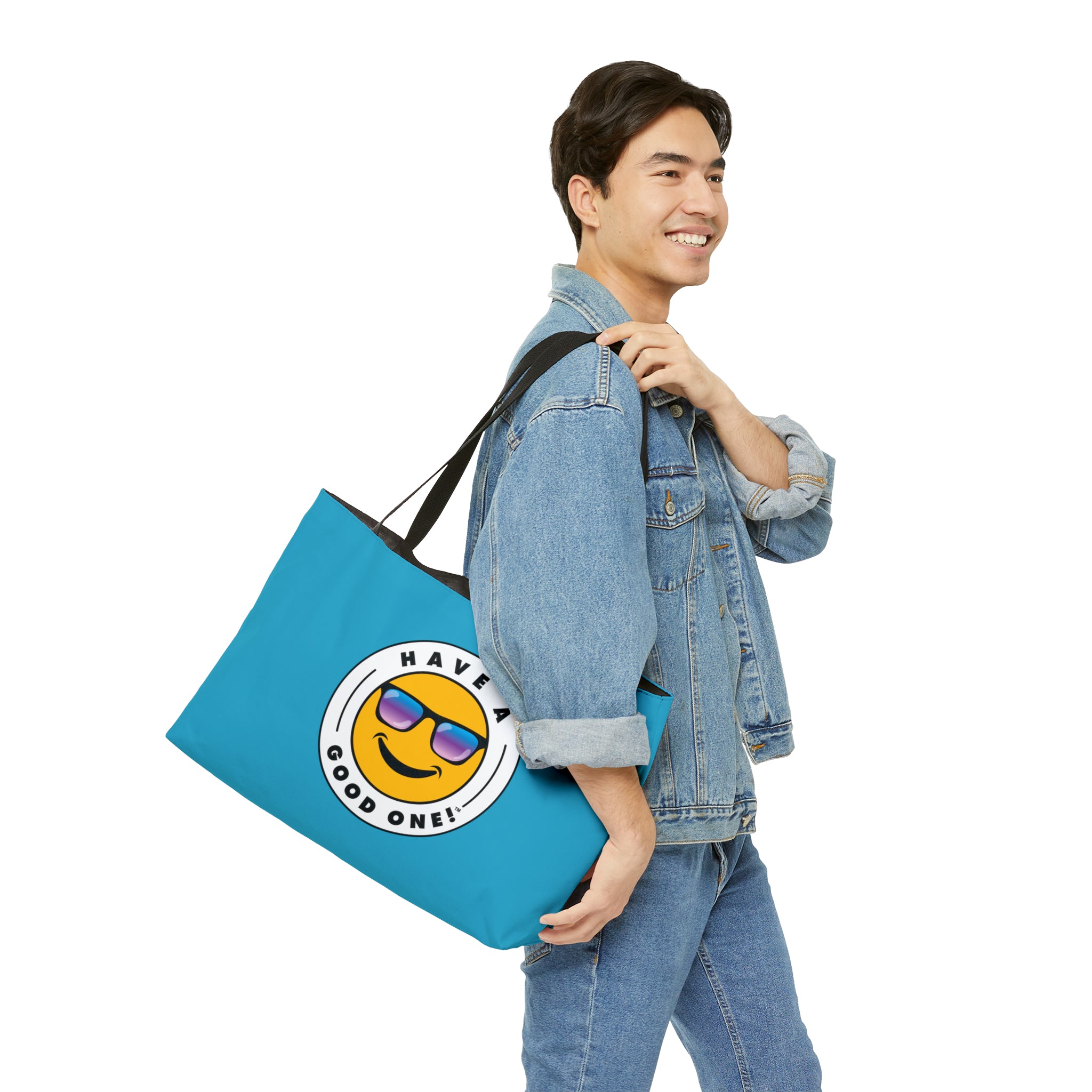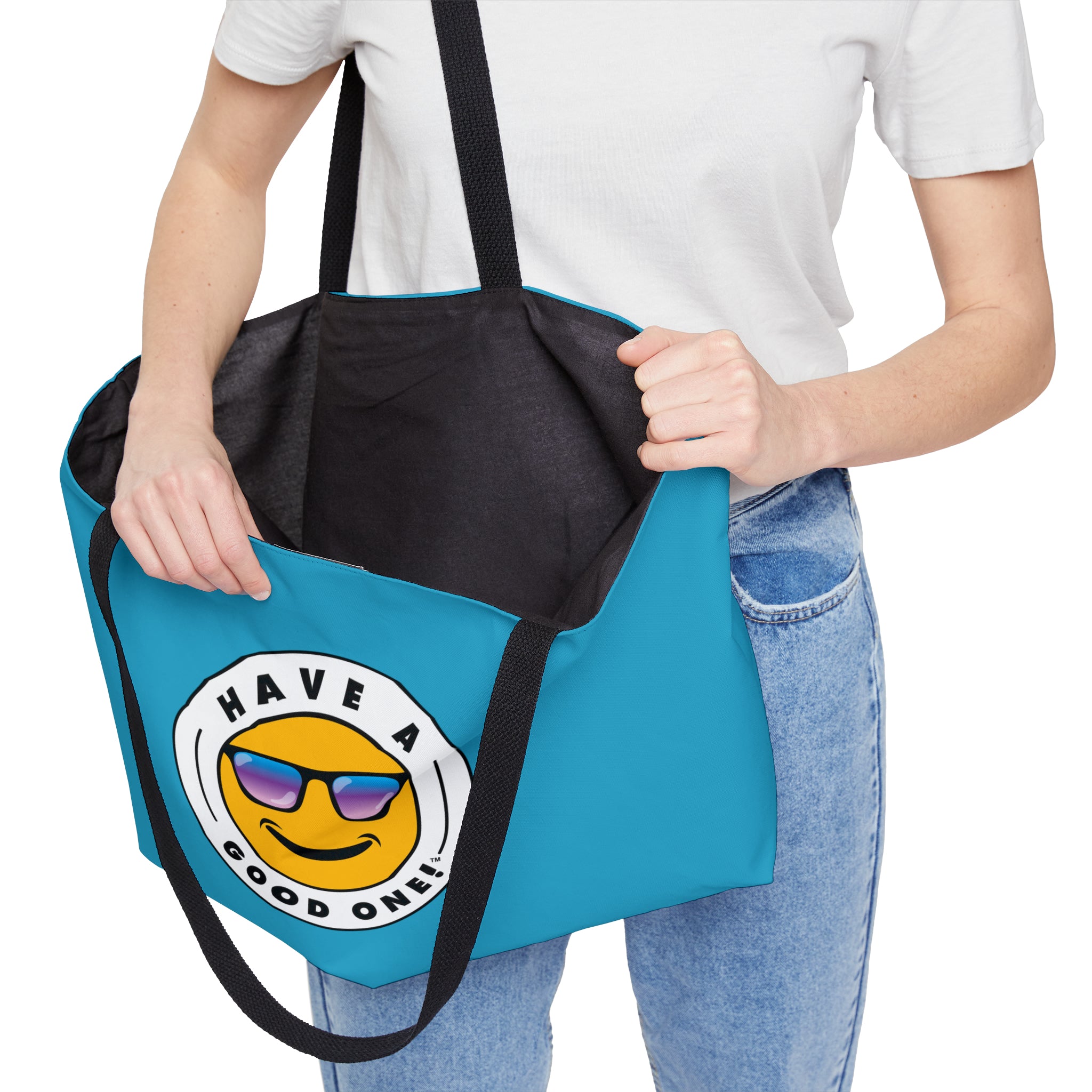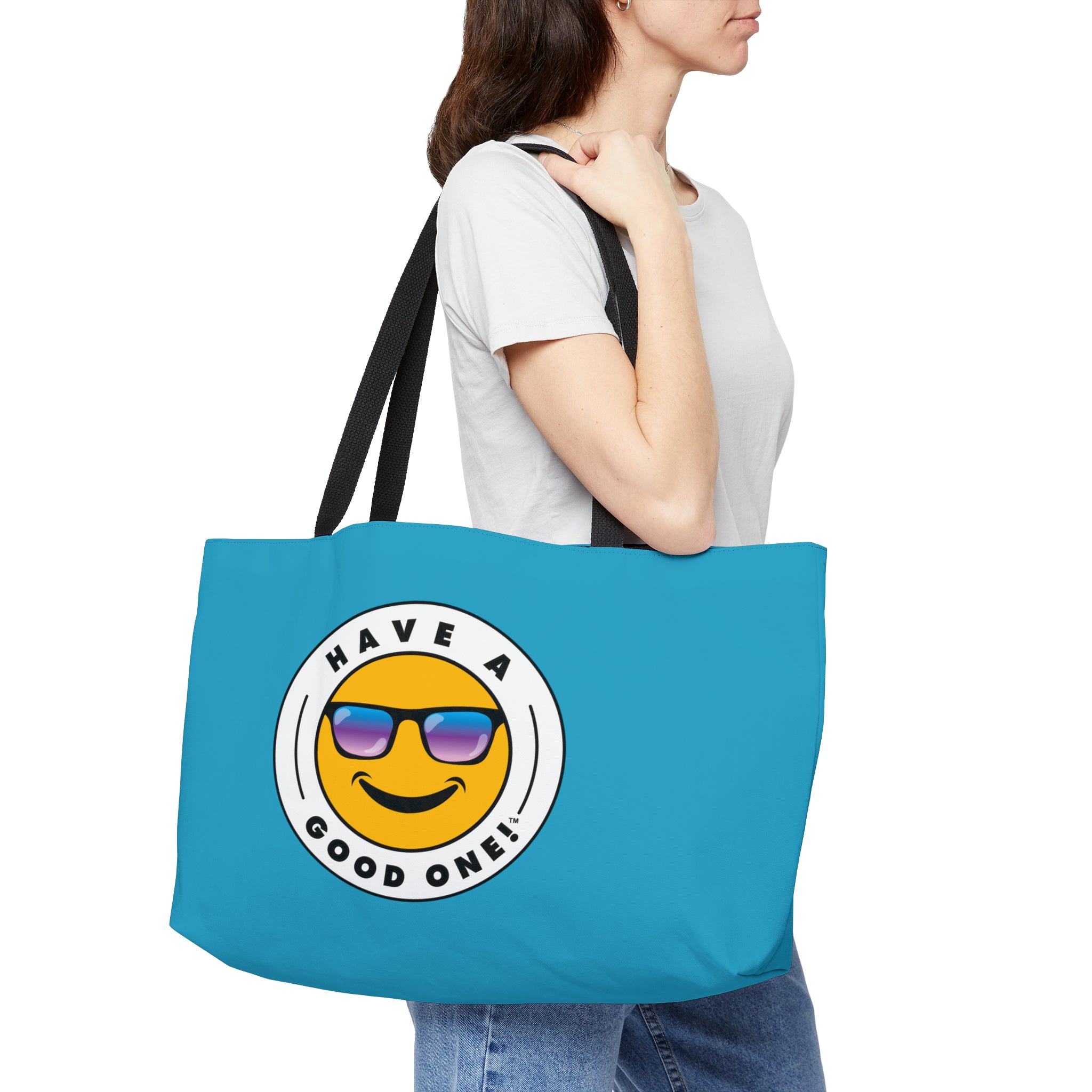 Pack up your belongings and head out to the beach, store, errands, pick up the kids up, head to the gym, travel or go just about anywhere! This versatile bag is light weight and made with very high quality craftsmanship. The logo is on the front and back. This tote bag is made from polyester so it is as durable as it is fun and fashionable. Its t-bottom construction and black handles give it a sleek, classic look. Get packing and go with the Weekender Tote Bag! Wherever you are headed this bag with make it a more memorable and special trip! We know you will Have A Good One wherever life takes you with this fun tote bag!