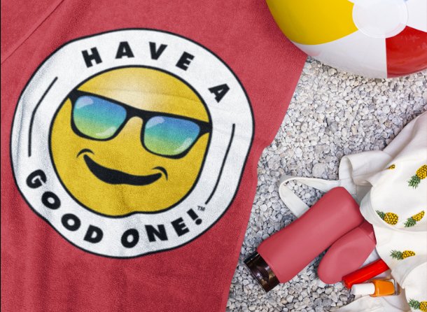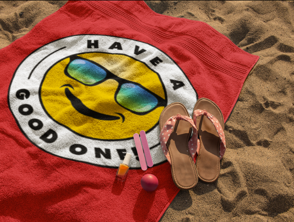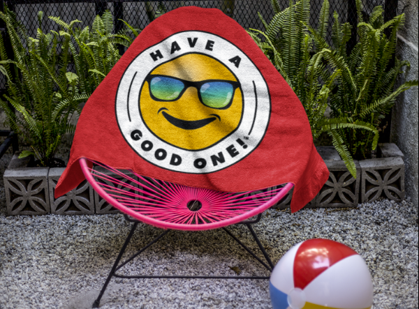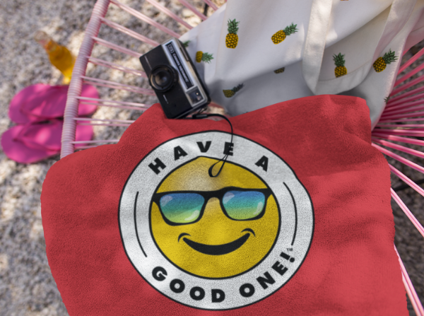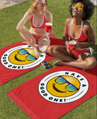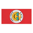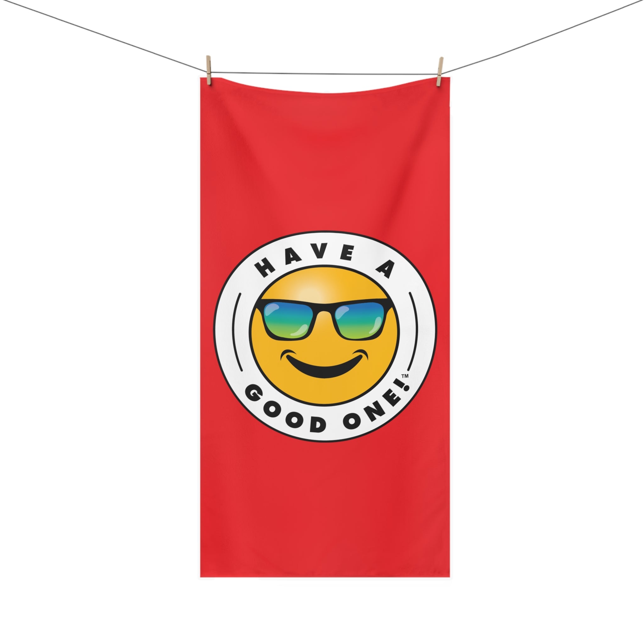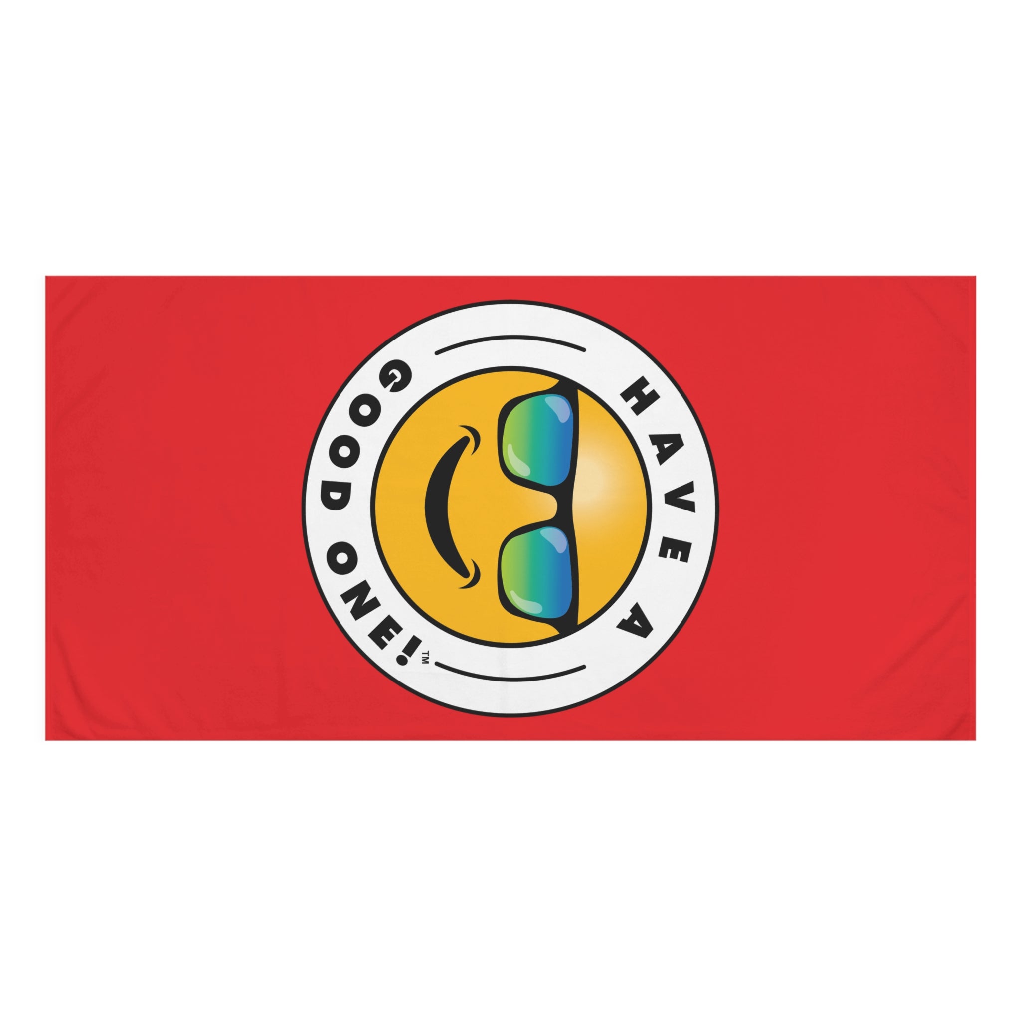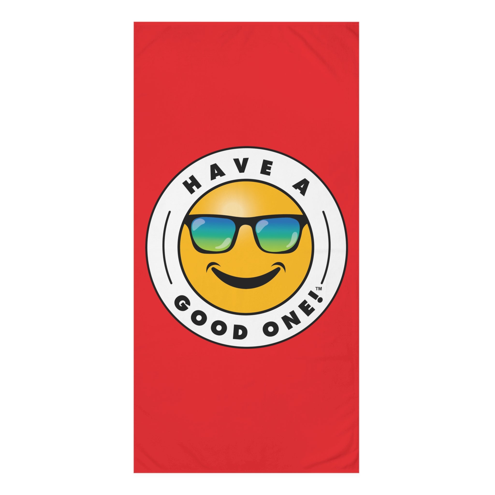 Fun Beach Towel With Have A Good One! Vibe - Red Color with Blue Green Logo